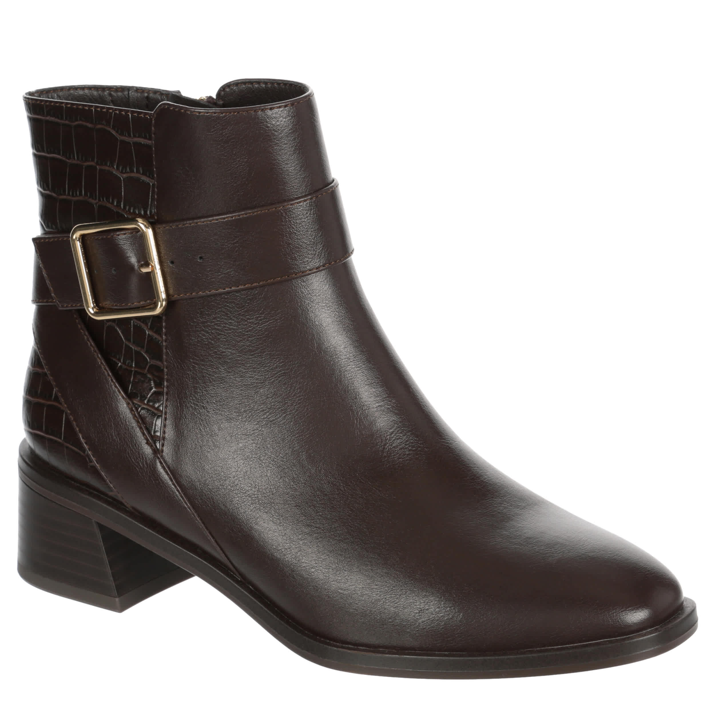 Buckle up your style with the Kennedy bootie from Michael by Michael Shannon. With a faux leather upper featuring an easy zip entry and side buckle accent, you can pair this shoe with dressy or casual outfits. The lightly padded insole provides a comfortable wearing experience while the low block heel gives you a subtle lift.