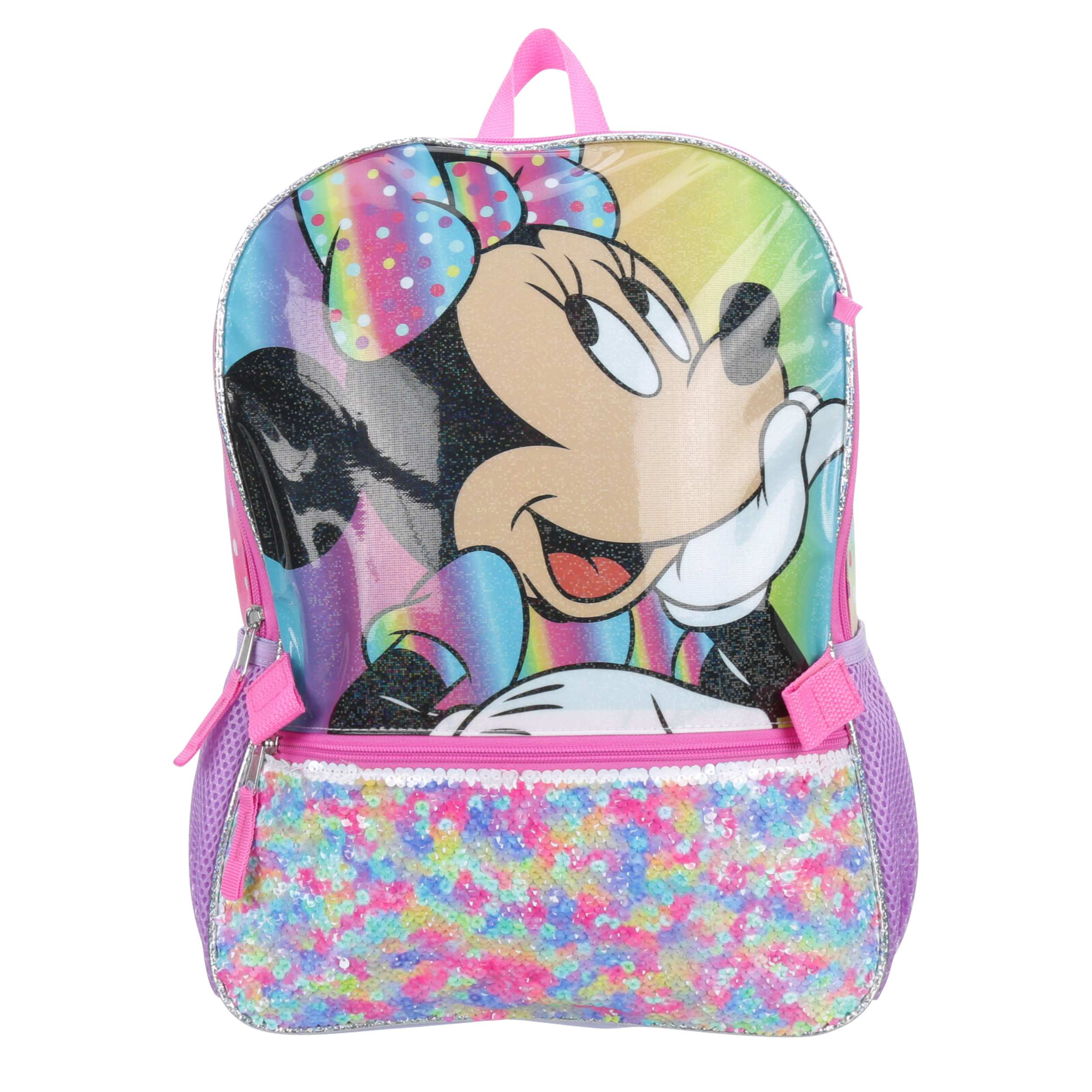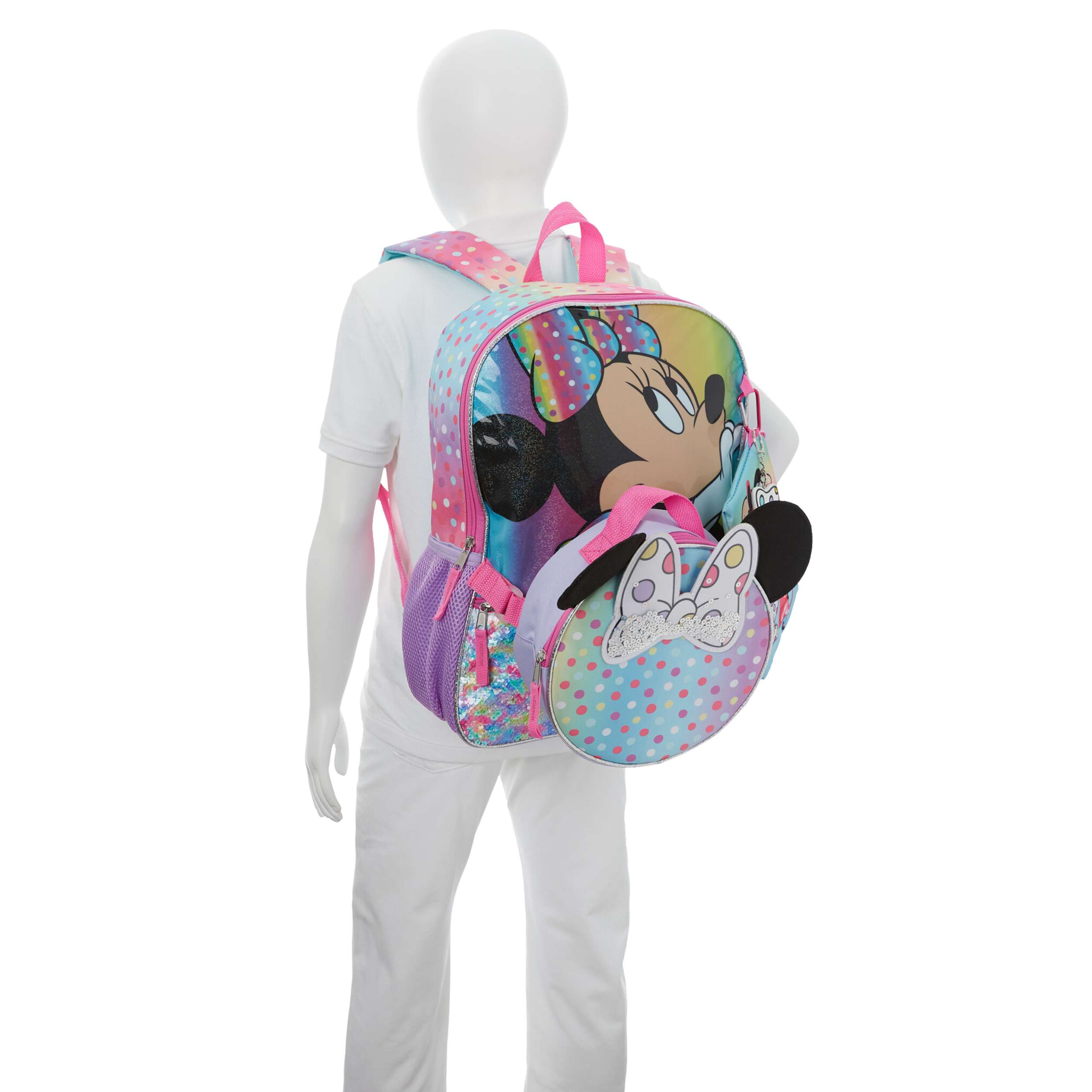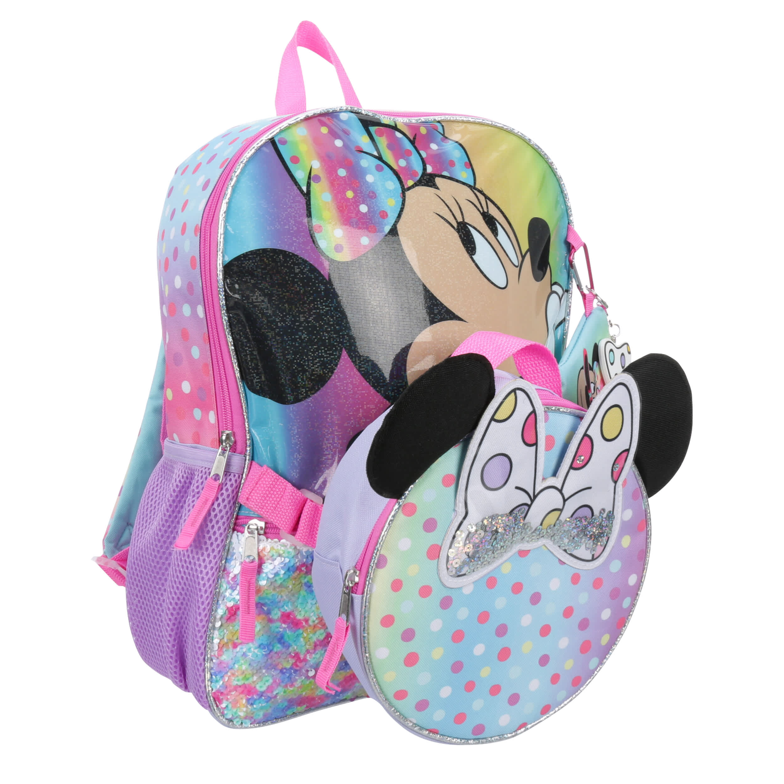 Everything looks better with a bow, especially the Minnie Mouse 5 Piece girls' backpack set. The backpack has padded shoulder straps for extra comfort and a mesh side pocket with a hook-and-loop closure to attach the lunch bag. Minnie Mouse will make all her days more fun while making sure she keeps everything close at hand.
