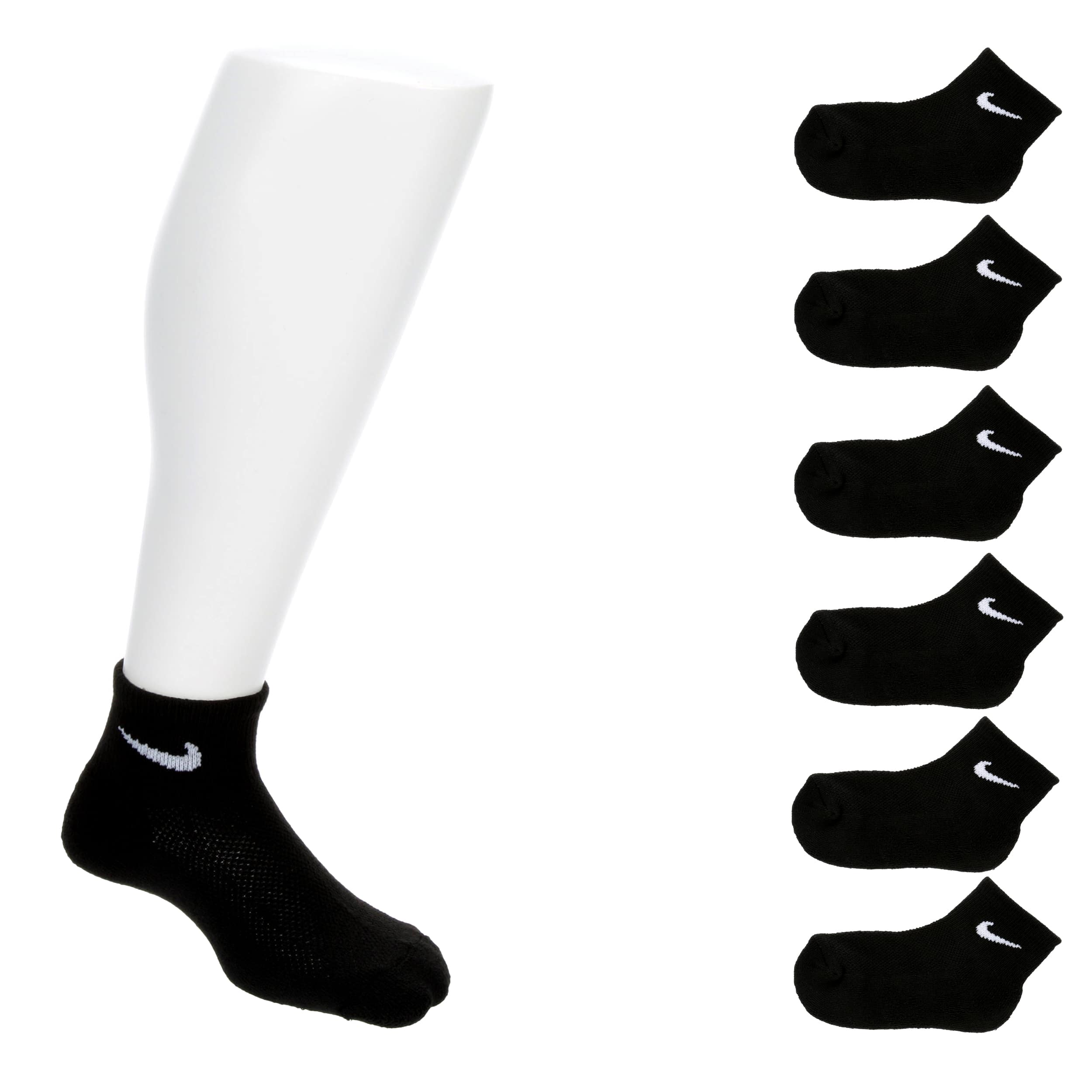 He'll play without missing a step in the Quarter Toddler boys' socks 6 Pack by Nike. Designed to keep him comfortable with a thick terry sole that absorbs impact, everyone will recognize the Nike Swoosh logo as iconic. The ribbed cuff wraps his ankle in support as he moves.