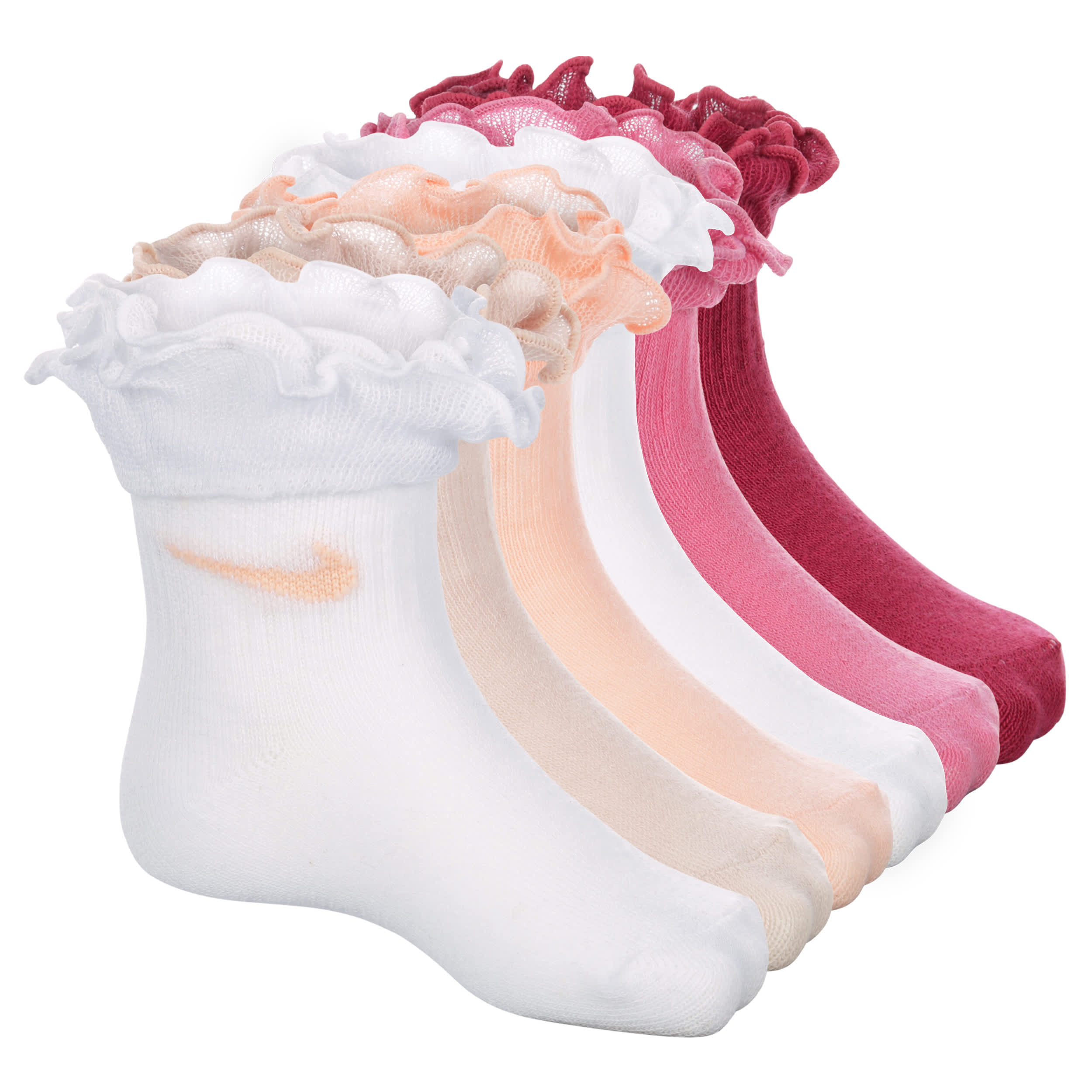 Keep your little girl looking adorable and feeling comfortable in the Nike Infant Girls' Ruffle Quarter Socks 6-Pack. Crafted from soft, gentle fabric, these socks are perfect for delicate feet. The playful ruffle trim adds a touch of sweetness, while the durable construction ensures they'll withstand playtime adventures. Pair them with her favorite shoes for a complete and stylish look.