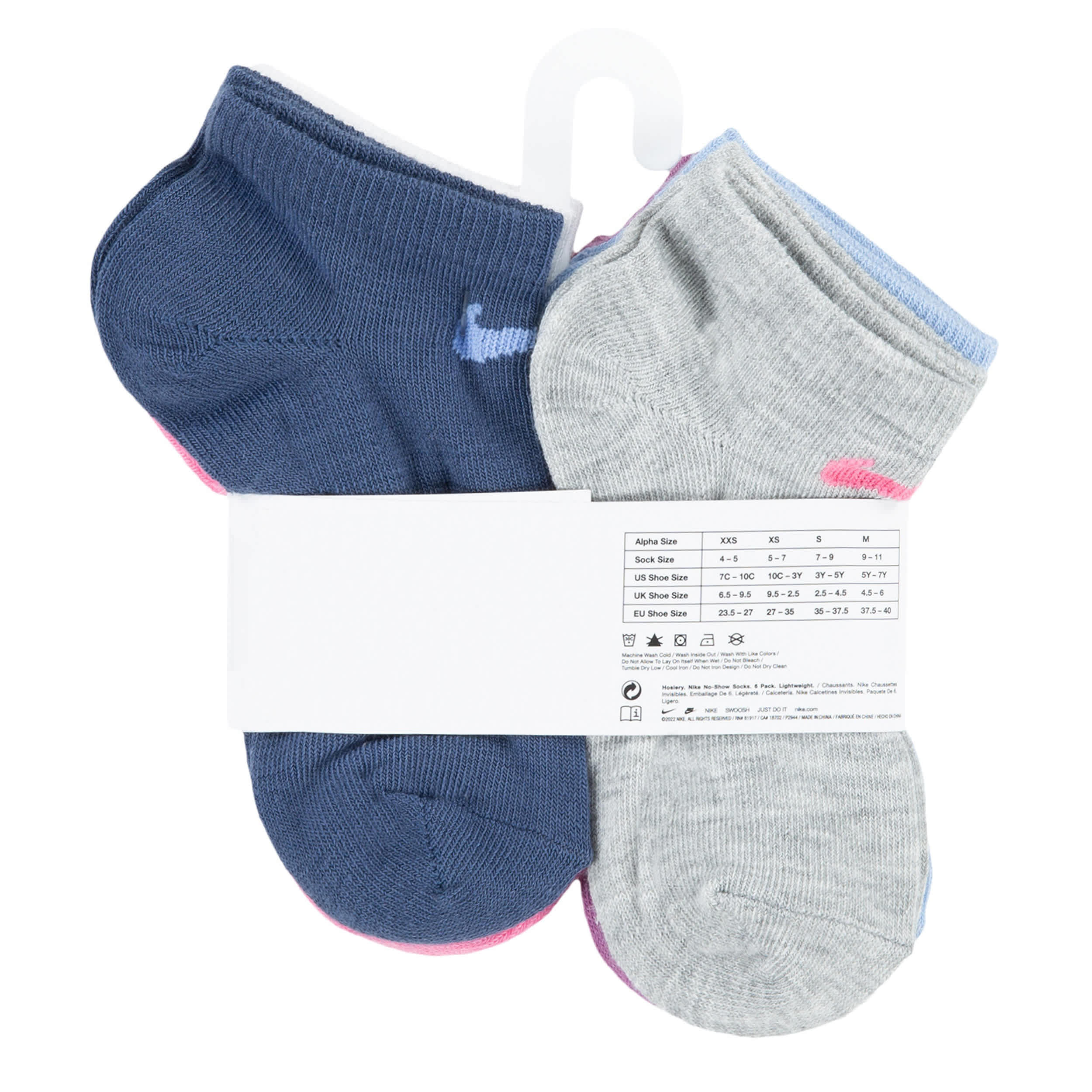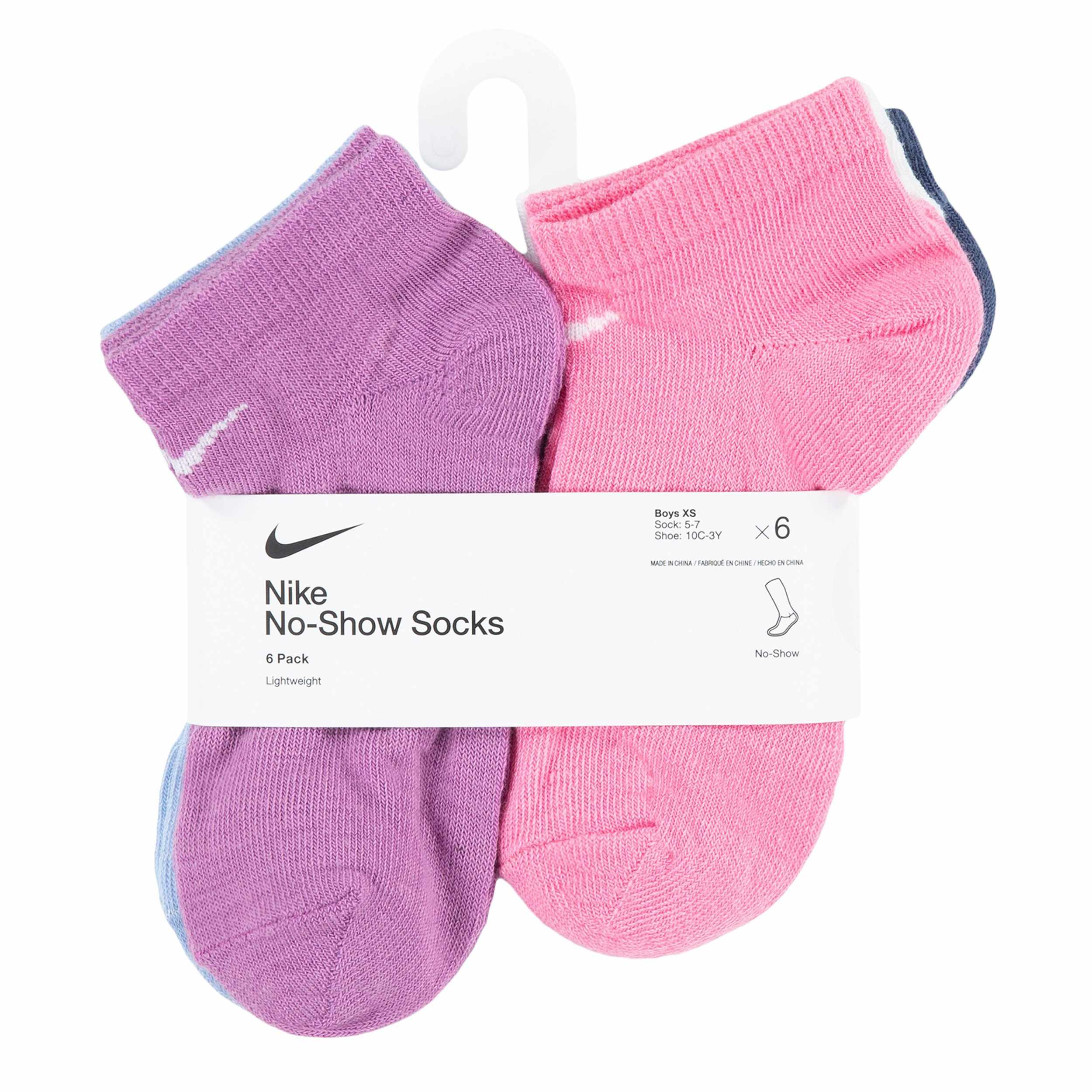 School or play, the Nike XS No Show socks 6 pack has her covered. With a ribbed cuff for a secure fit, this sock stays put as long as she needs to get through the day, comfortably. The thick terry sole provides impact cushioning that supports her movements for better performance.