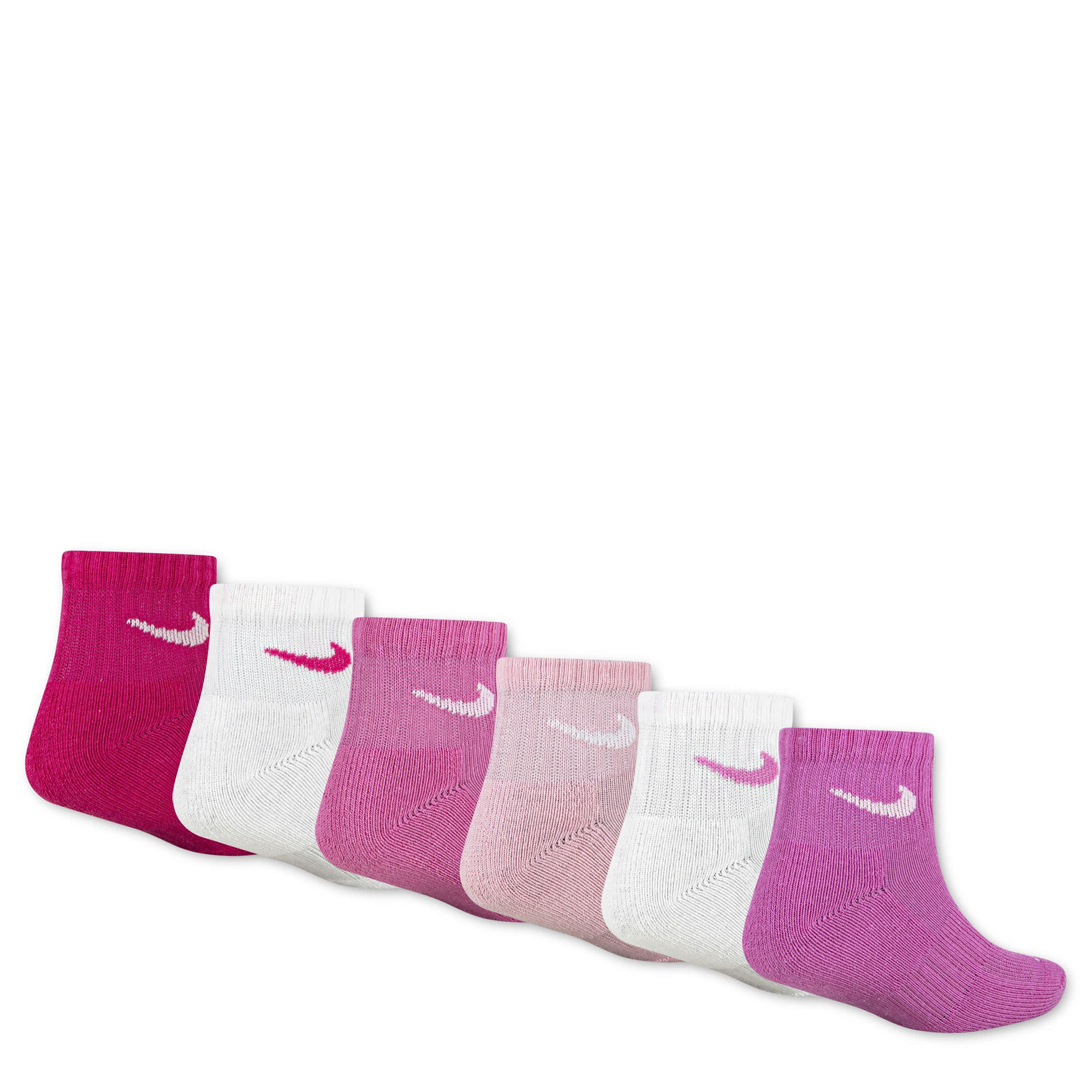 Equip your little explorer for adventure with the Nike Extra Extra Small Girls' Quarter Socks 6-Pack. Crafted from soft, breathable fabric, these socks ensure all-day comfort. Featuring the iconic Nike Swoosh logo, they add a touch of sporty style to any outfit. Pair them with her favorite Nike sneakers for a head-to-toe look that's both comfortable and cool.