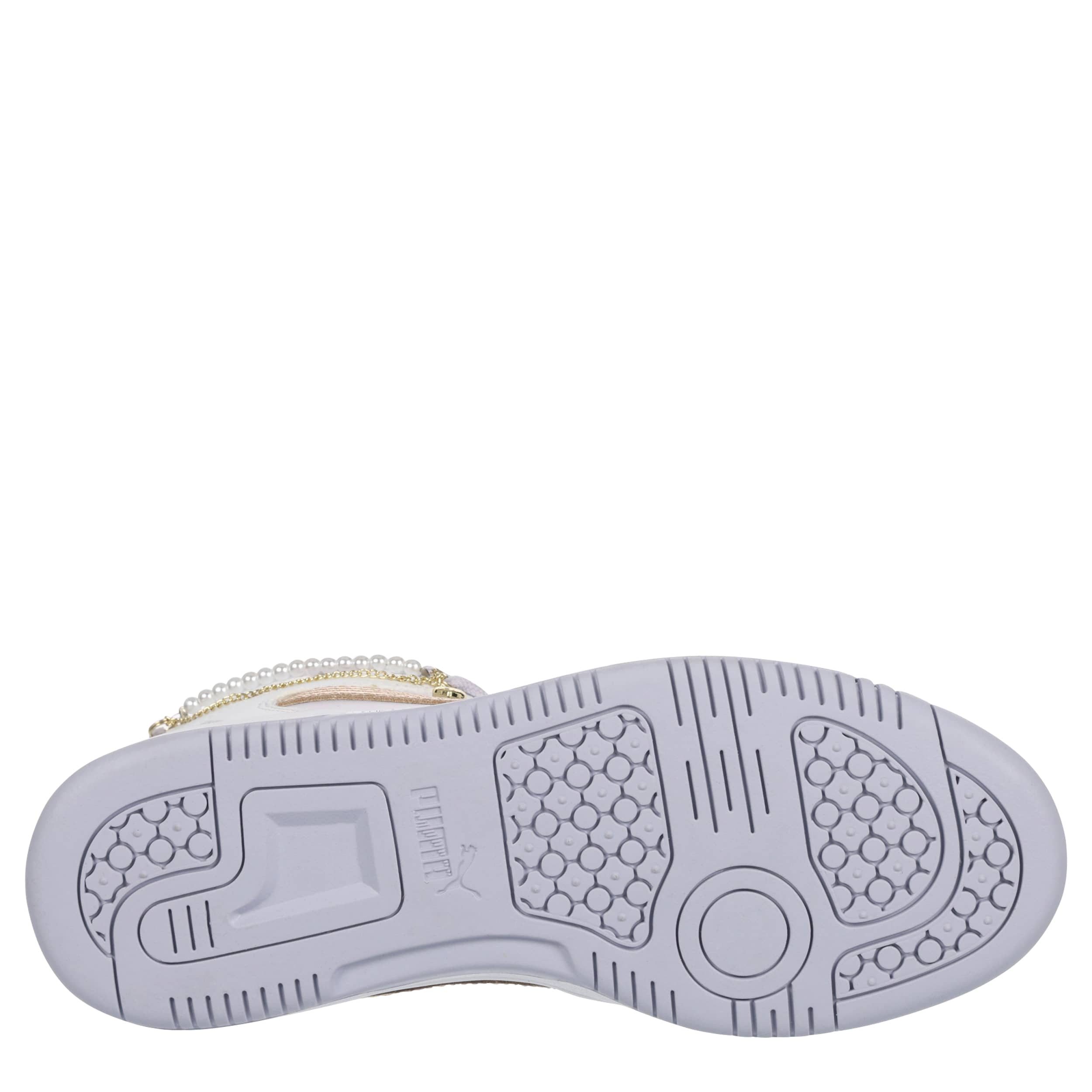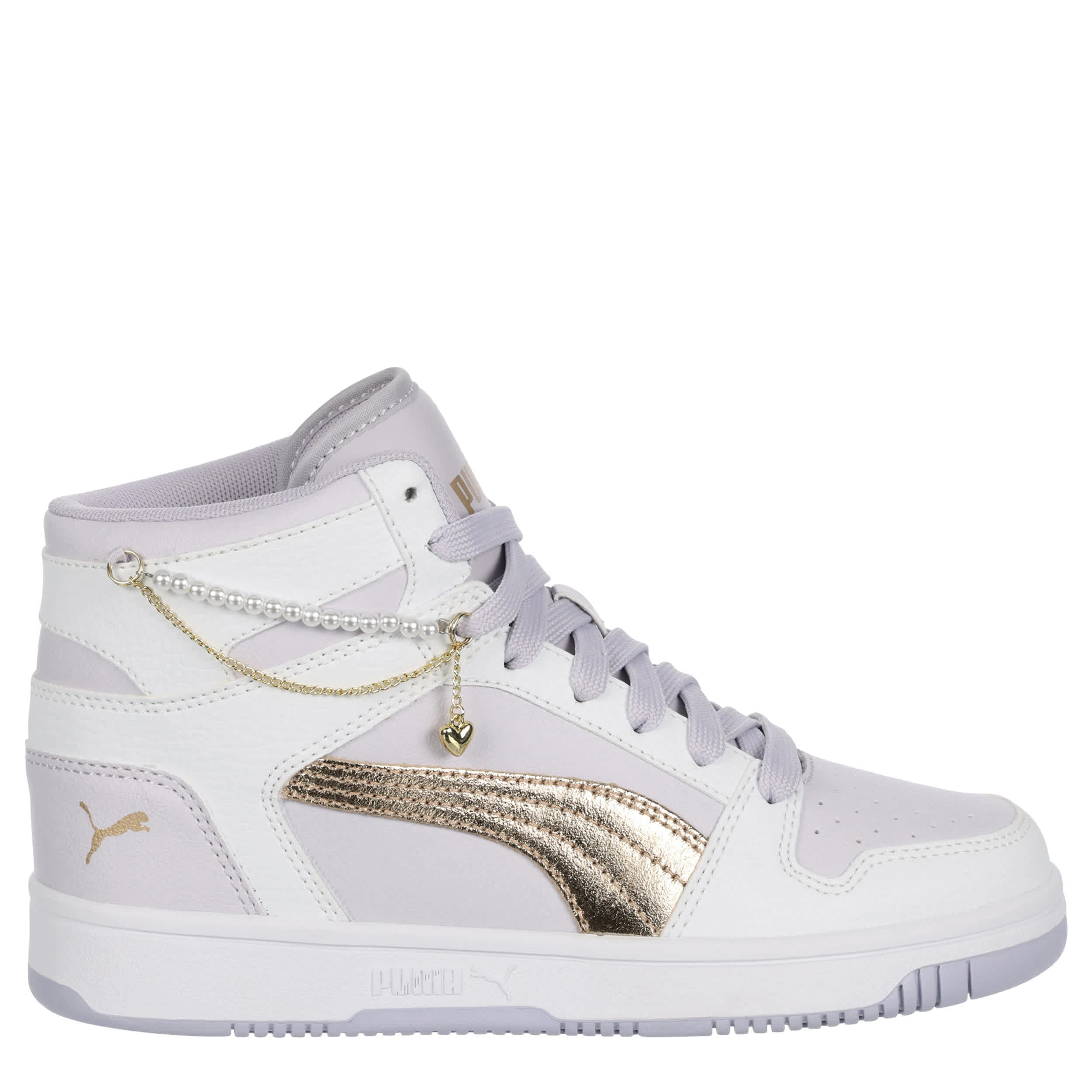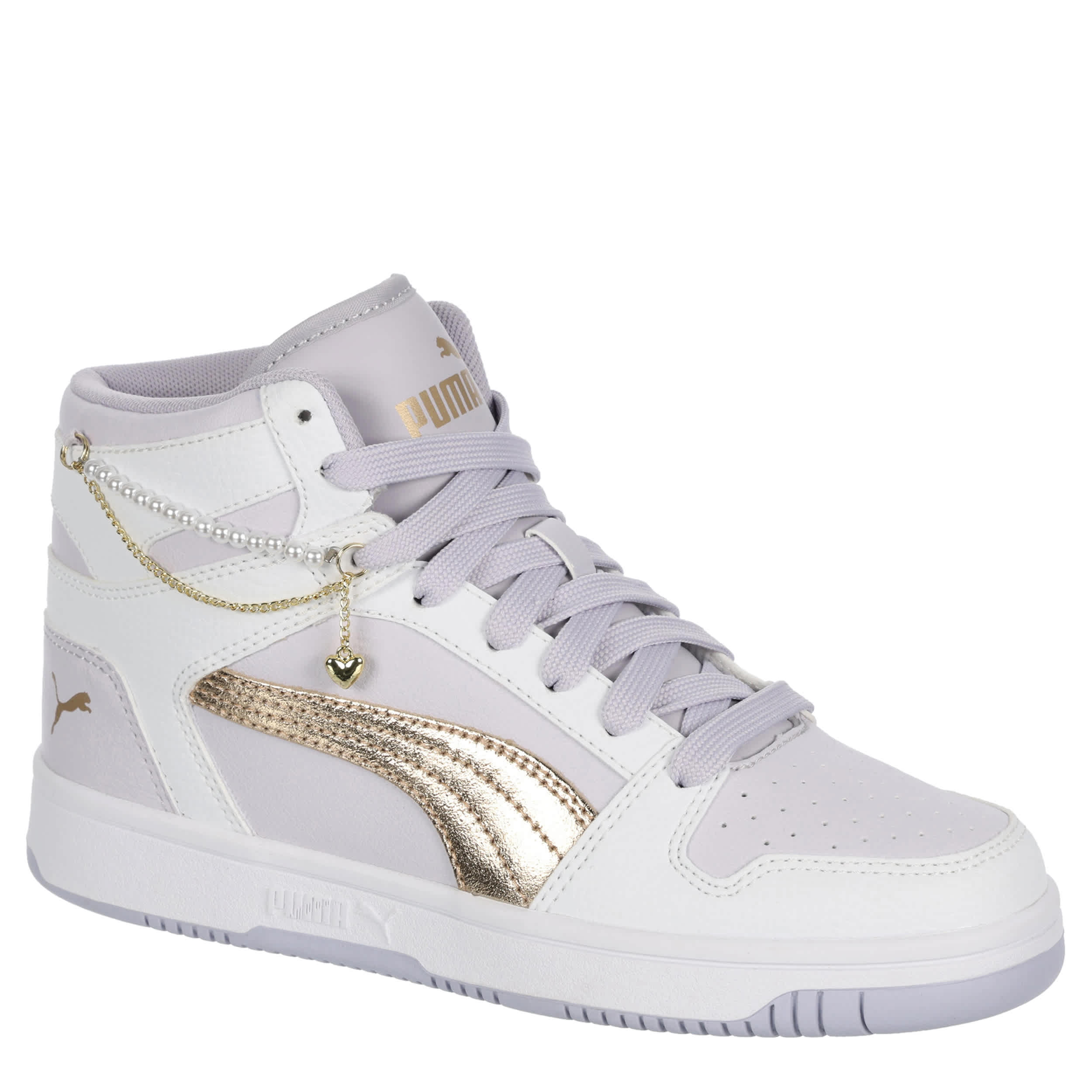 Get a look worth bragging about with the Rebound LayUp Bling Heart girls' sneaker by PUMA. With a faux leather upper featuring beaded pearl & dangle heart lace chains as well as a padded collar & tongue for comfort, this shoe also has the classic PUMA Formstrip. The SoftFoam+ sockliner cushions her foot, while the gum outsole provides exceptional grip.