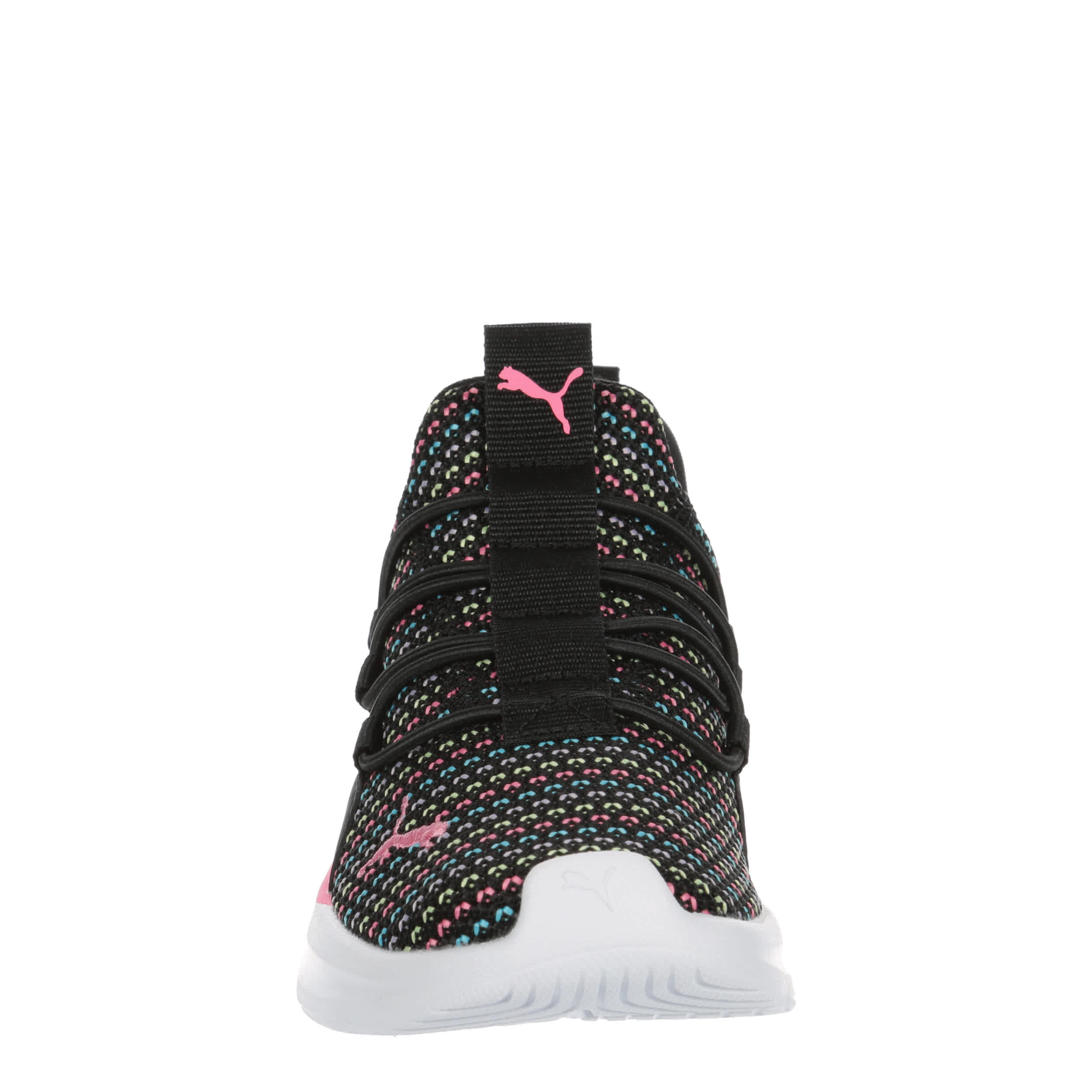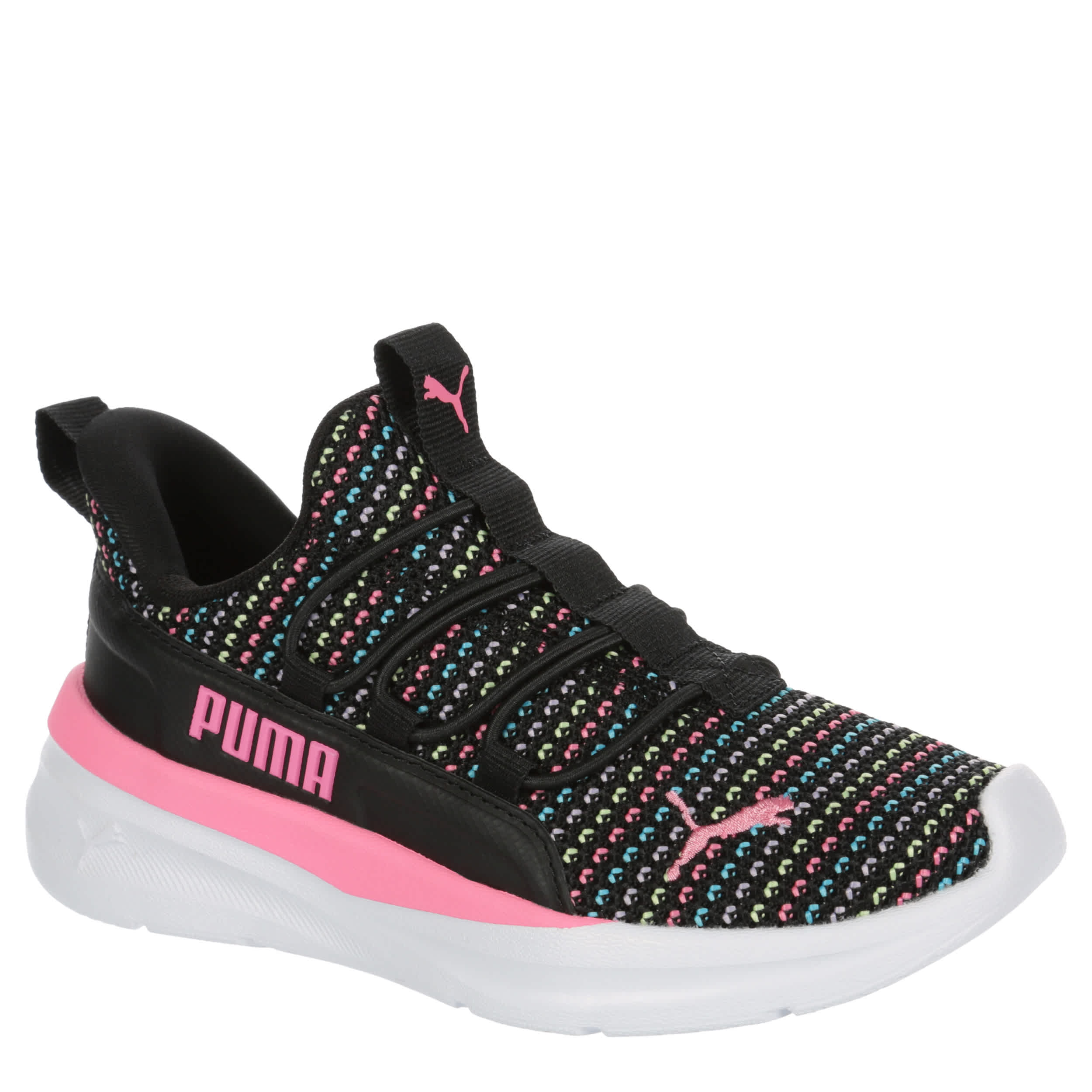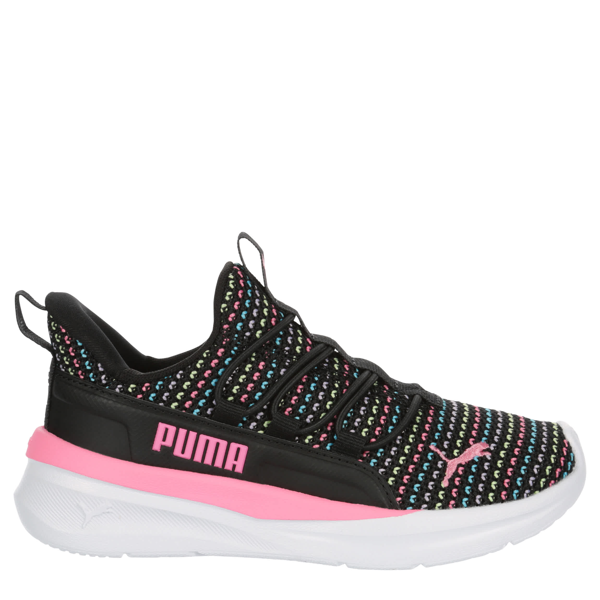 Extra cool and comfy in the PUMA Softride One4All 2.0 Multi Knit girls' sneaker. With a mesh & synthetic upper featuring dual pull tabs and a padded collar, this slip-on has a fun design. The ultra lightweight PUMALite midsole cushions every step, while the outsole offers bouncy traction.