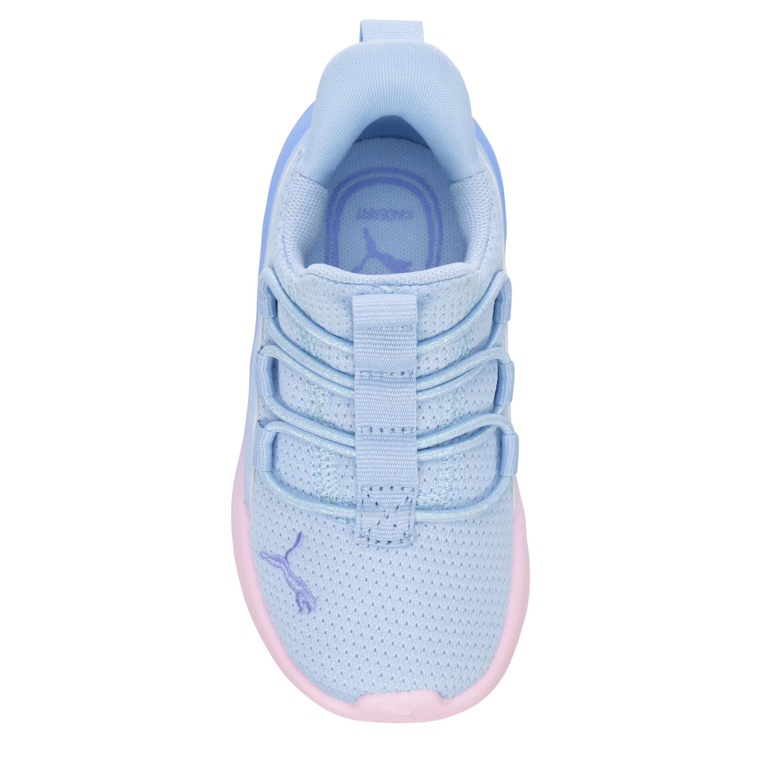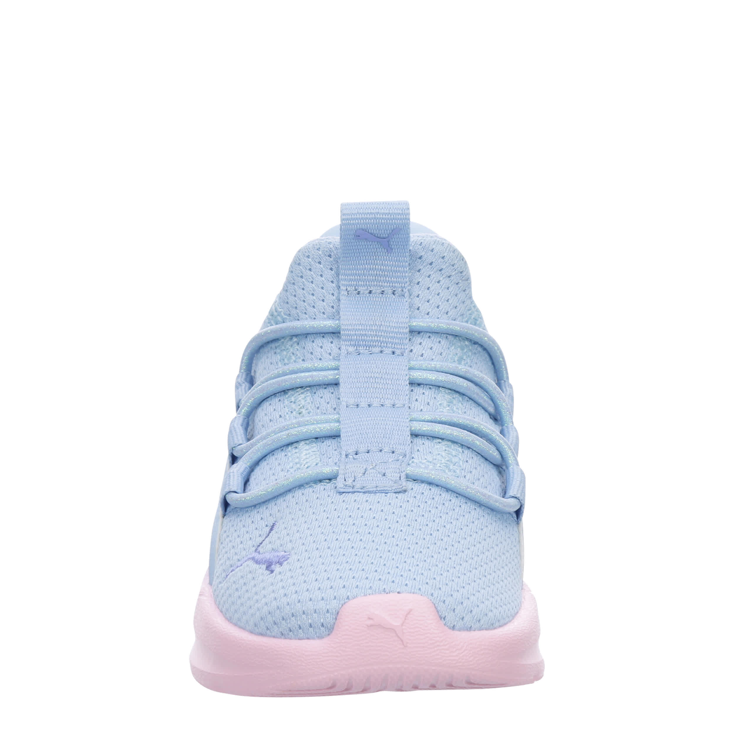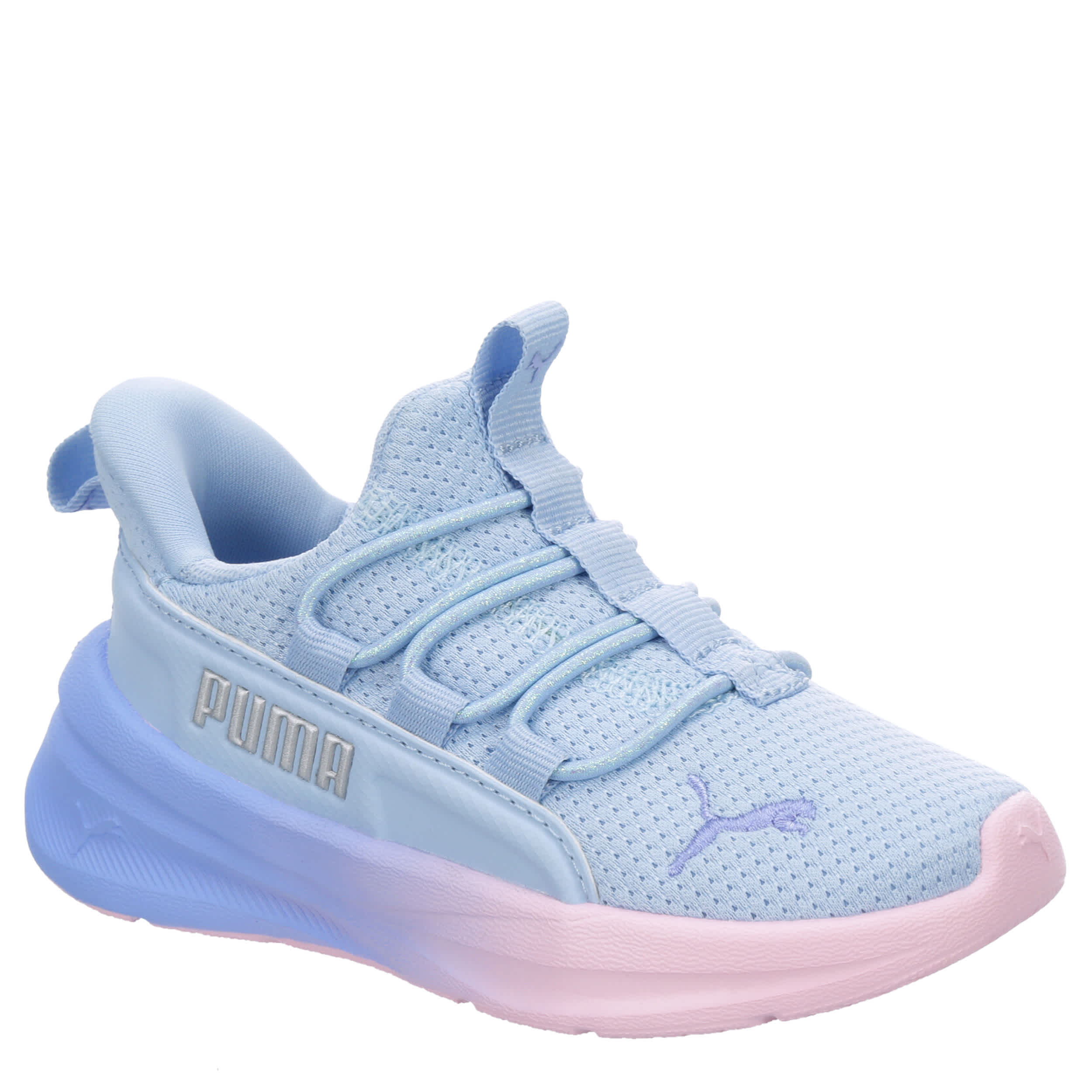 Extra cool and comfy in the PUMA Softride One4All 2.0 Glitter infant girls' sneaker. With a mesh & synthetic upper featuring dual pull tabs and a padded collar, this slip-on has a fun design. The ultra lightweight PUMALite midsole cushions every little step, while the outsole offers bouncy traction.