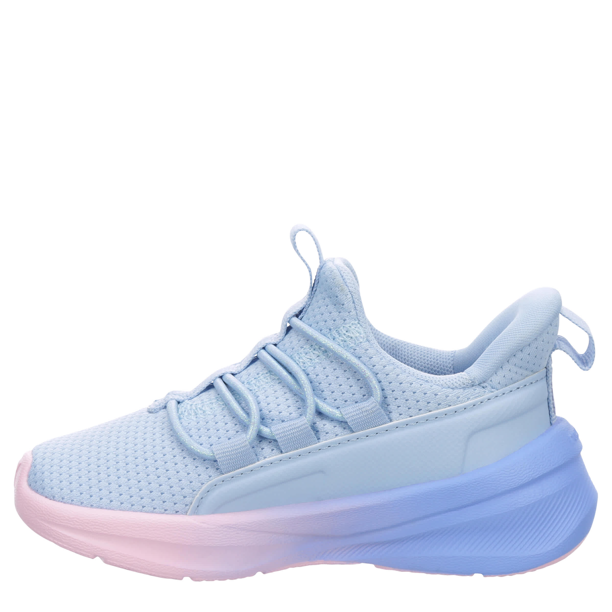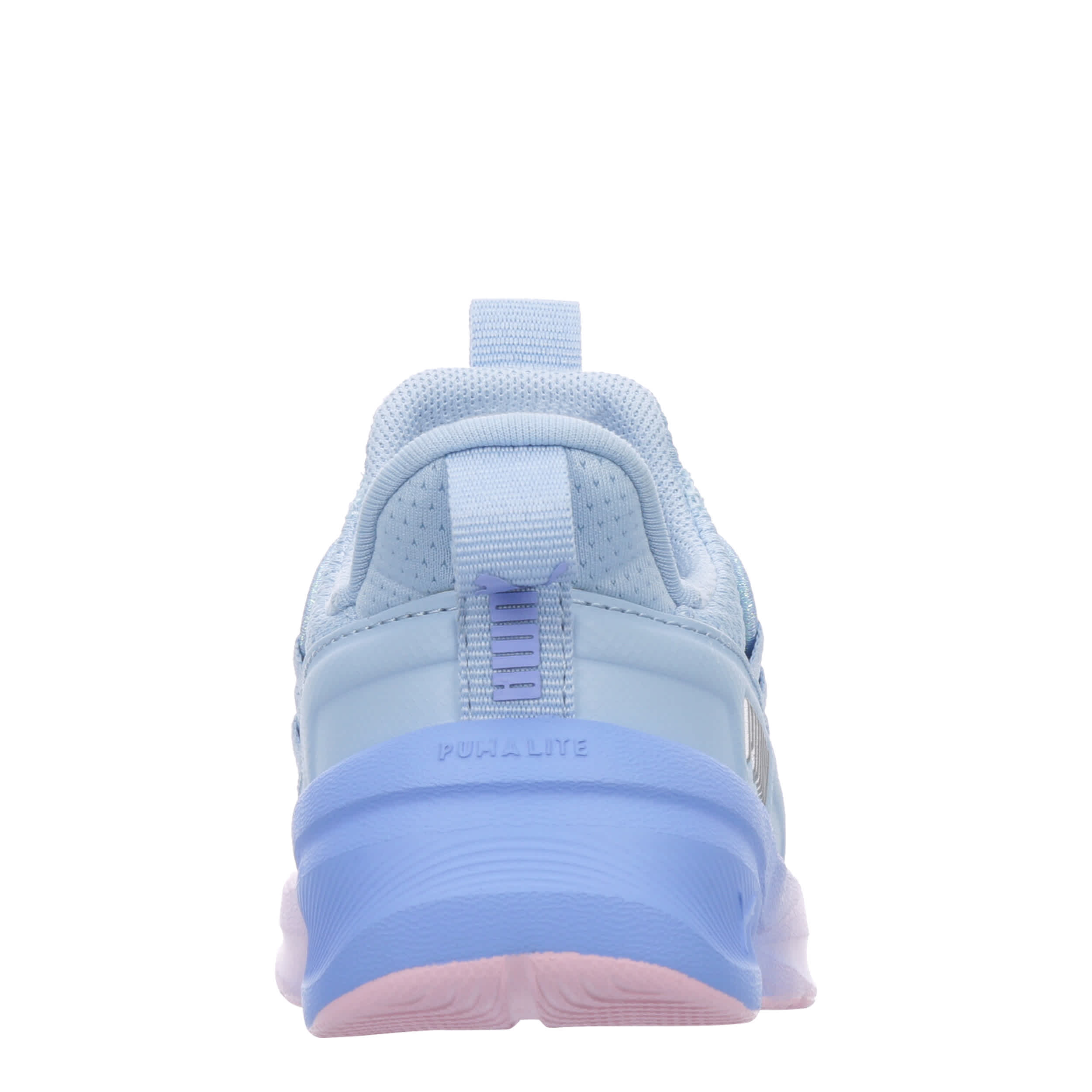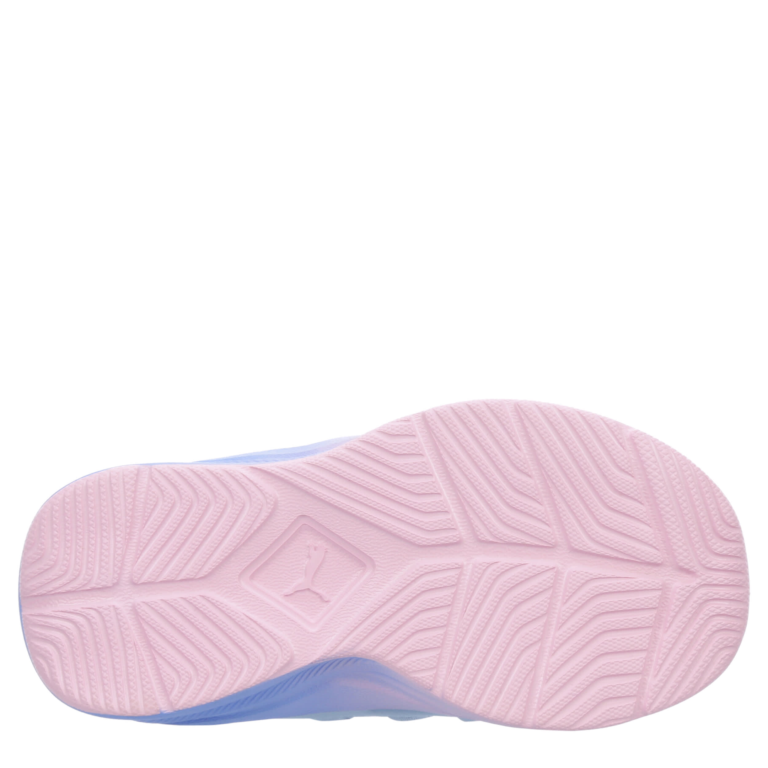 Extra cool and comfy in the PUMA Softride One4All 2.0 Glitter infant girls' sneaker. With a mesh & synthetic upper featuring dual pull tabs and a padded collar, this slip-on has a fun design. The ultra lightweight PUMALite midsole cushions every little step, while the outsole offers bouncy traction.