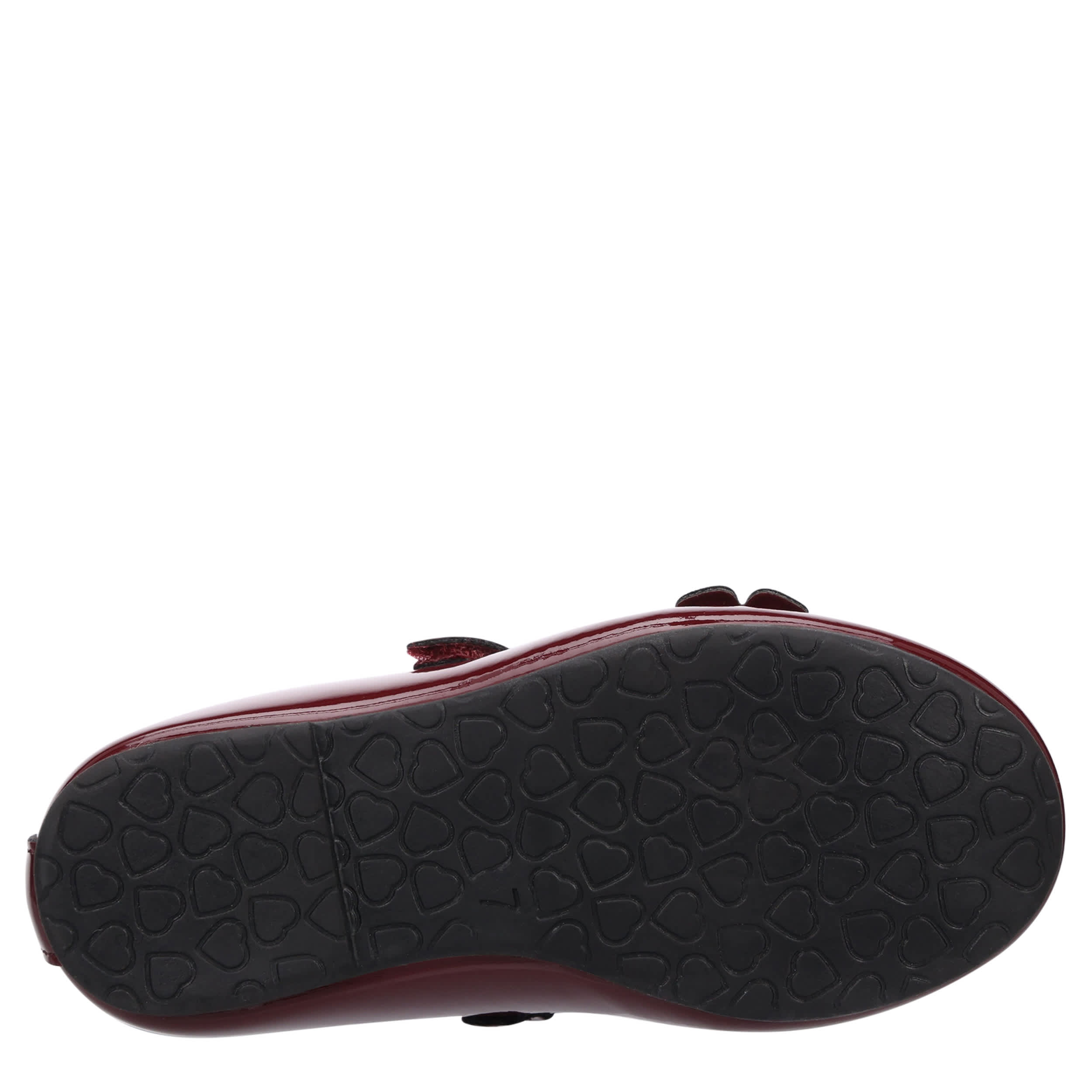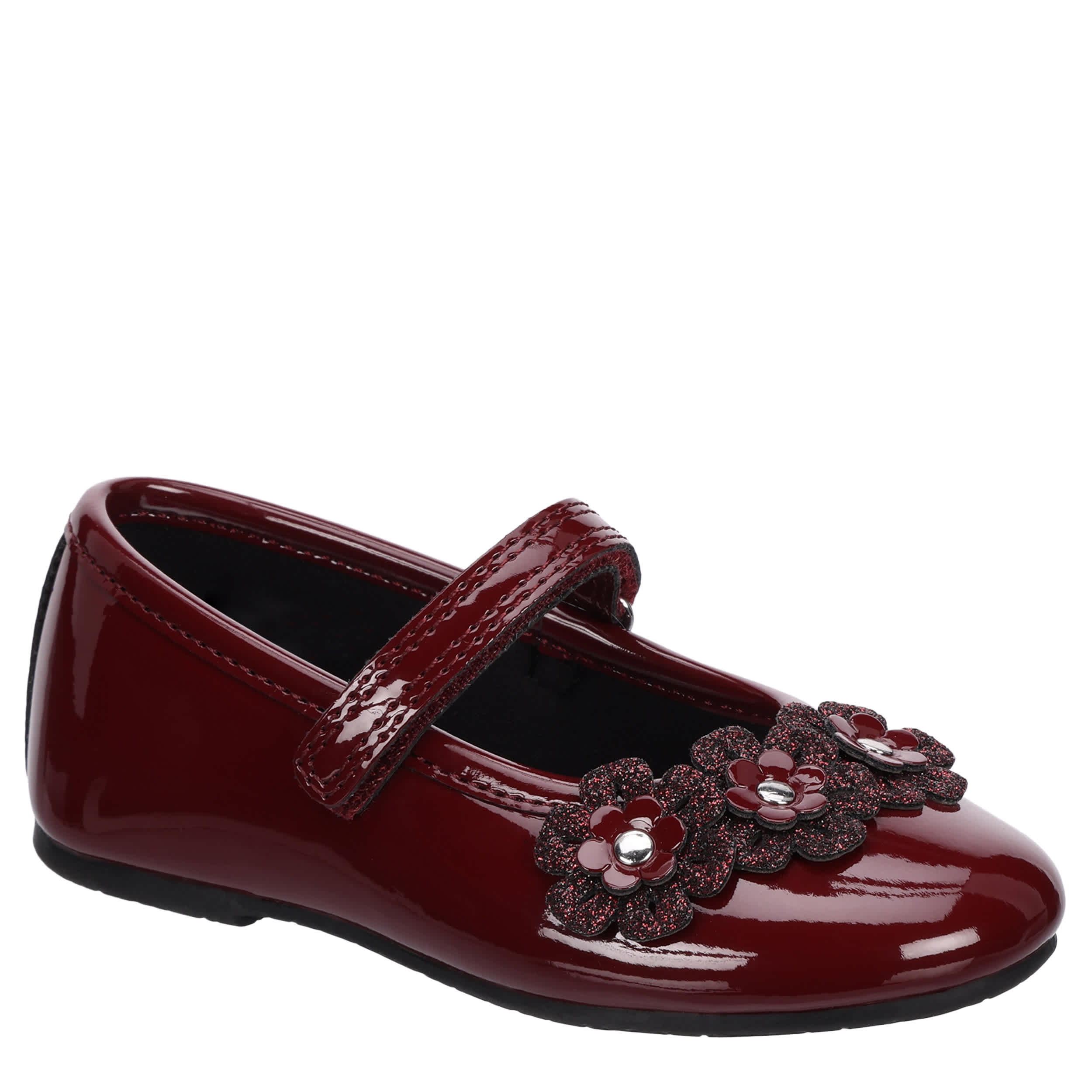 Keep your kid looking sharp in the Lil Abelina infant girls' dress shoe from Rachel Shoes. Featuring a glossy patent leather upper with a glittery, studded floral details on the vamp, this ballet flat has an easy-on halo strap. The insole soothes her little foot, while the outsole maintains her comfort.