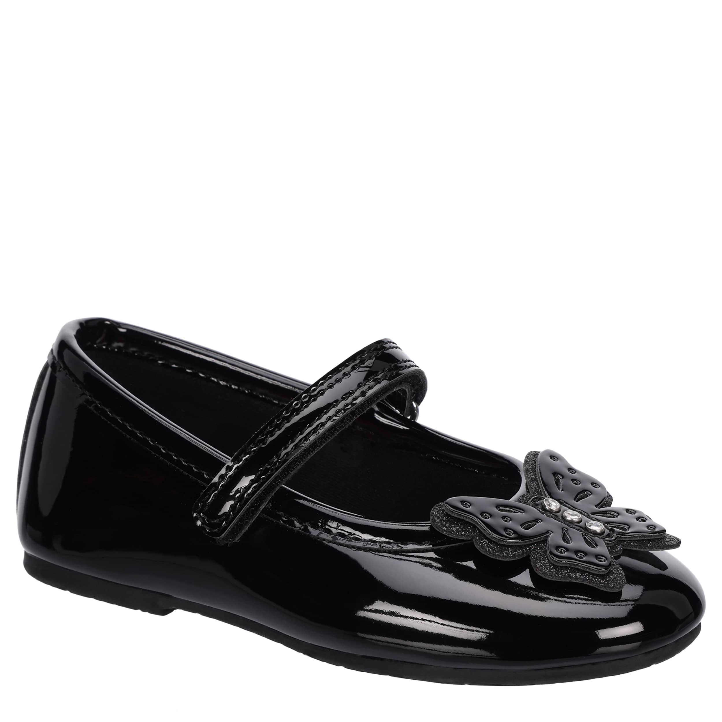 She'll shine and fly in the Lil Kaelynn infant girls' dress shoe from Rachel Shoes. Featuring a glossy patent leather upper with a butterfly detail on the vamp, this Mary Jane really is charming. The insole soothes her little foot, while the durable sole maintains her comfort.