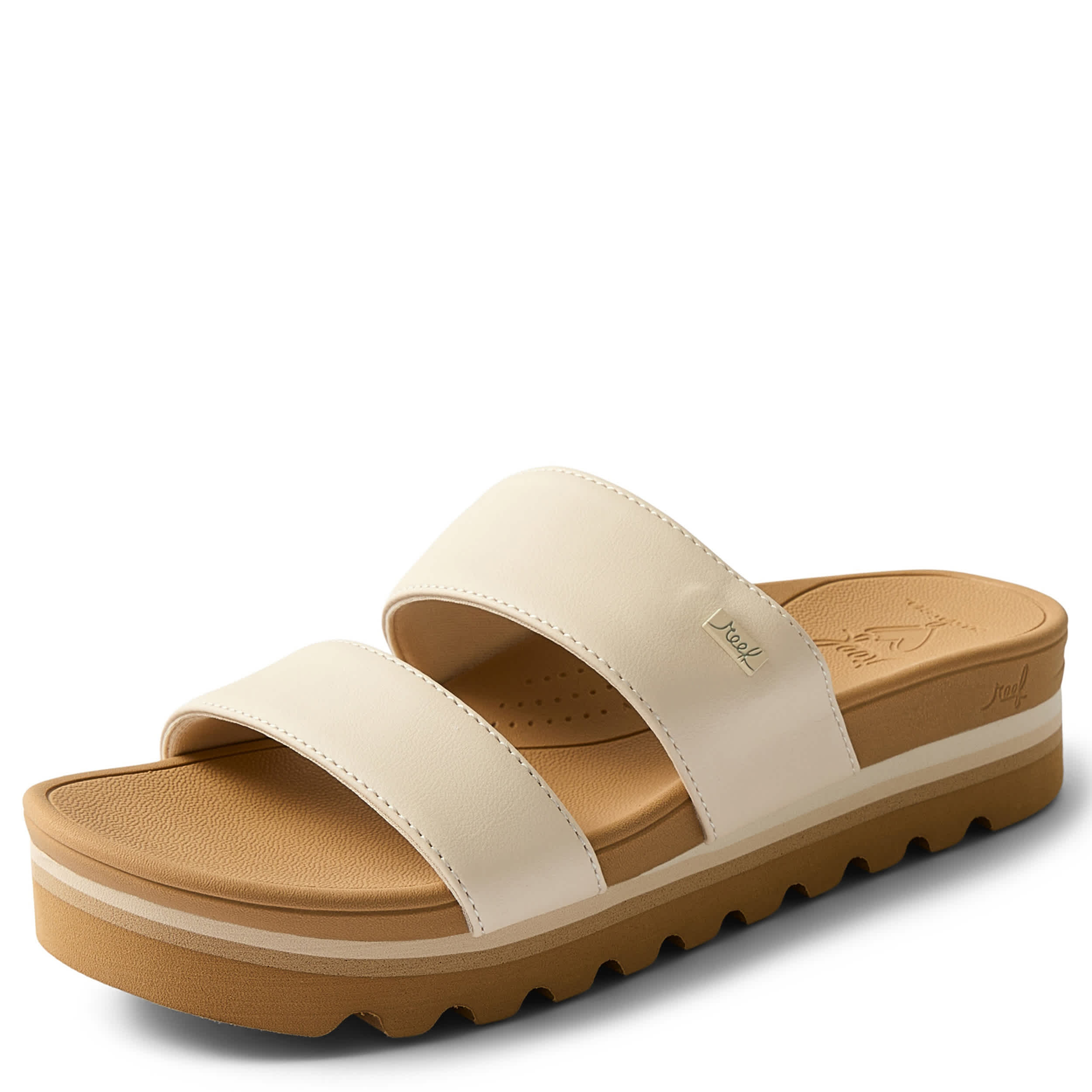 Show off your sunny style in the Reef Banded Horizon women's slide sandal. With a vegan leather banded upper and fabric lining to soothe your foot, these sandals are cute, so grab 'em for next summer. The Anatomic Arch footbed and EVA traction outsole support your instep while providing comfort with each step.