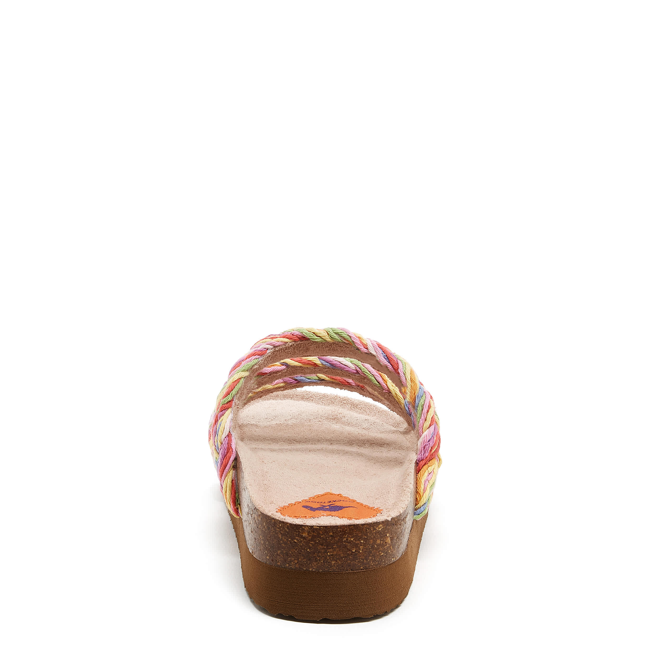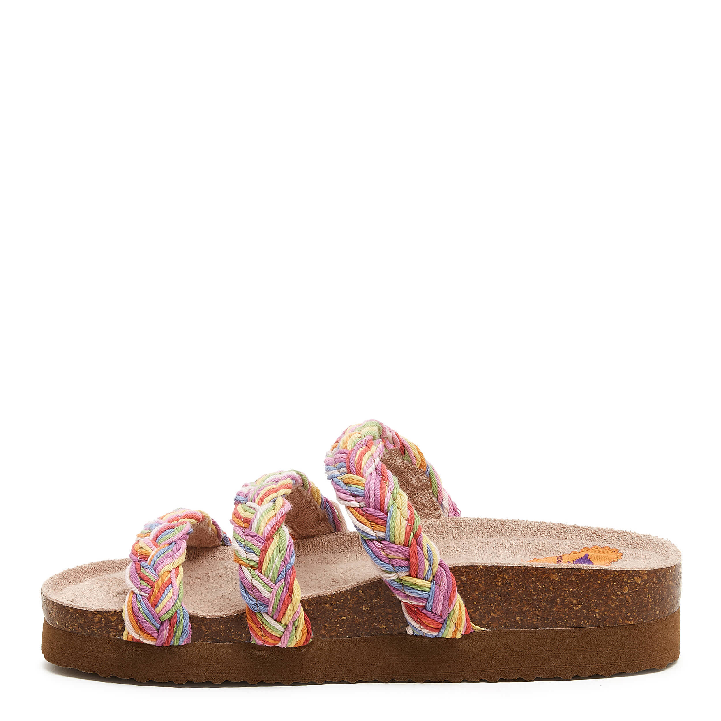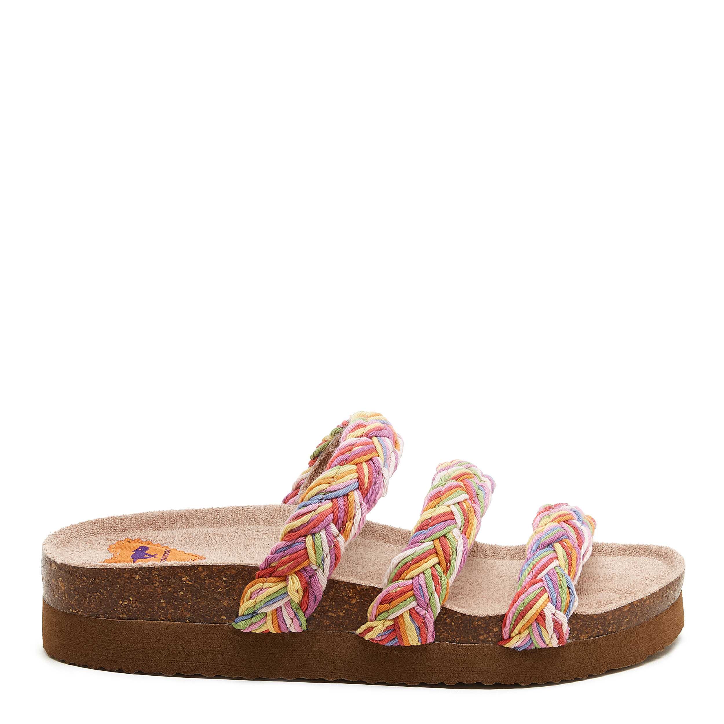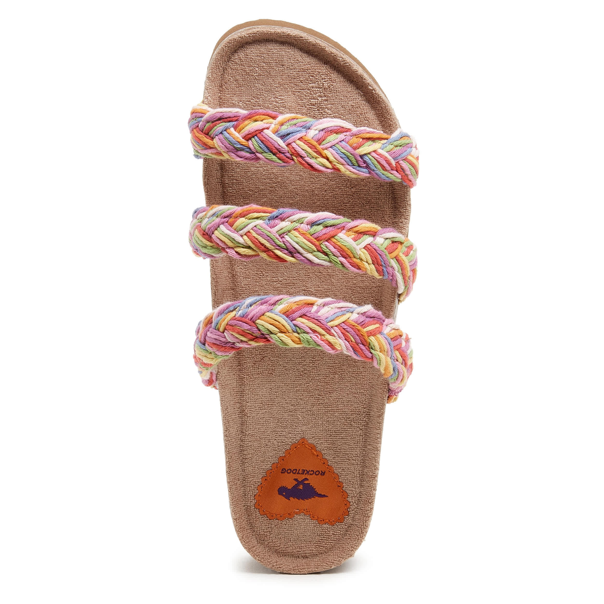 Loaf around home or head to the beach in the Ashley women's footbed sandal from Rocket Dog. With a braided cotton upper and cushy terry cloth lining, this triple-strapped sandal fits snug. The molded footbed and slight platform lifts your foot, while the natural EVA outsole is durable.