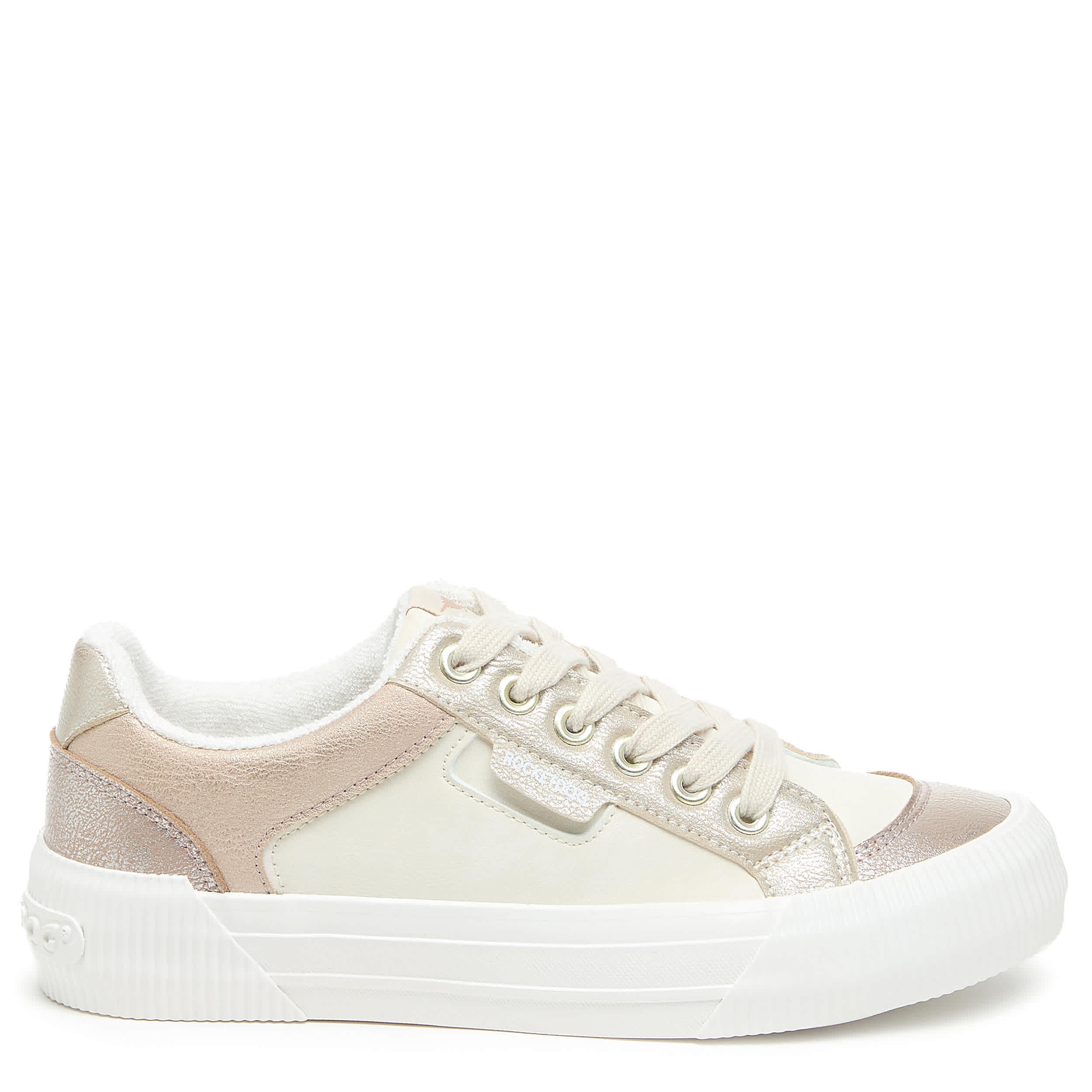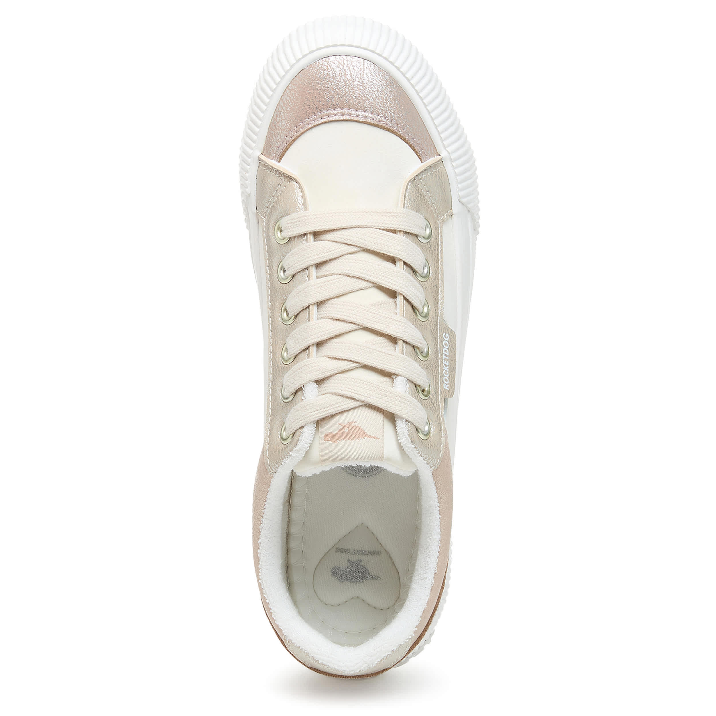 Don't leave home without that pep in your step with the Cheery Bronze Color Block women's sneaker from Rocket Dog. Featuring a colorblock upper with off white laces for a timeless look, this platform shoe offers a 1¼" boost. The Plush Foam Comfort insole cushions, while the textured outsole adds some traction.