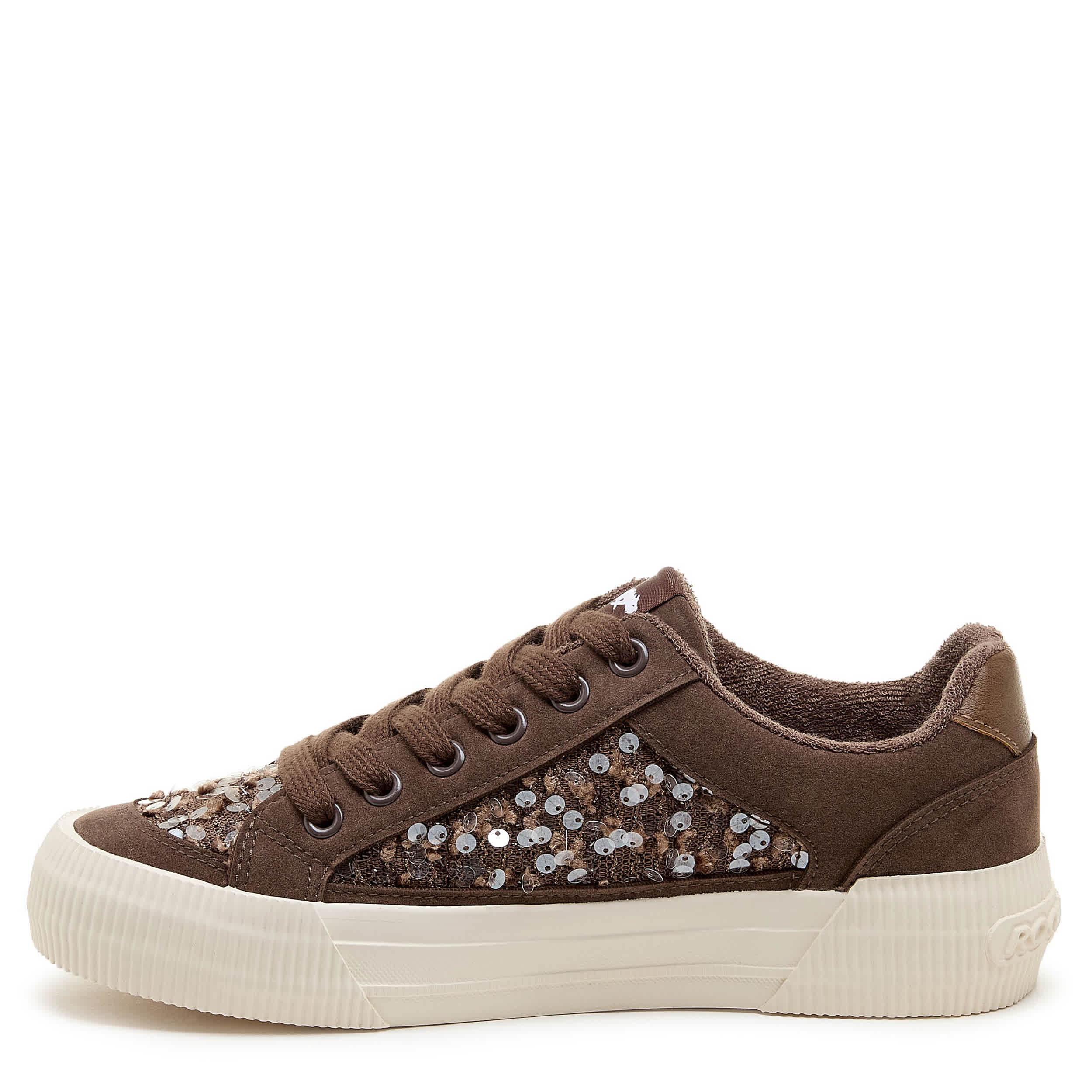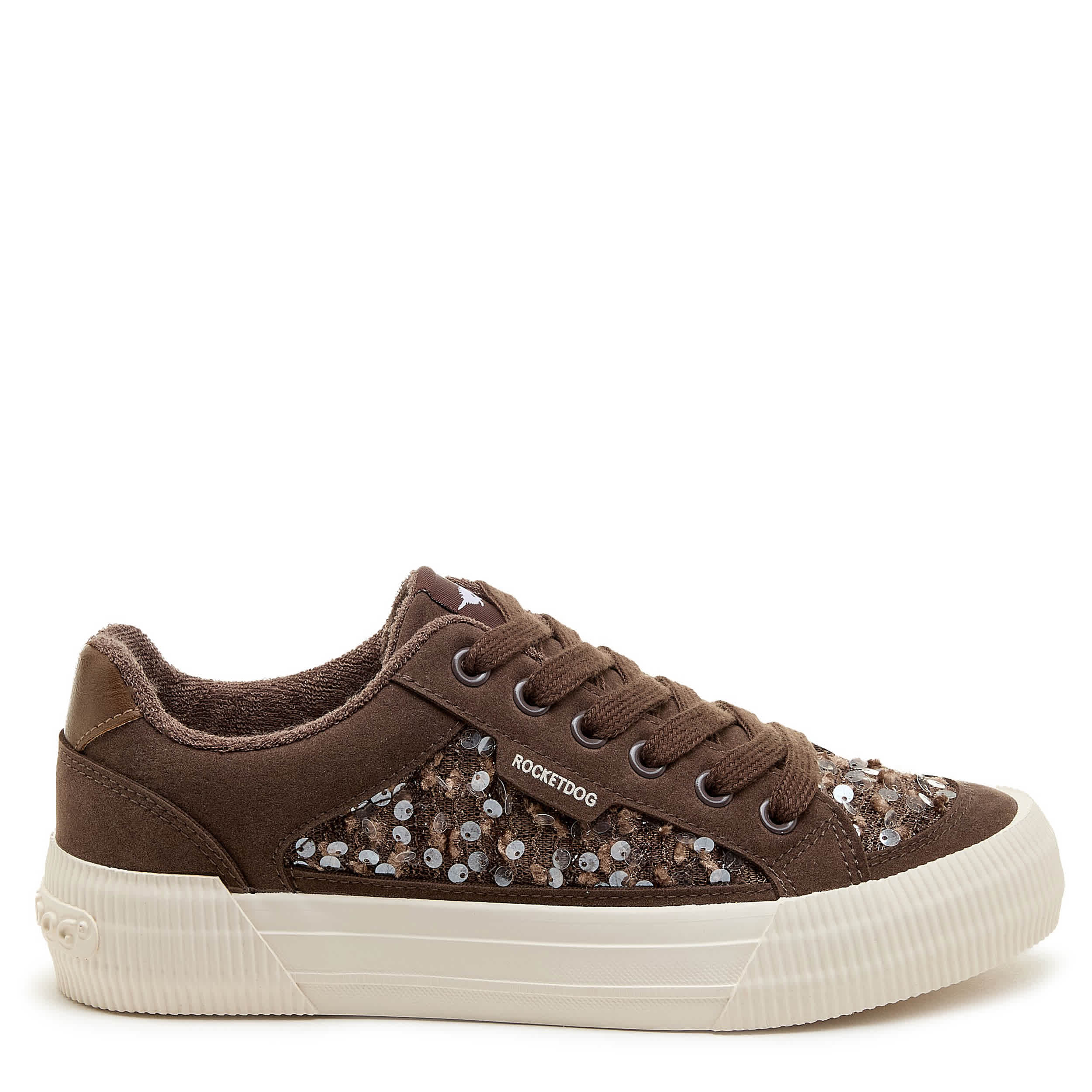 Don't leave home without that pep in your step with the Cheery Brown Sequin women's sneaker from Rocket Dog. Featuring a shiny, textured upper with neutral laces for an eye-catching look, this platform shoe offers a 1¼" boost. The Plush Foam Comfort insole cushions, while the textured outsole adds some traction.