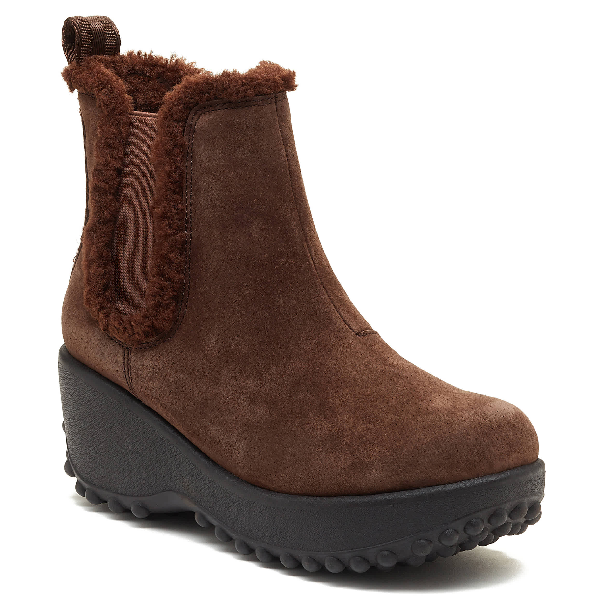 Winter's calling your name in the Frost Chelsea boot from Rocket Dog. Featuring a suede upper with a faux fur trim & lining for extra warm style, this cozy Chelsea boot also has an easy-on rear pull tab. The Plush Foam Comfort insole cushions, while the bubble traction sole adds lift and stability.