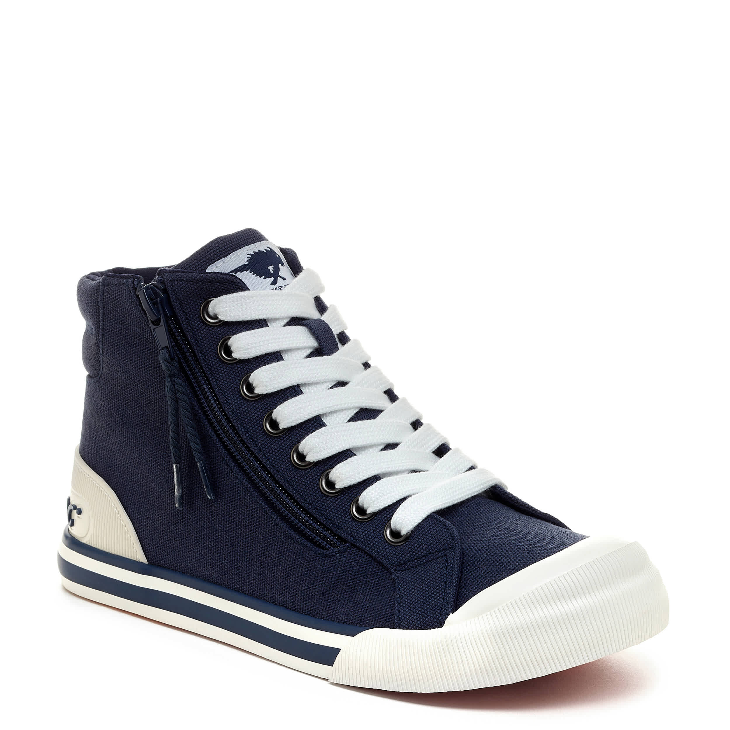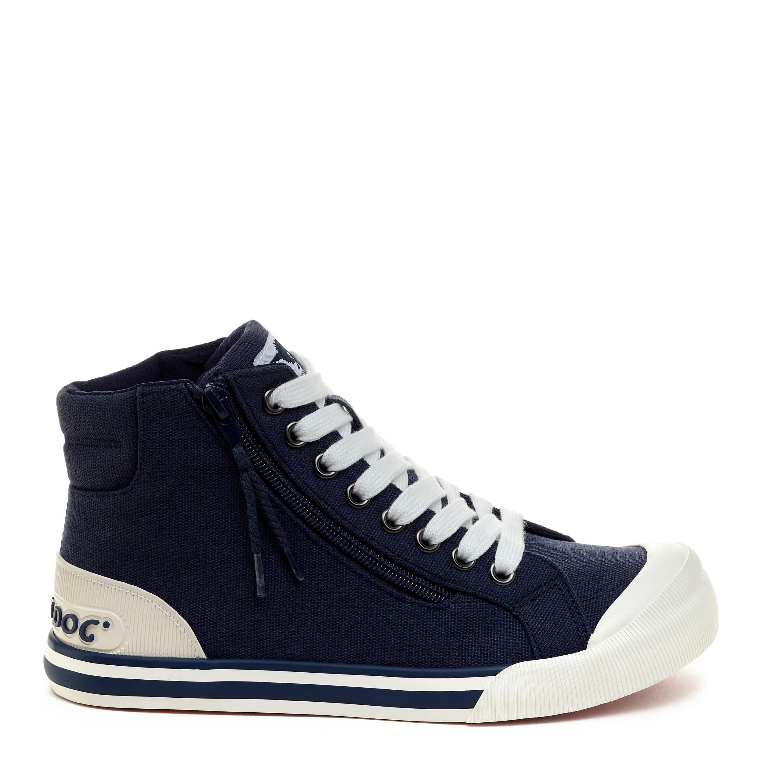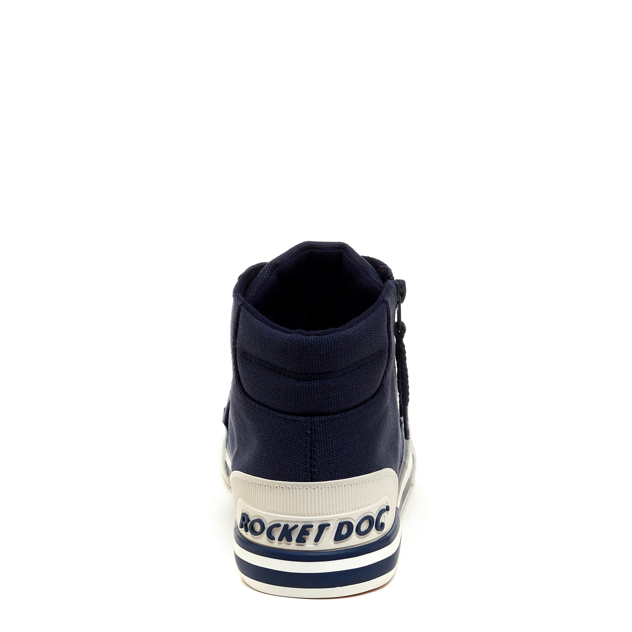 Get your fave sneaker design in a high-top with the Jazzin Navy Hi women's sneaker from Rocket Dog. Featuring a canvas upper with an oversized rubber cap toe, this outside zip shoe has the Rocket Dog logo embossed on the heel. The Plush Foam Comfort insole cushions, while the outsole is highlighted by a wide tonal stripe.