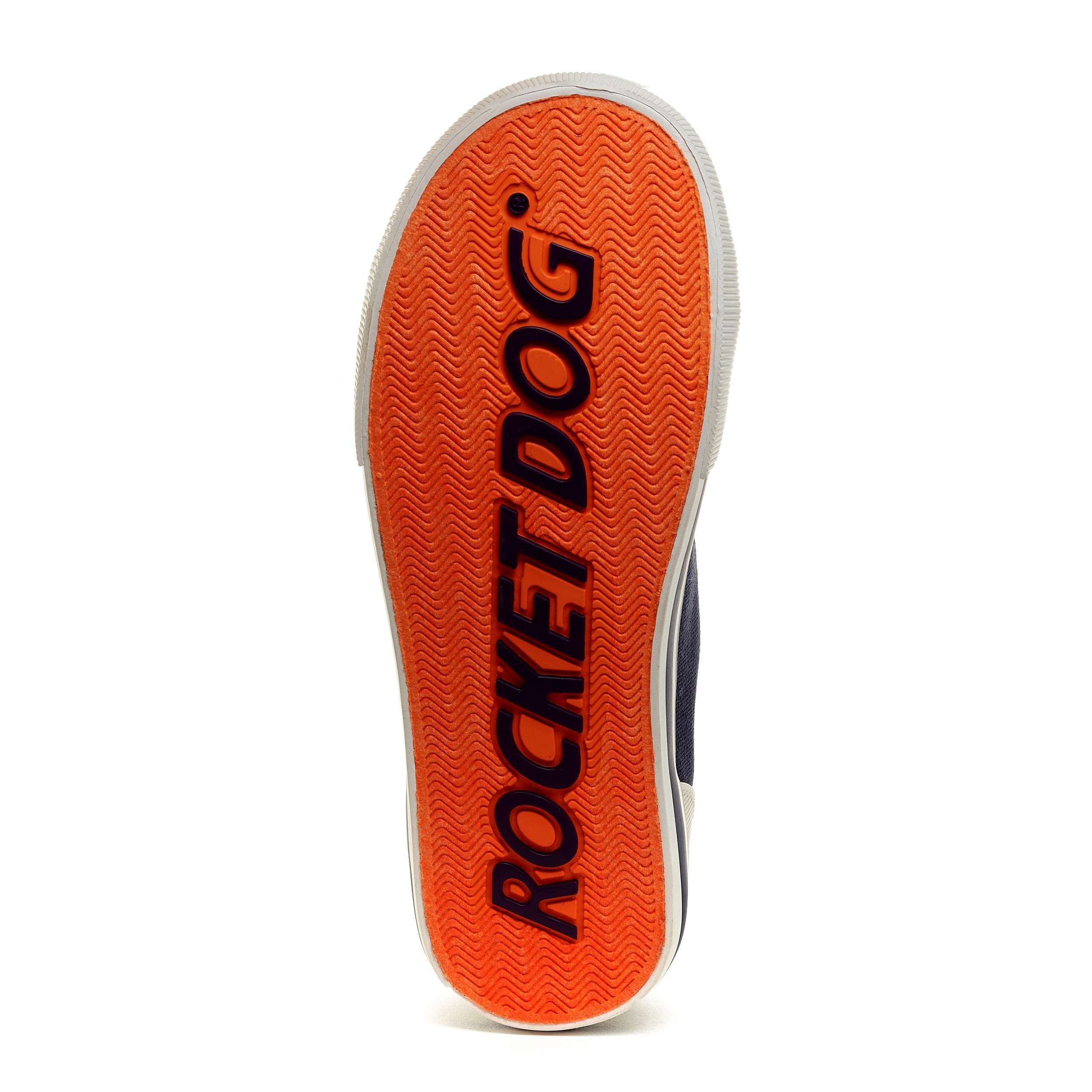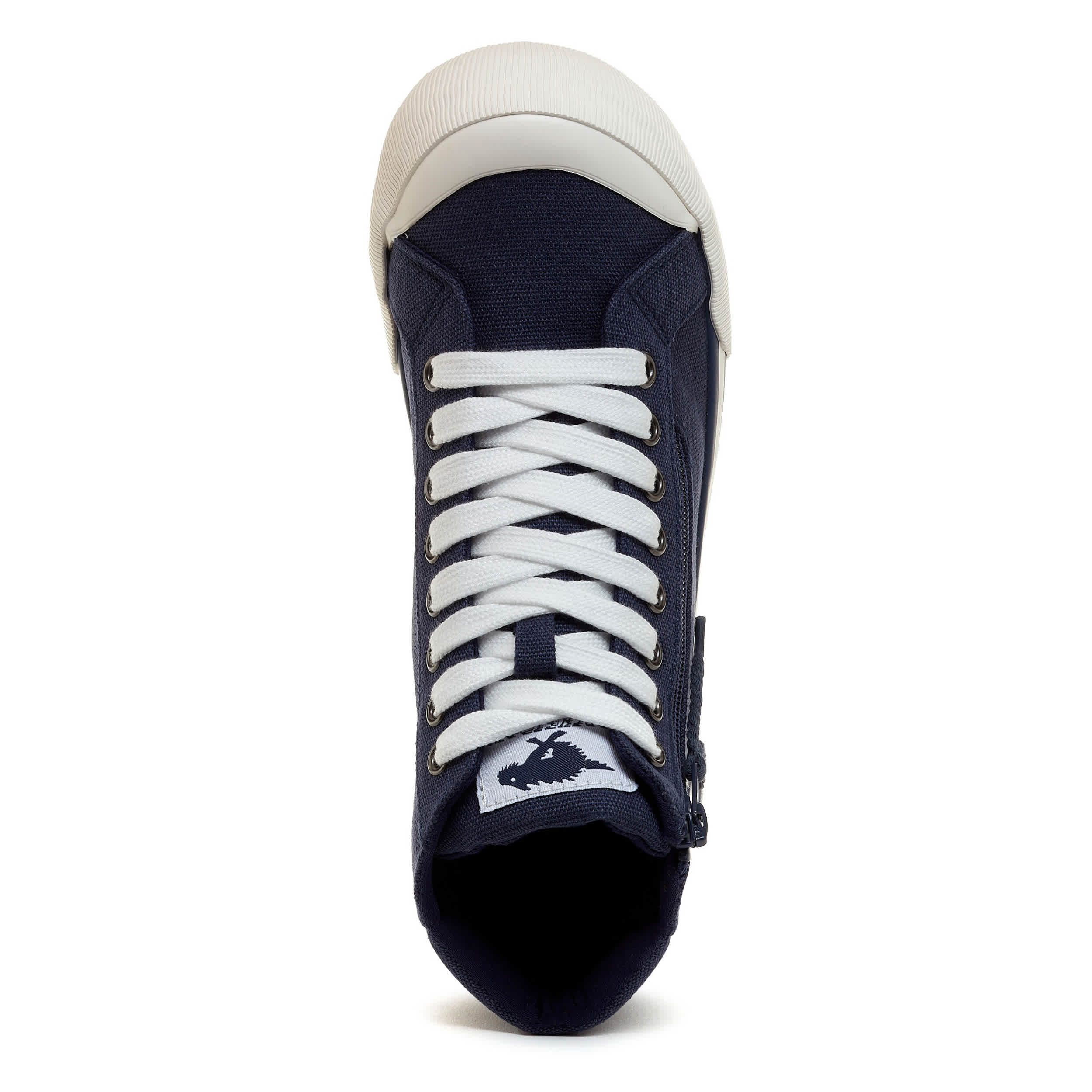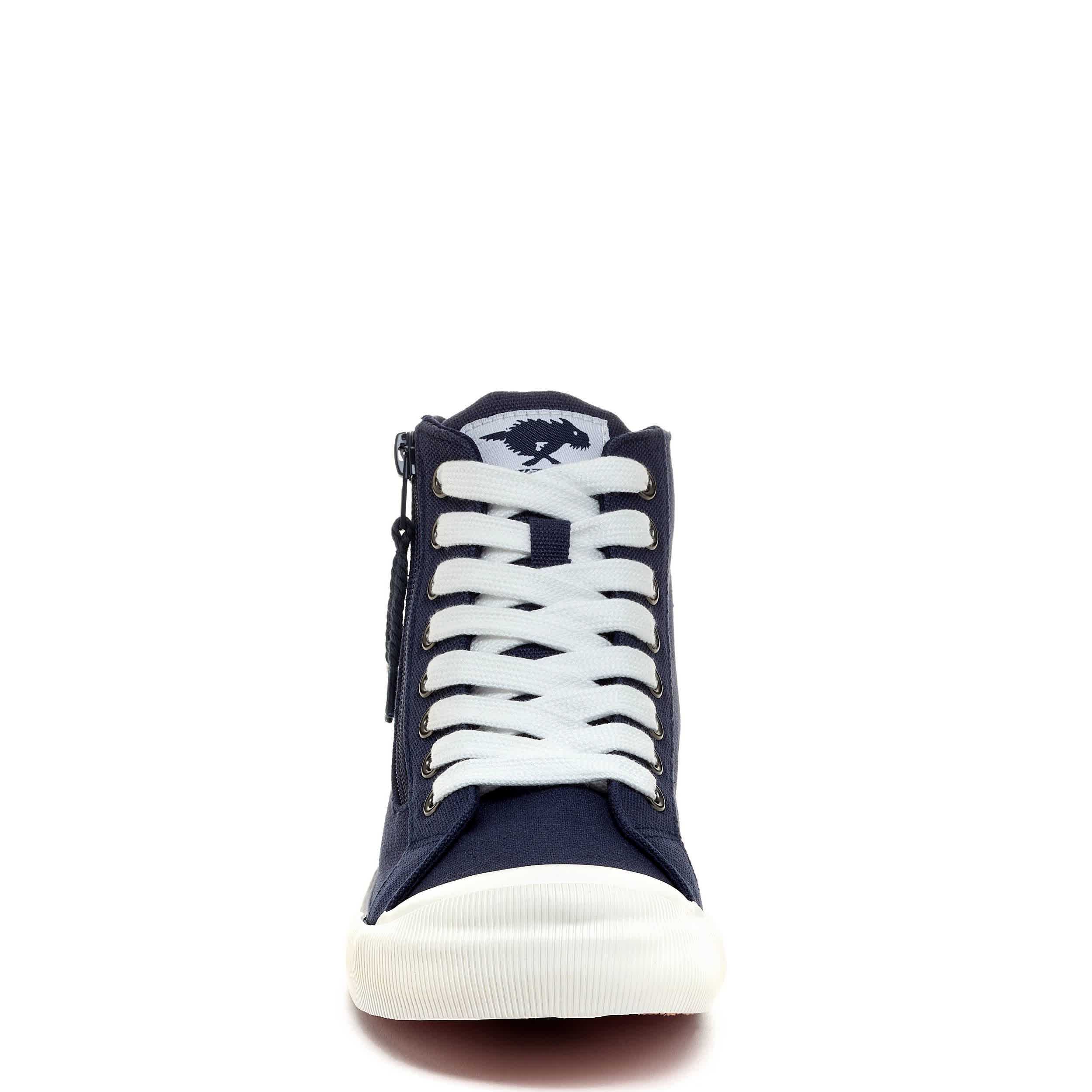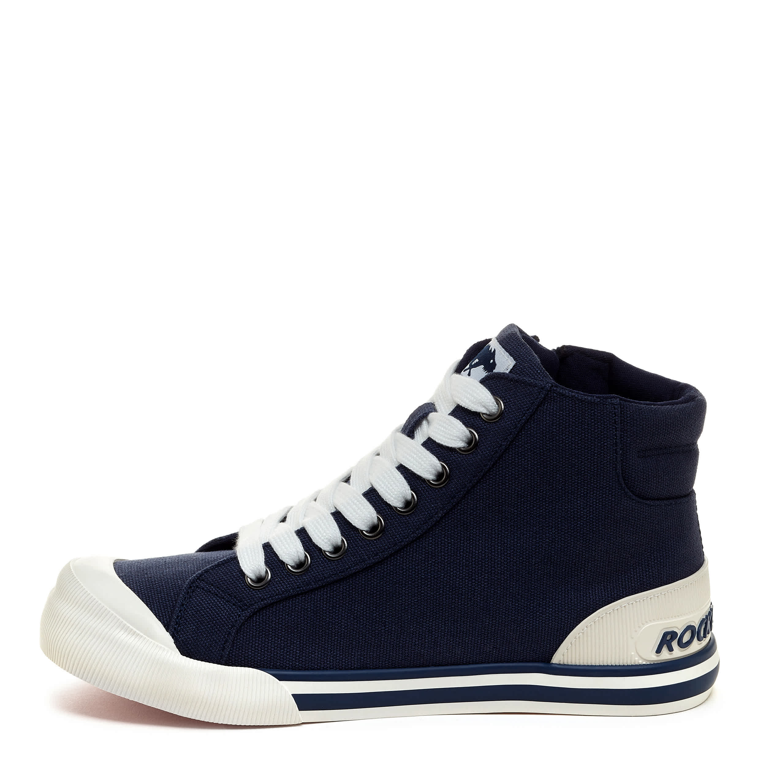 Get your fave sneaker design in a high-top with the Jazzin Navy Hi women's sneaker from Rocket Dog. Featuring a canvas upper with an oversized rubber cap toe, this outside zip shoe has the Rocket Dog logo embossed on the heel. The Plush Foam Comfort insole cushions, while the outsole is highlighted by a wide tonal stripe.