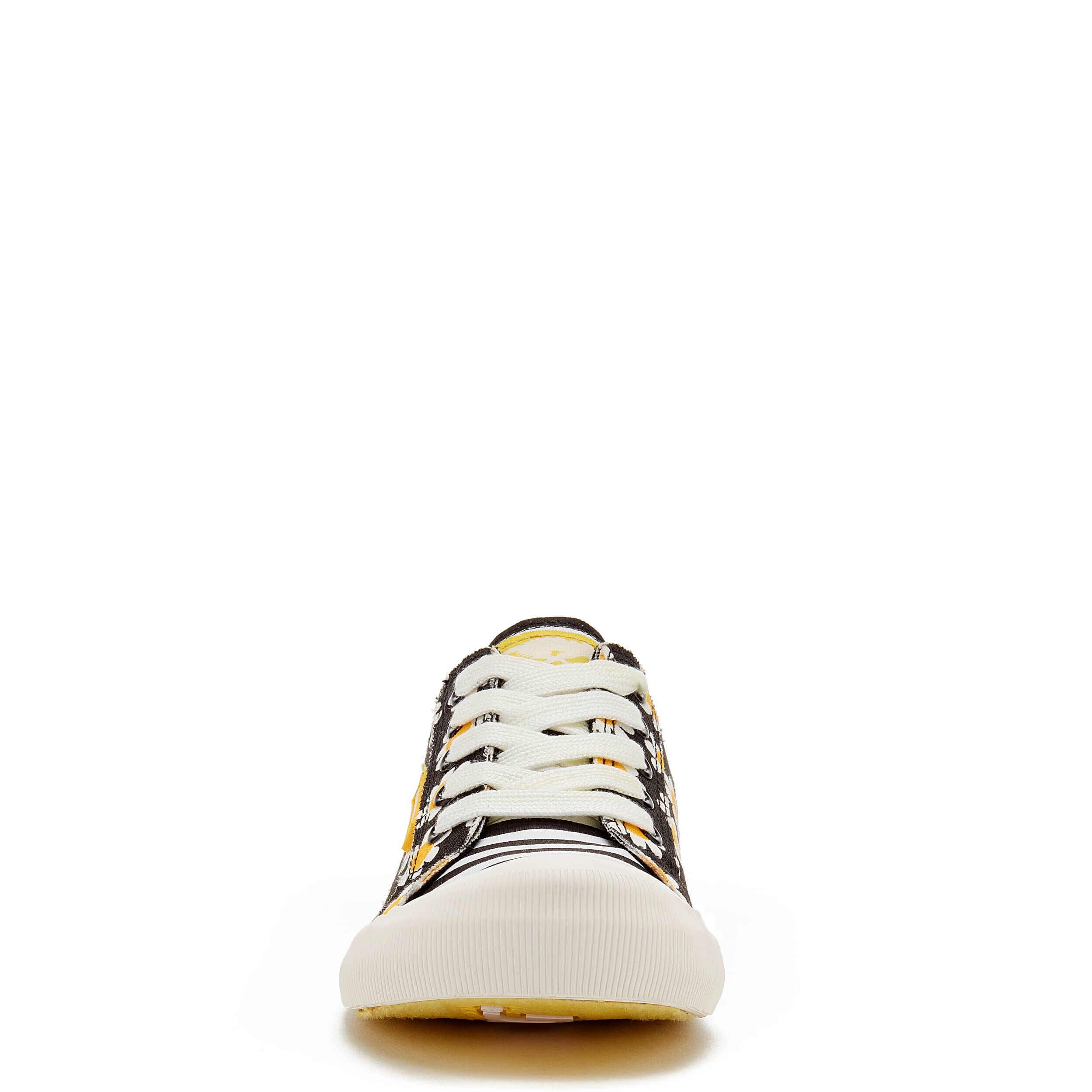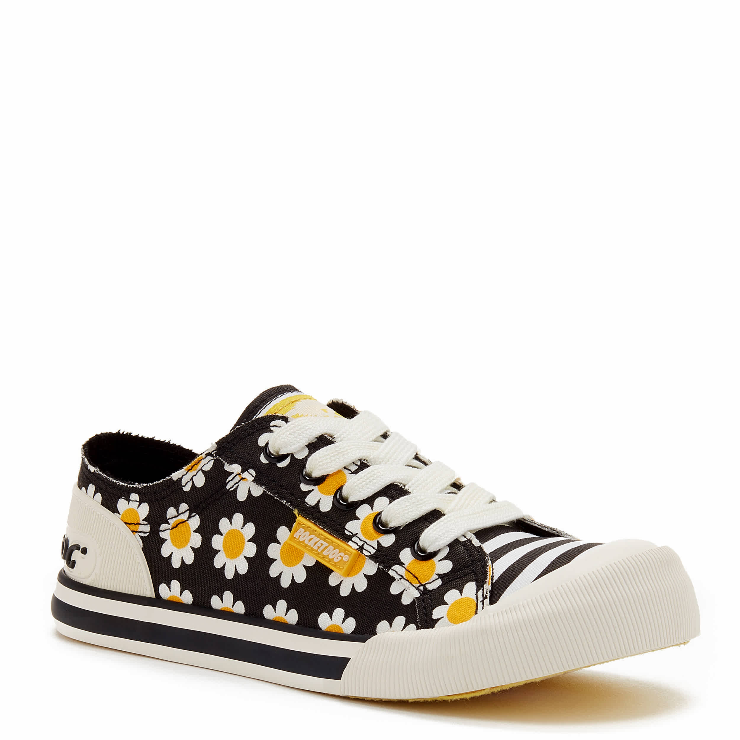 Crown your flower fave in the Jazzin Daisy Print women's sneaker from Rocket Dog. Featuring a daisy printed upper with an oversized rubber cap toe, this low-top shoe has the Rocket Dog logo embossed on the heel. The Plush Foam Comfort insole cushions, while the outsole is highlighted by a wide foxing stripe.