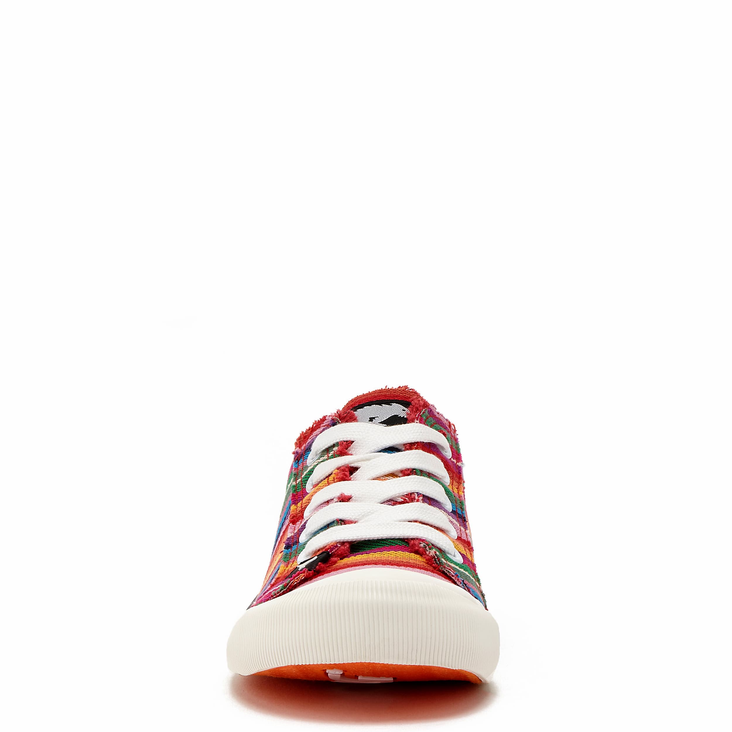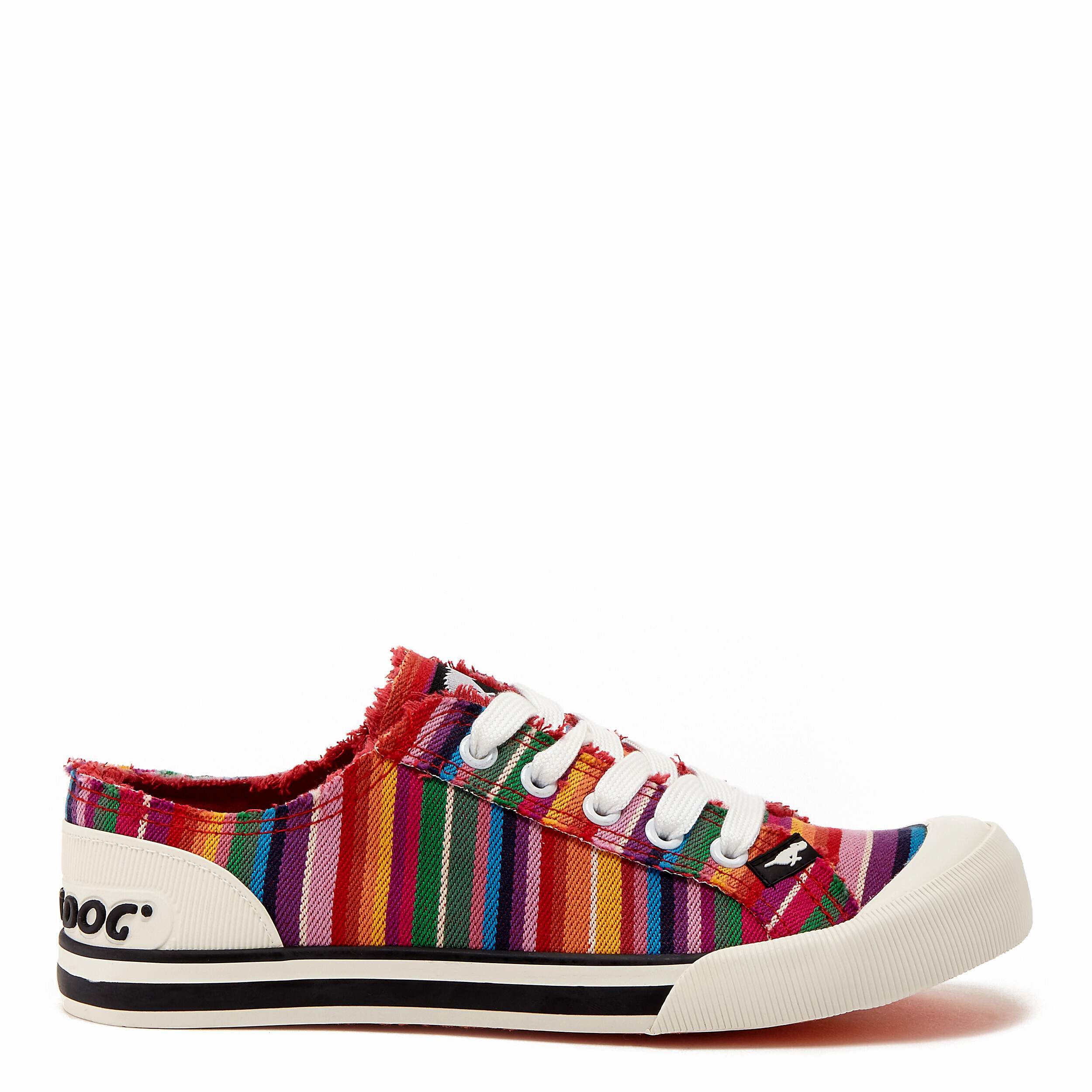 Brighten up your summer in the Jazzin women's sneaker from Rocket Dog. Featuring a rainbow striped canvas upper with frayed edges and an oversized rubber cap toe, this low-top shoe has the Rocket Dog logo embossed on the heel. The Plush Foam Comfort insole cushions, while the outsole is highlighted by a wide foxing stripe.