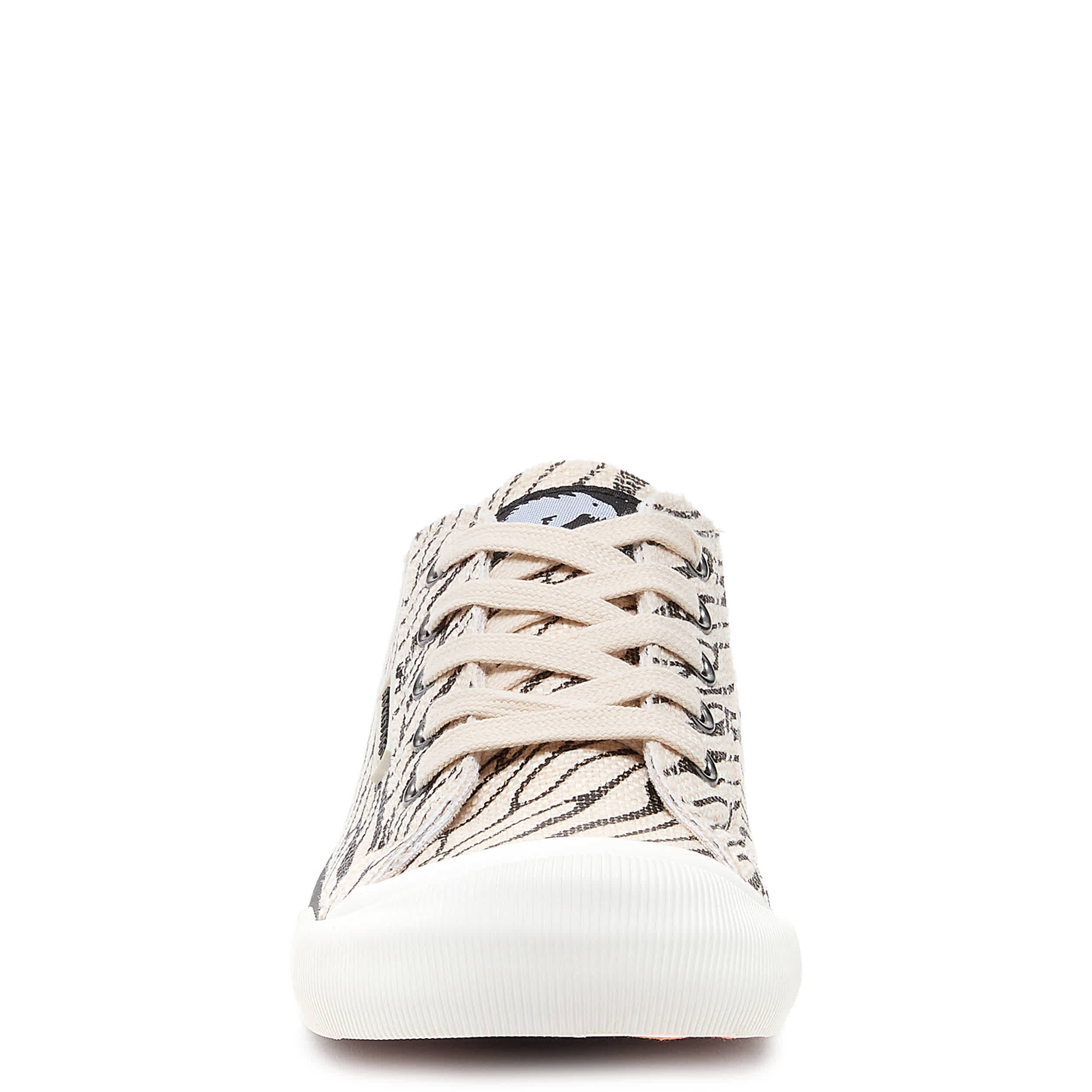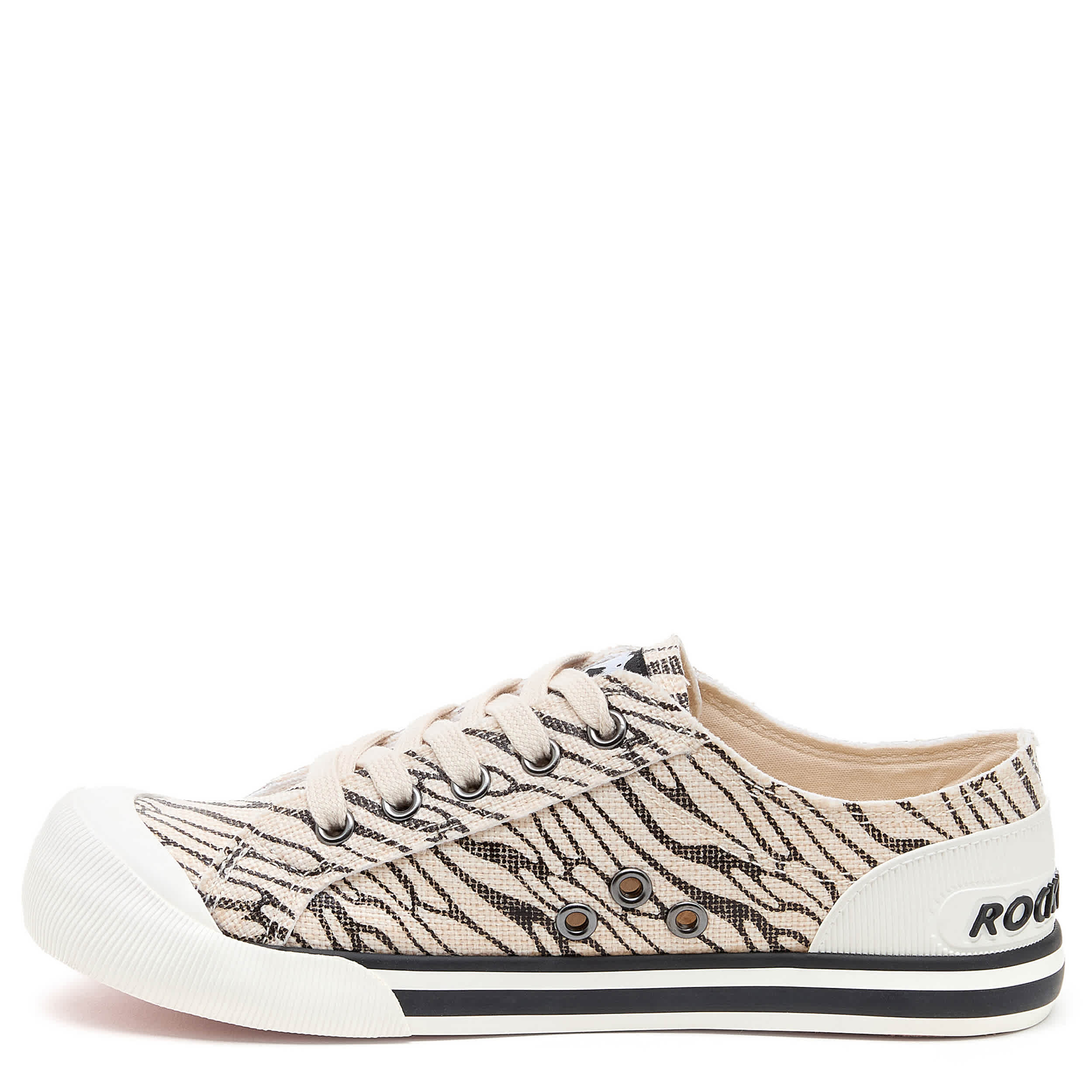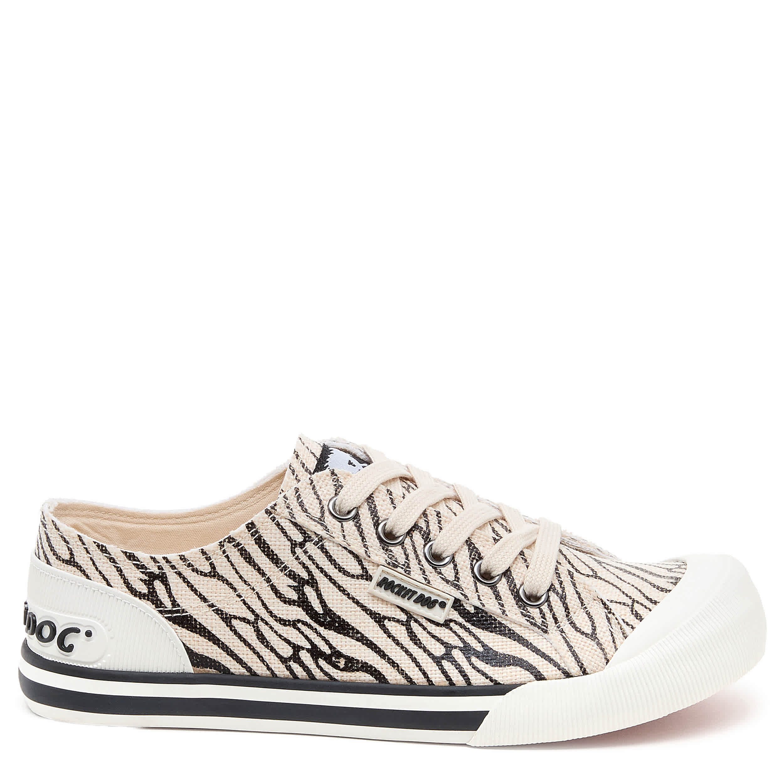 Head for wild fun in the Jazzin Zebra women's sneaker from Rocket Dog. Featuring a black & white zebra print with an oversized rubber cap toe, this low-top shoe has the Rocket Dog logo embossed on the heel. The Plush Foam Comfort cushions, while the outsole is highlighted by a wide foxing stripe.