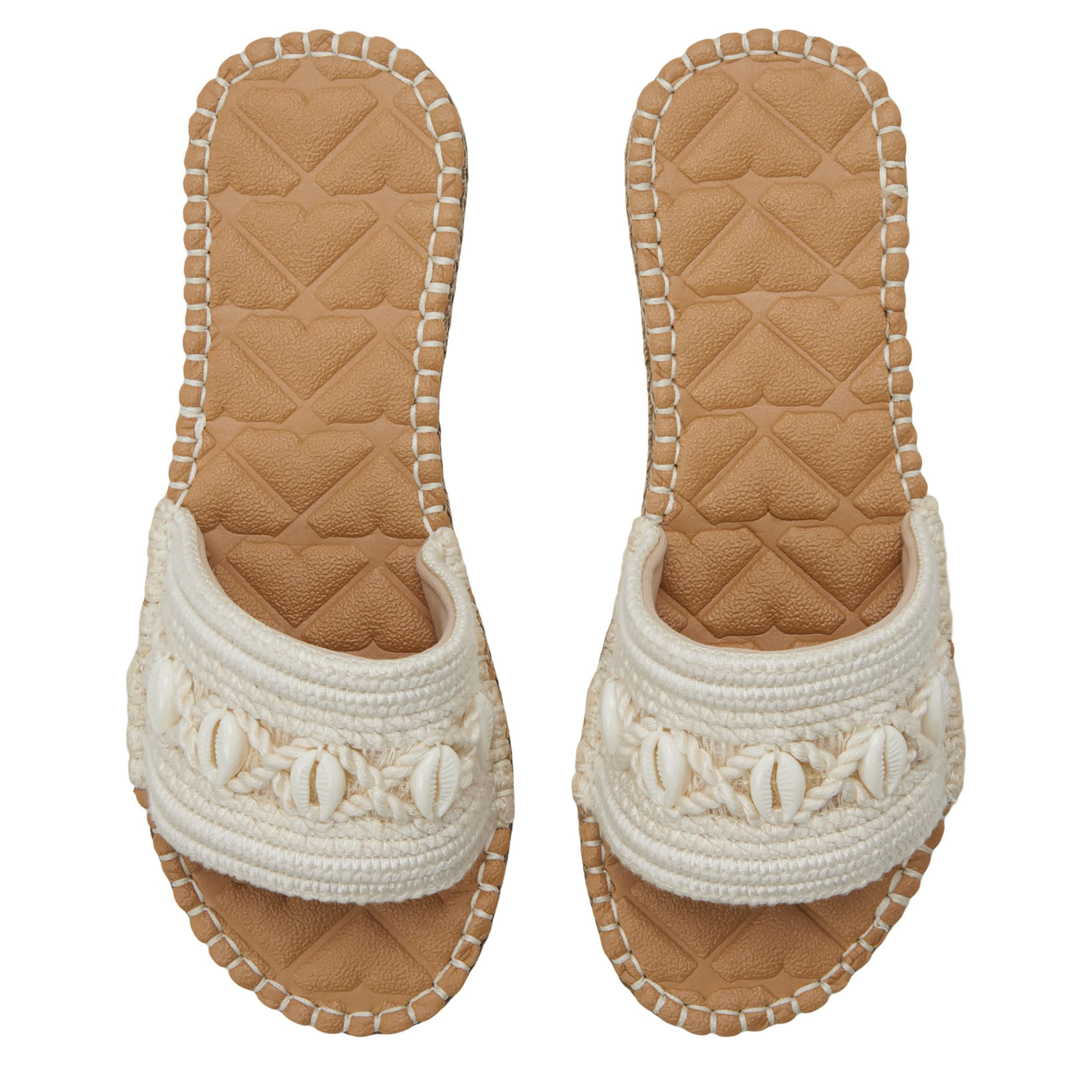 Slide into summer with the Roxy Shoresoft LX slide sandal. With a woven fabric upper in a bandage design, this espadrille-inspired shoe has shell accents, perfect for all your warm weather outfits. The padded insole cushions your foot, while the outsole gives traction.