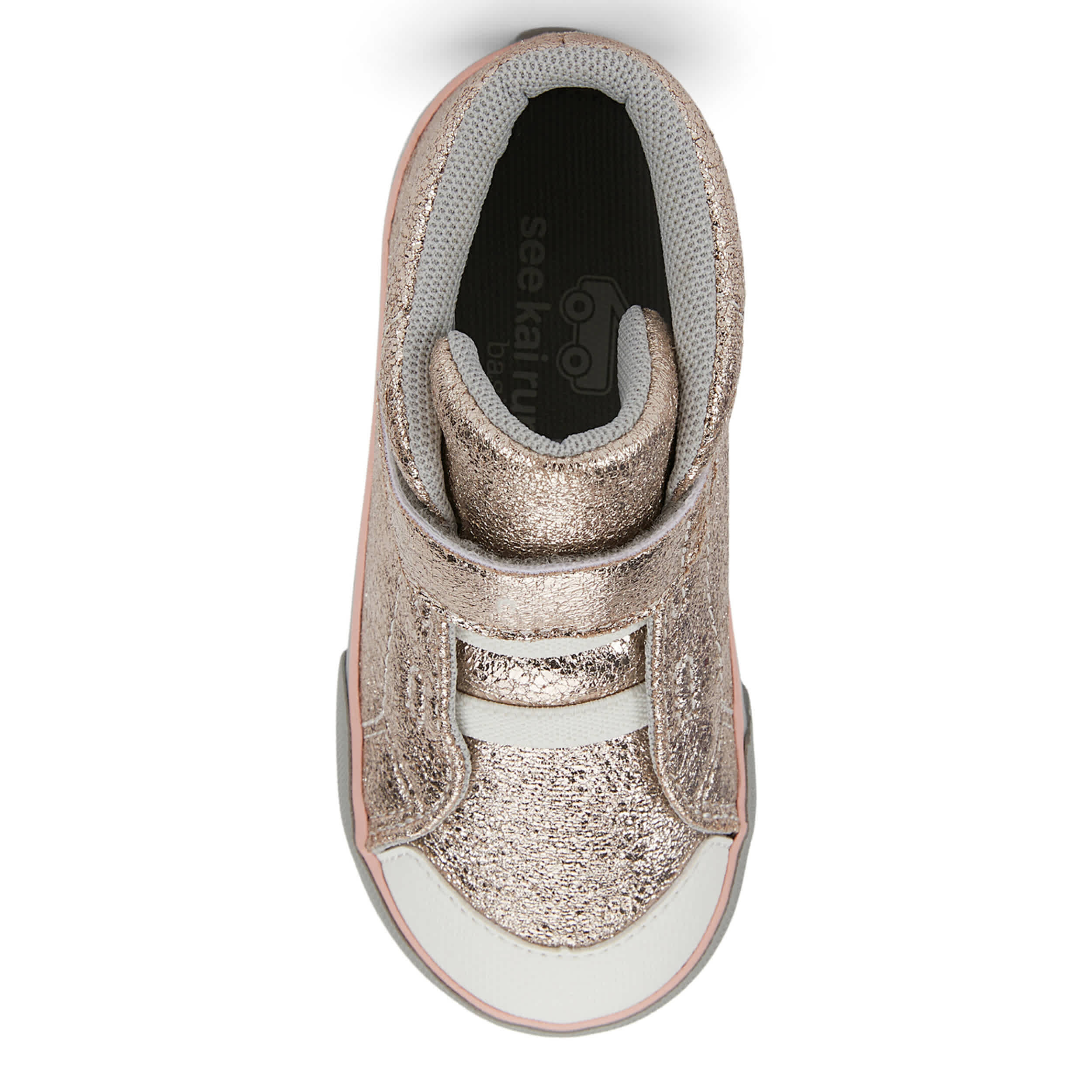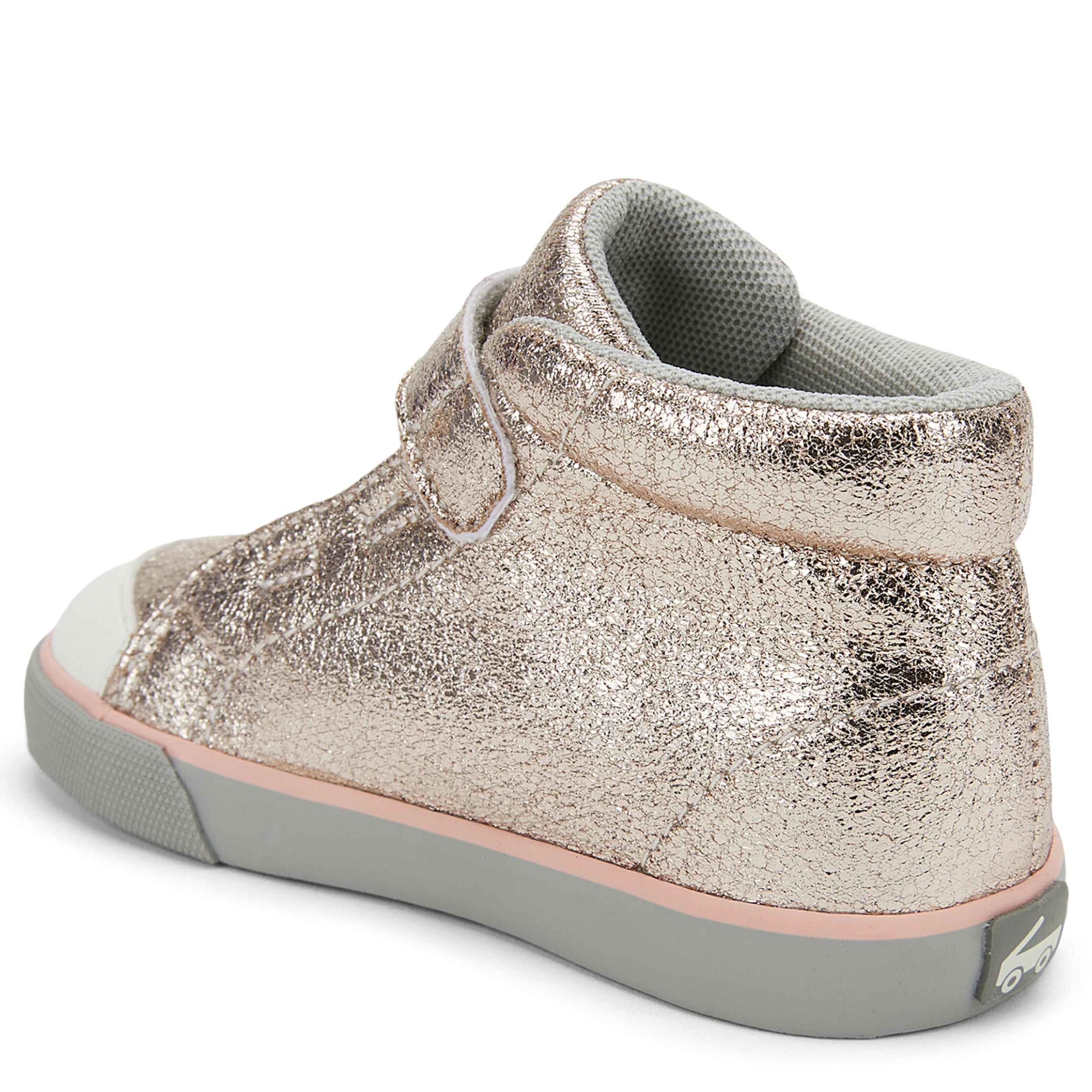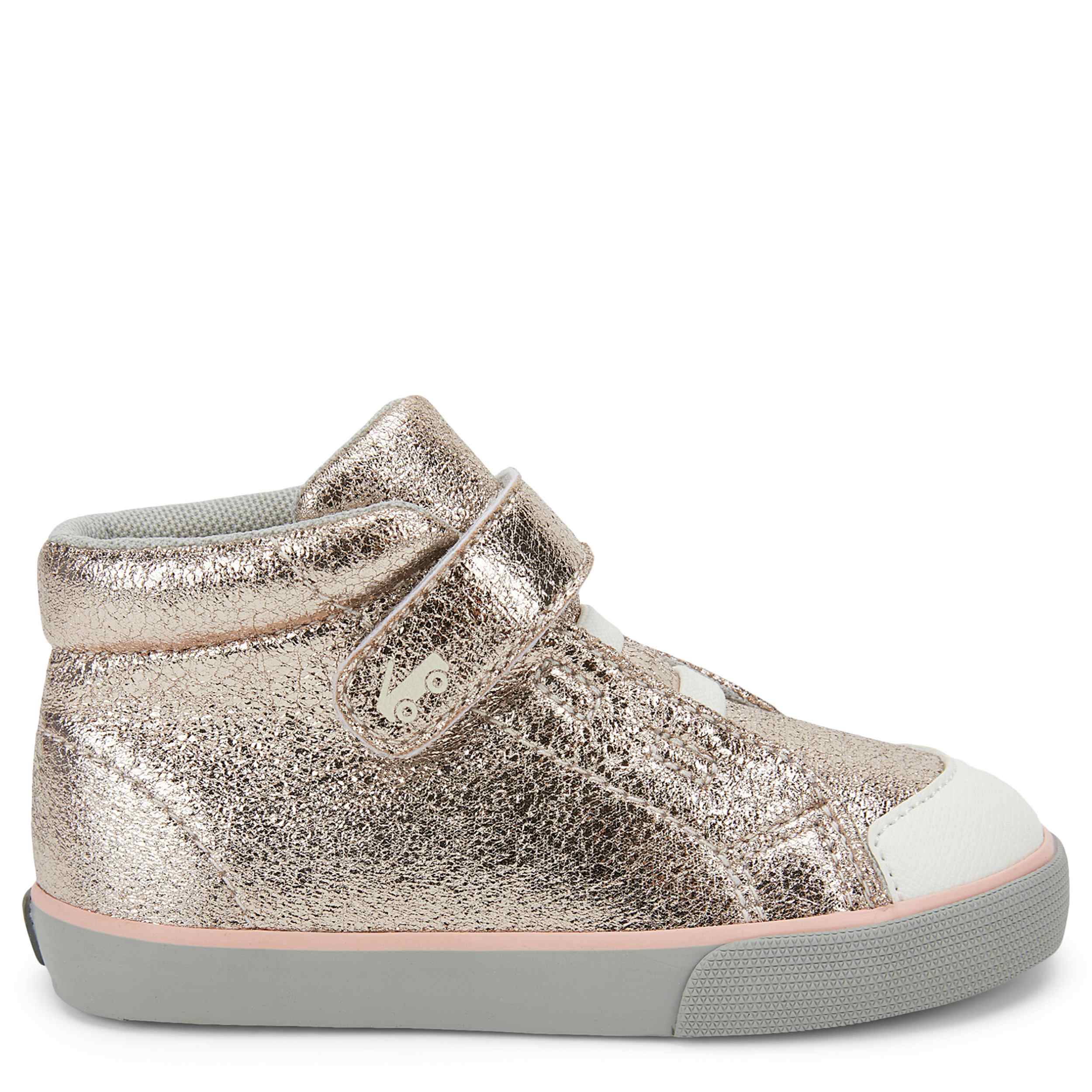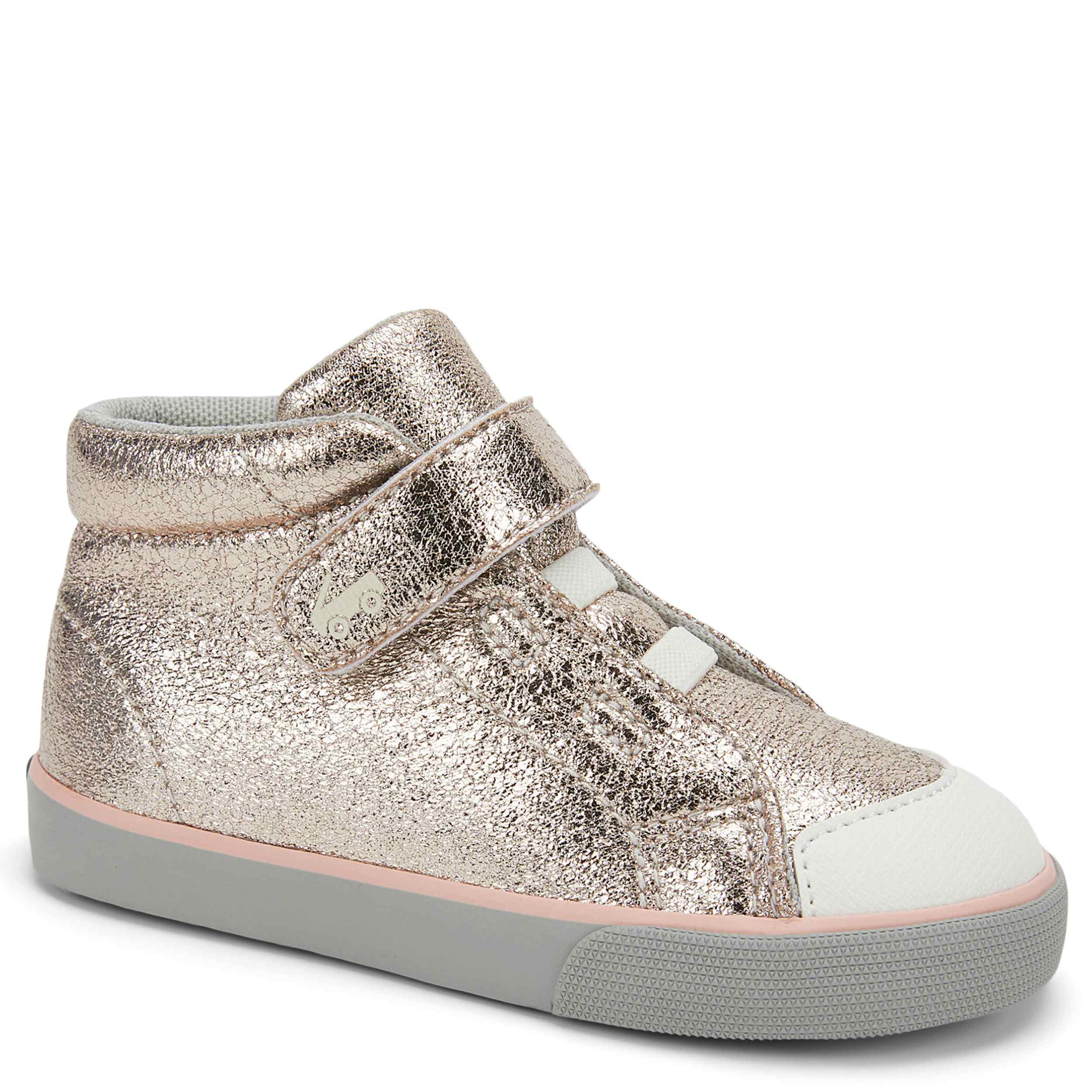 Leave a smaller footprint on the planet with the Drew toddler girls' sneaker from See Kai Run. Featuring a sparkling metallic upper with a protective cap toe, this high top has a roomy toe box and breathable mesh lining for extra comfort. The enhanced rubber outsole offers superior traction.