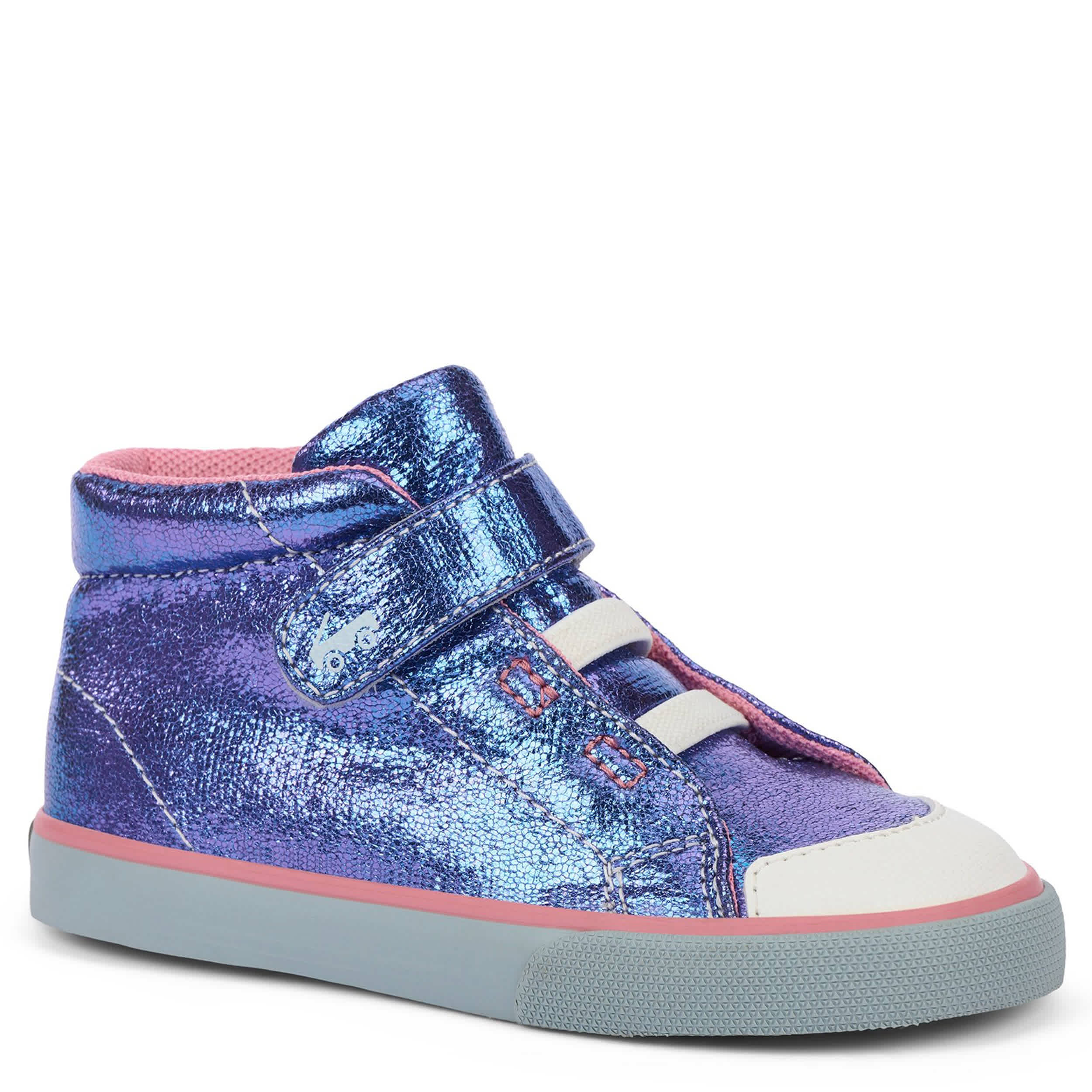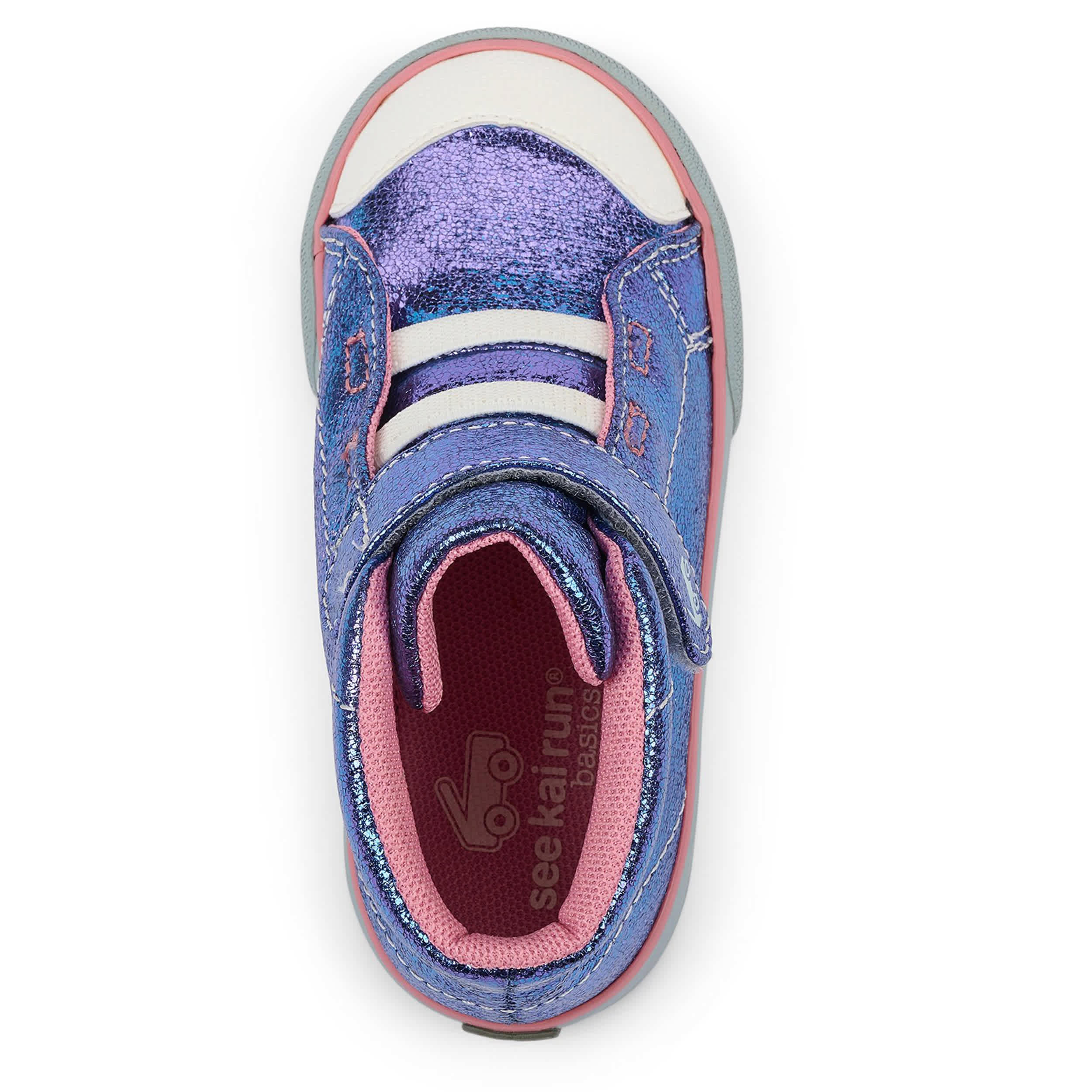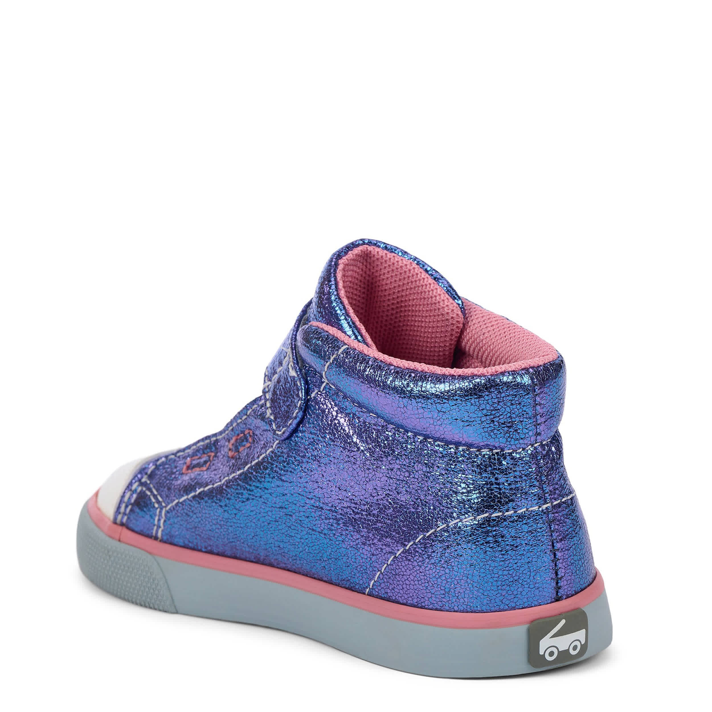 Leave a smaller footprint on the planet with the Drew toddler girls' sneaker from See Kai Run. Featuring a sparkling metallic upper with a protective cap toe, this high top has a roomy toe box and breathable mesh lining for extra comfort. The enhanced rubber outsole offers superior traction.