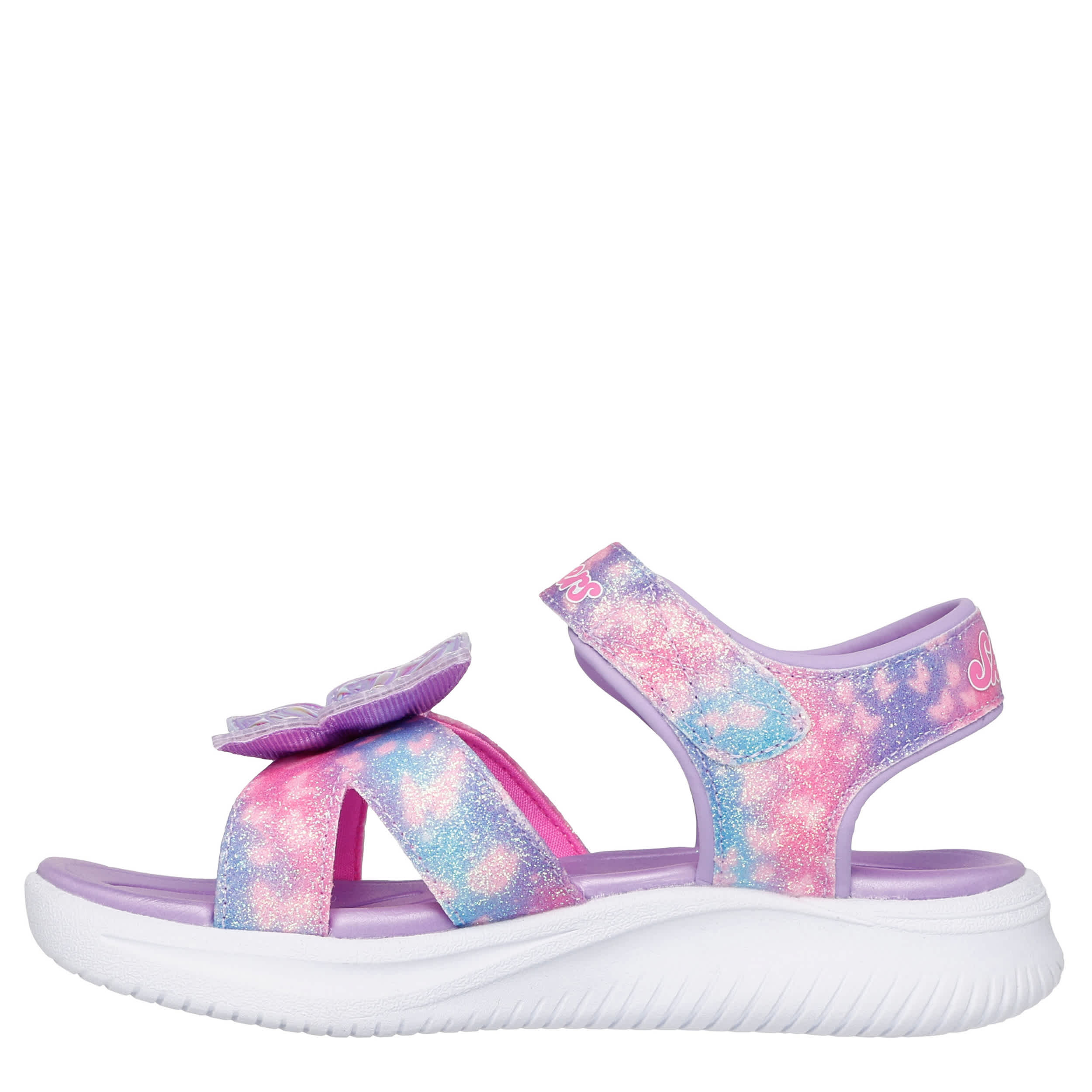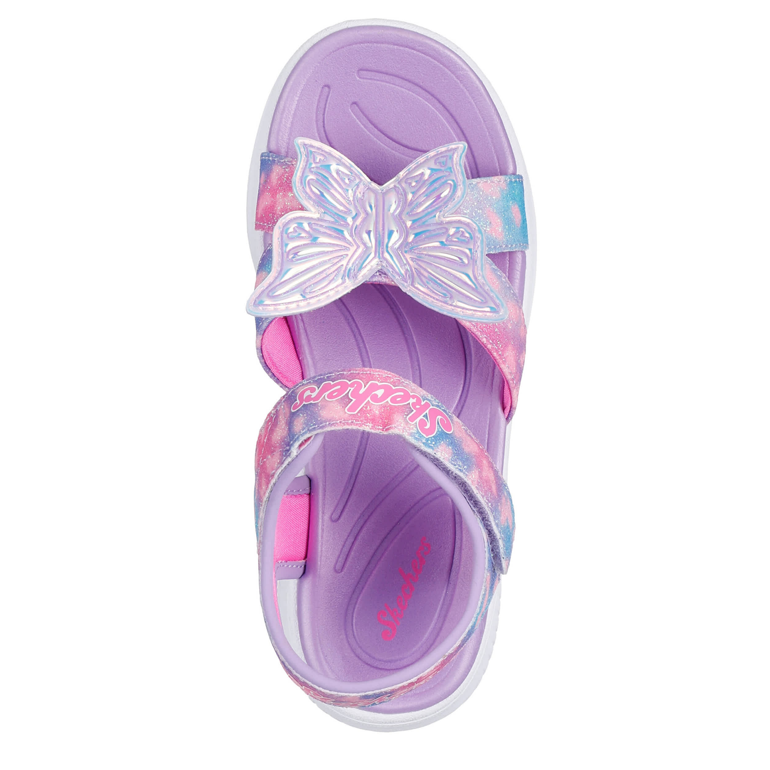 Fluff up her little wings with the Skechers Jumpsters Sandal - Butterfly Brights. Featuring a shimmery woven upper with an easy-on design, this light-up shoe helps her float. The footbed comforts her feet, while the outsole offers flexible traction.