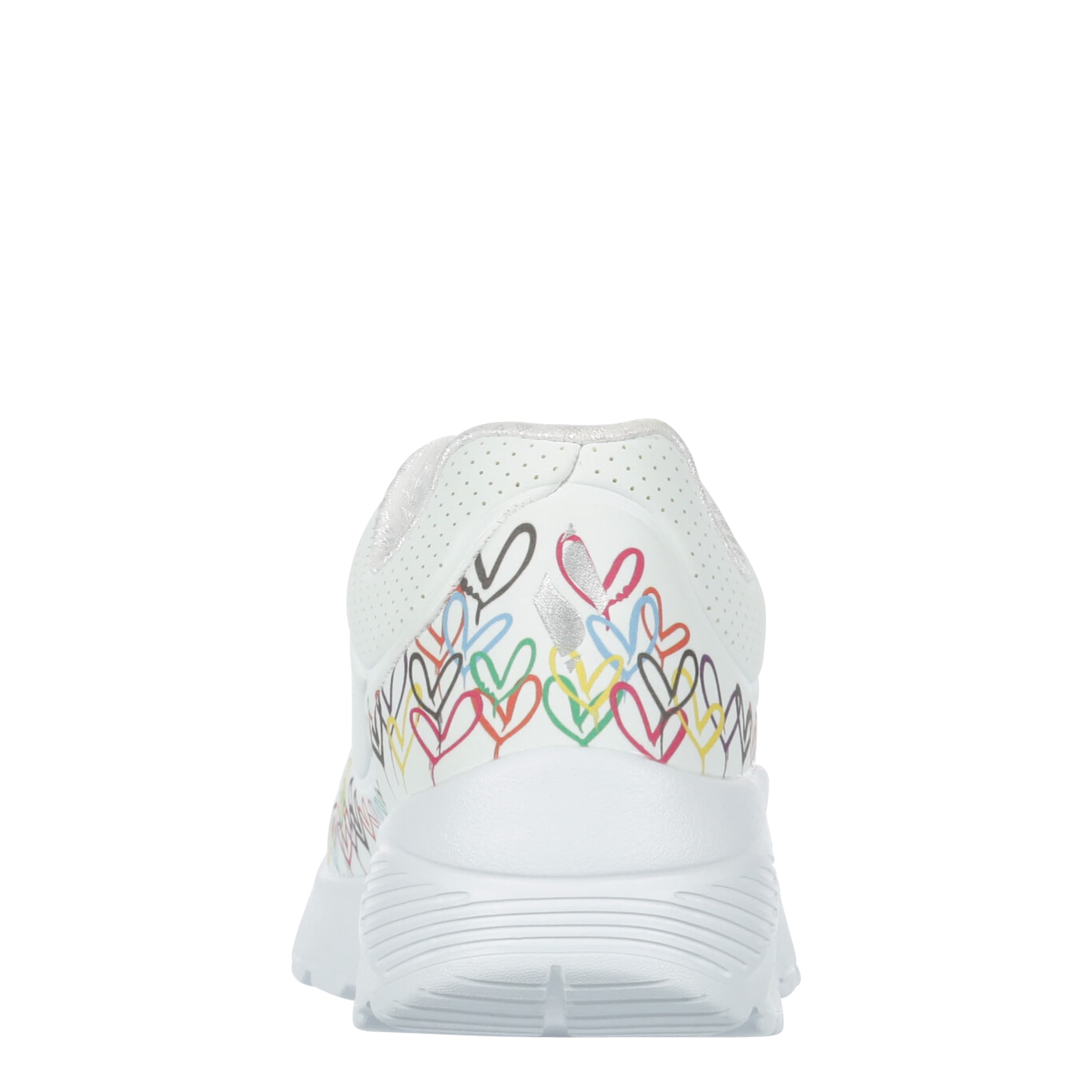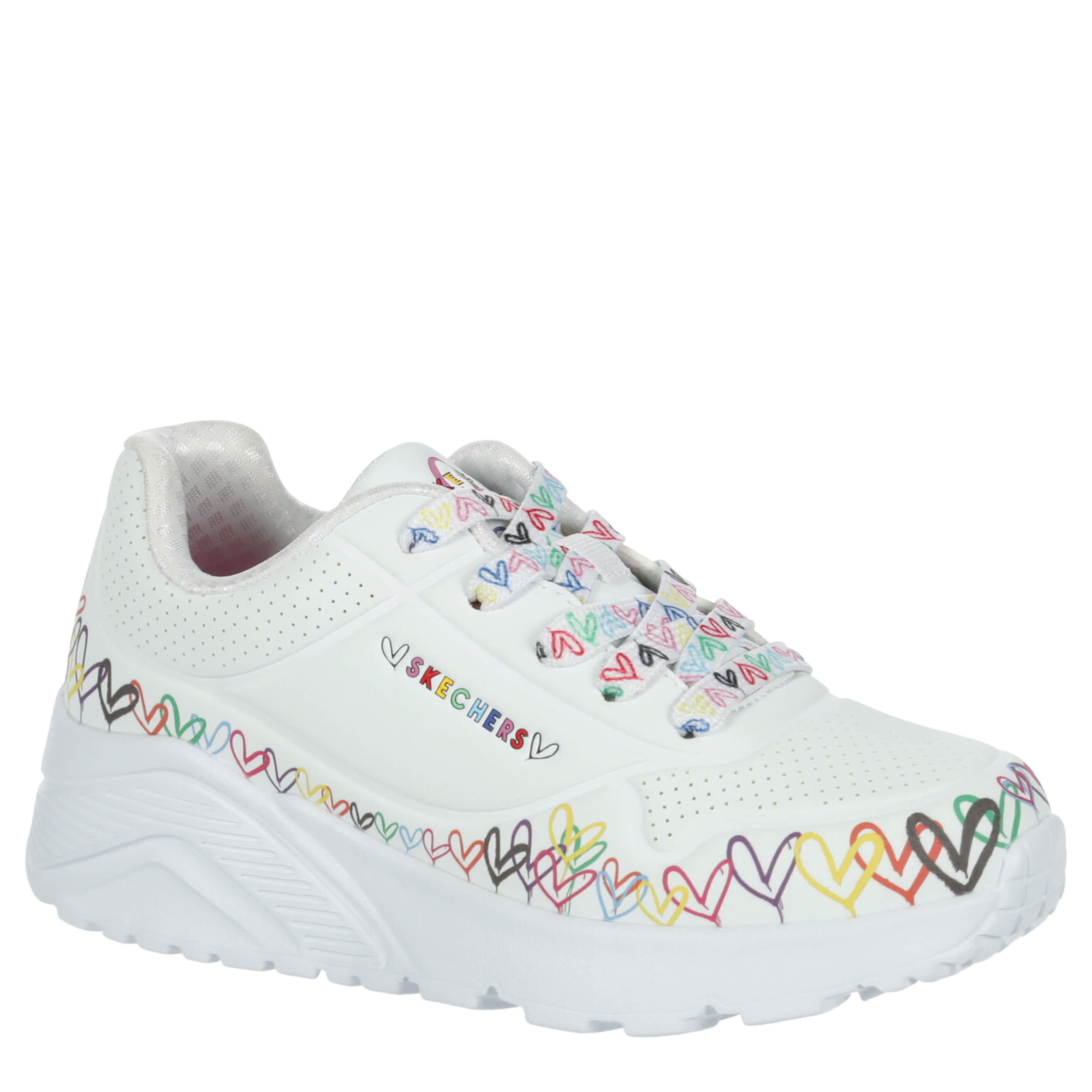 Tag her athleisure look with the Skechers Street™ x JGoldcrown: Uno Lite - Heart Daze sneaker. Featuring a perforated durabuck upper, this lace-up shoe adds a subtle pop of #Lovewall heart designs to her style. The Skechers Air-Cooled Memory Foam® insole & Skech-Air midsole cushion every step, while the durable outsole offers flexible traction.