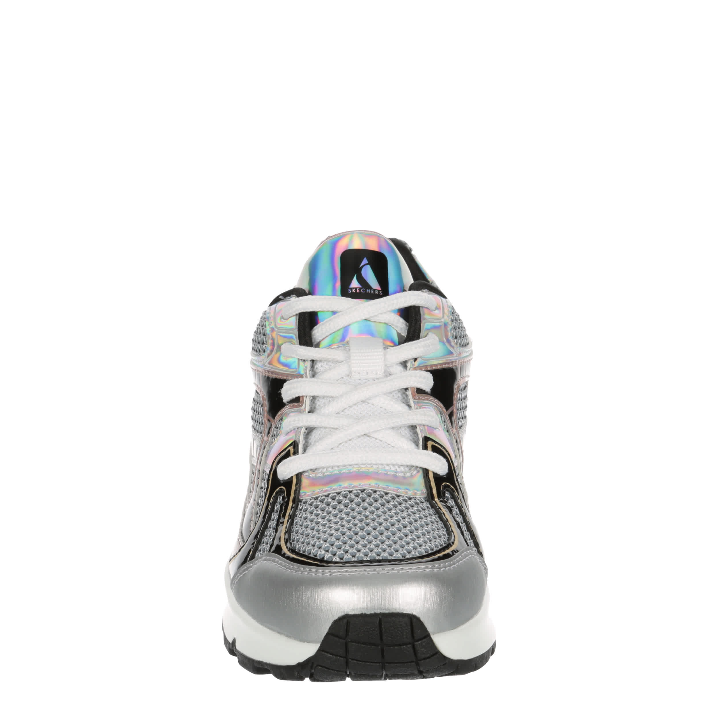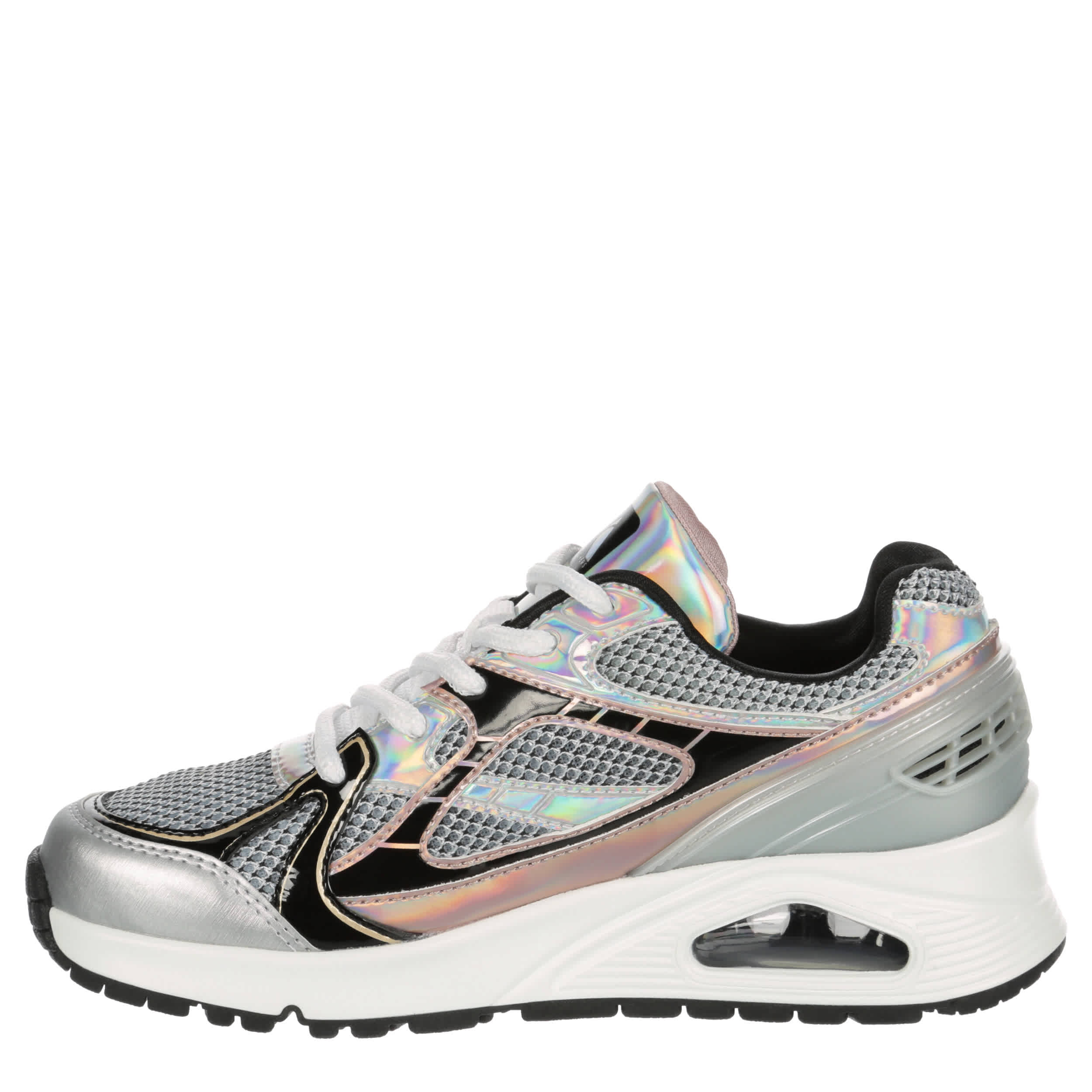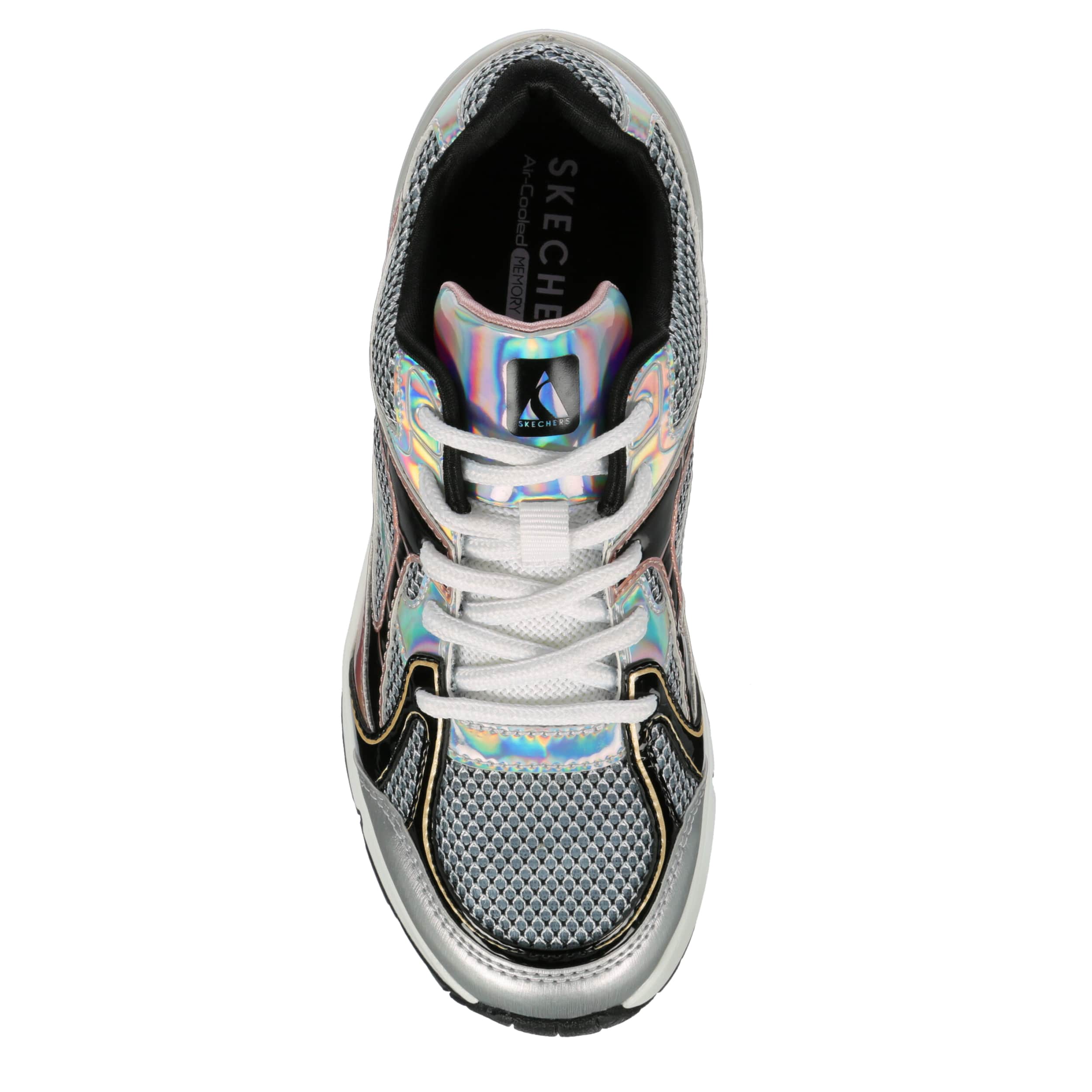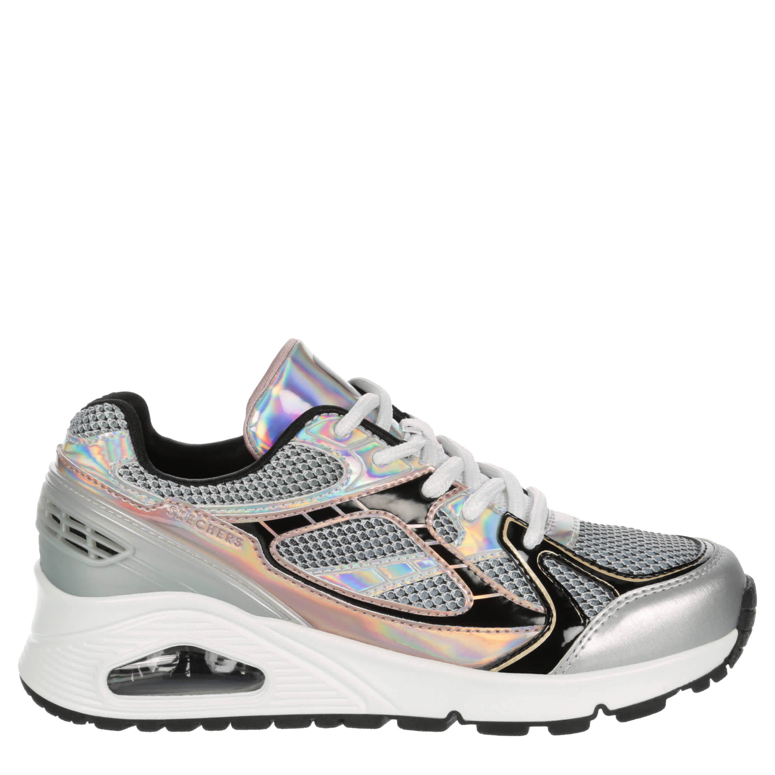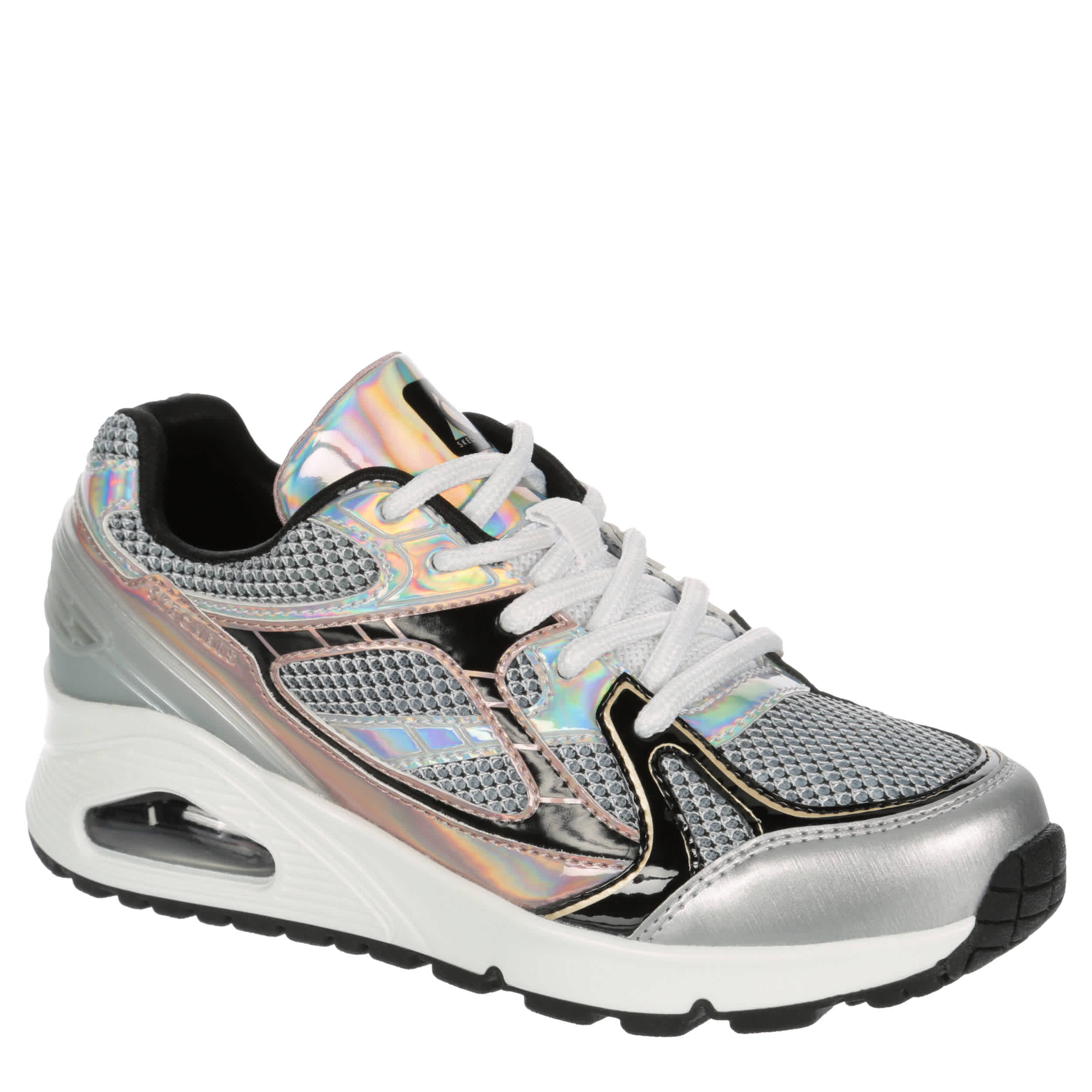 Shine up her style in the Skechers Street™ Uno Gen1 - Platinum Flash sneaker. With a mesh & faux leather upper featuring a comfy padded collar, this lace-up sneaker has metallic details for a modern pop. The Skechers Air-Cooled Memory Foam® insole & Skech-Air® midsole cushion every step while the outsole offers flexible traction.