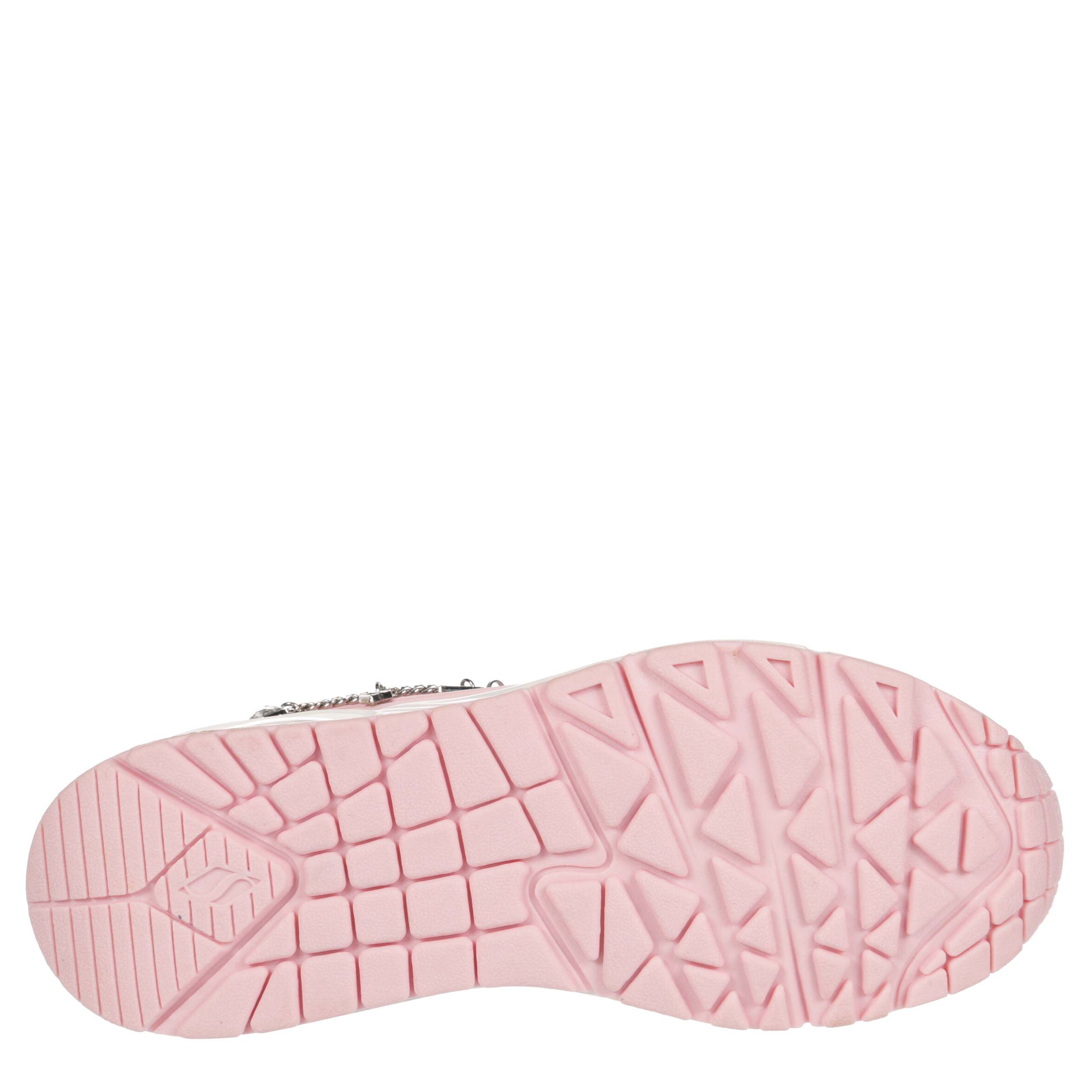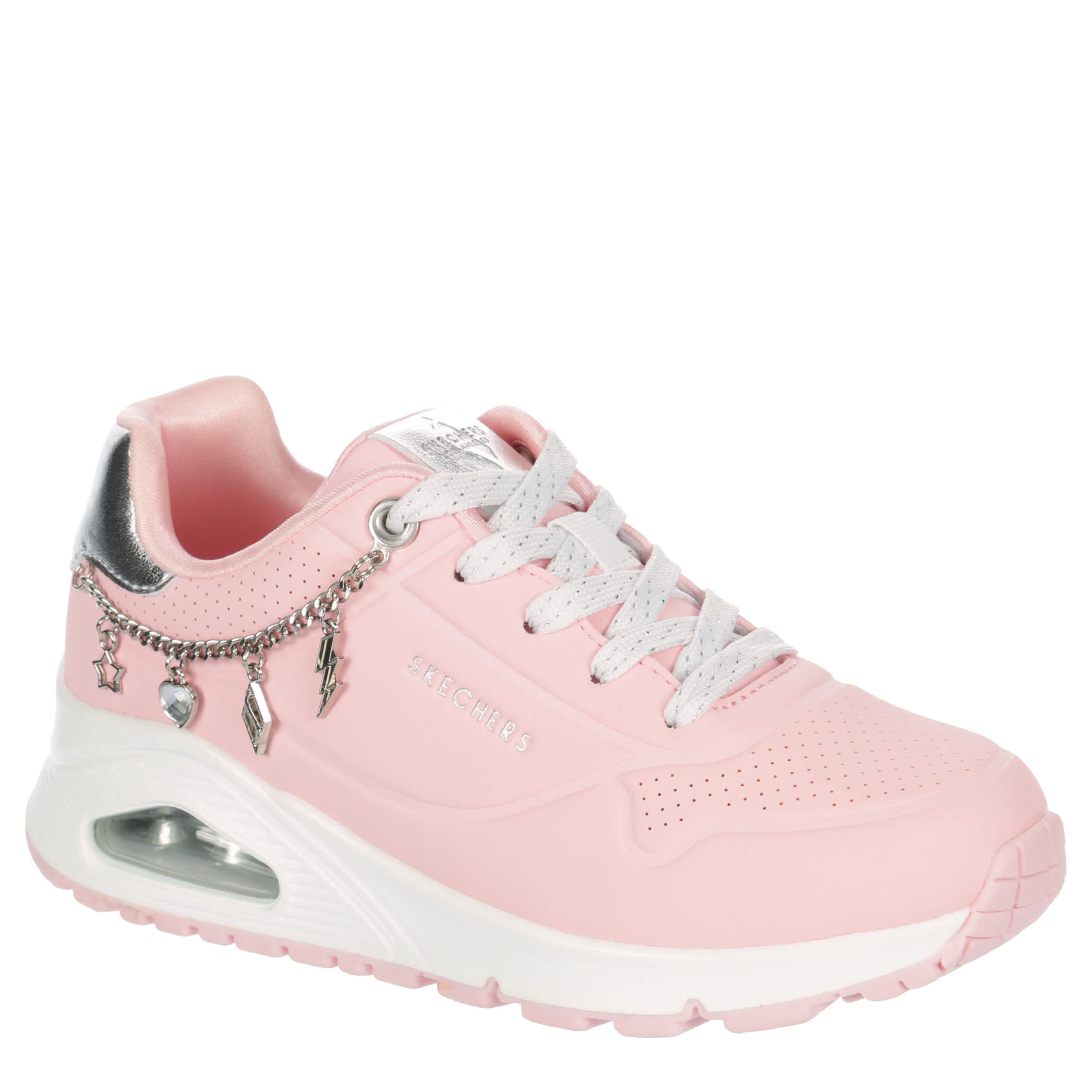 Detachable charm bracelet and comfort make the Uno Gen1 - She's Charming sneaker from Skechers a keeper. Featuring a faux leather upper with metallic trim for extra style, this lace-up sneaker levels up her sneaker game. The Skechers Air-Cooled Memory Foam® insole & Skech-Air® visible airbag midsole keep her moving comfortably.