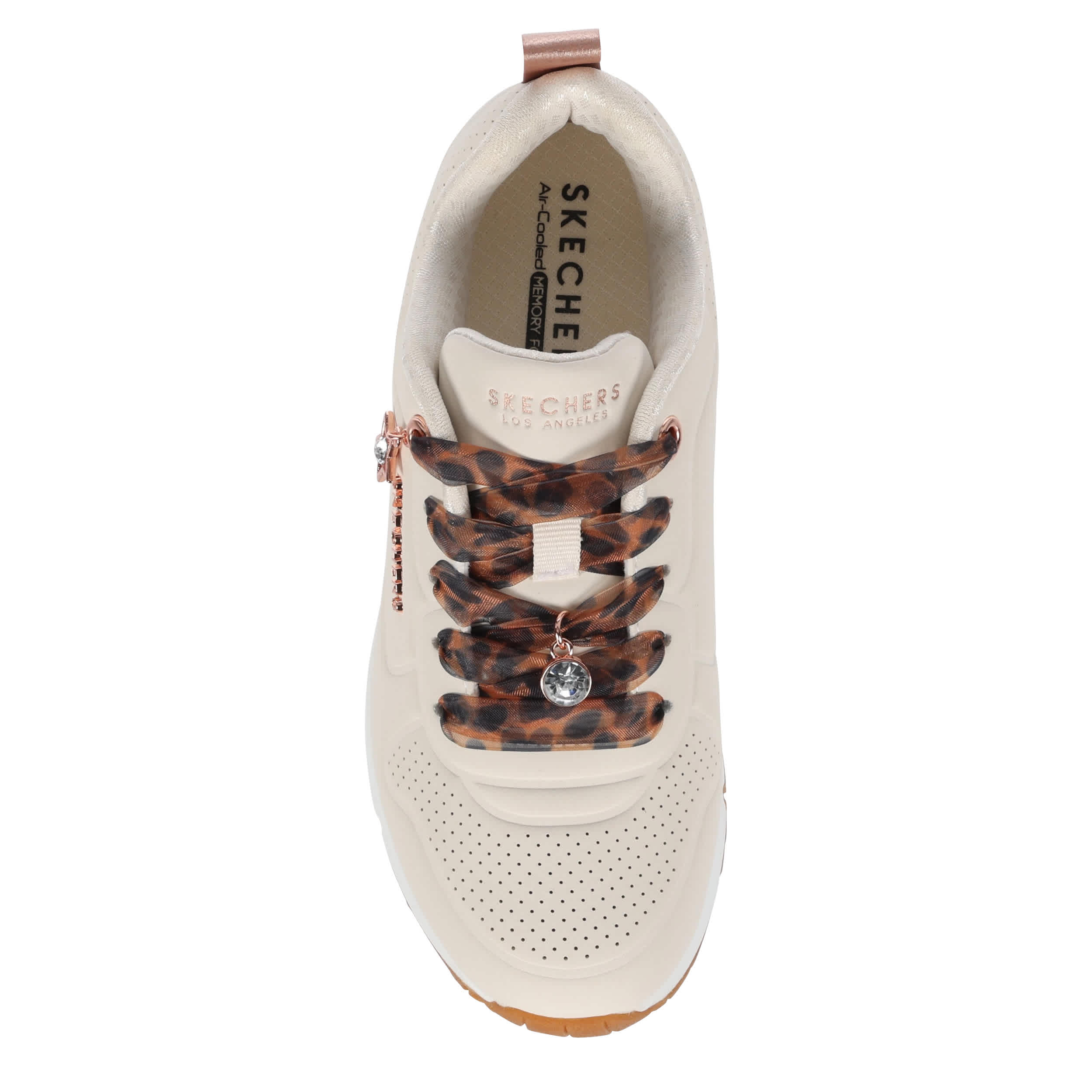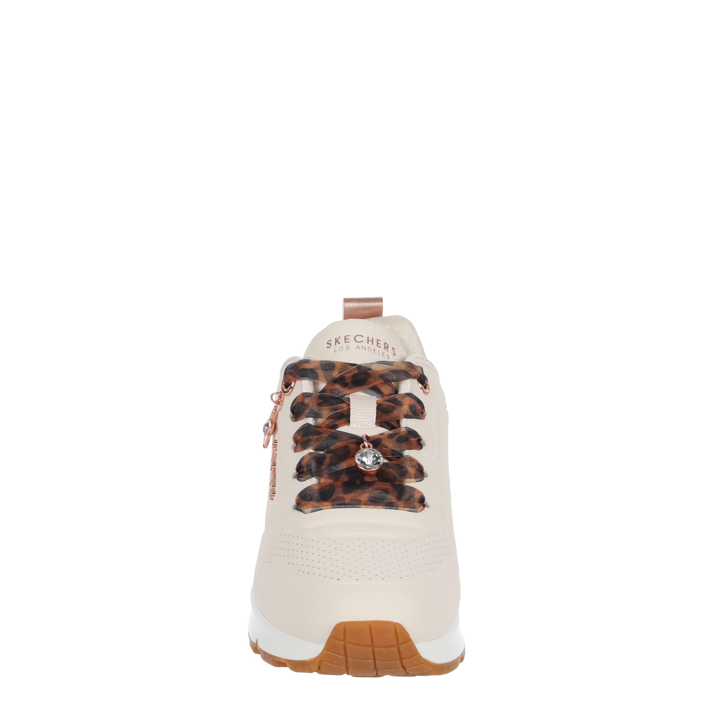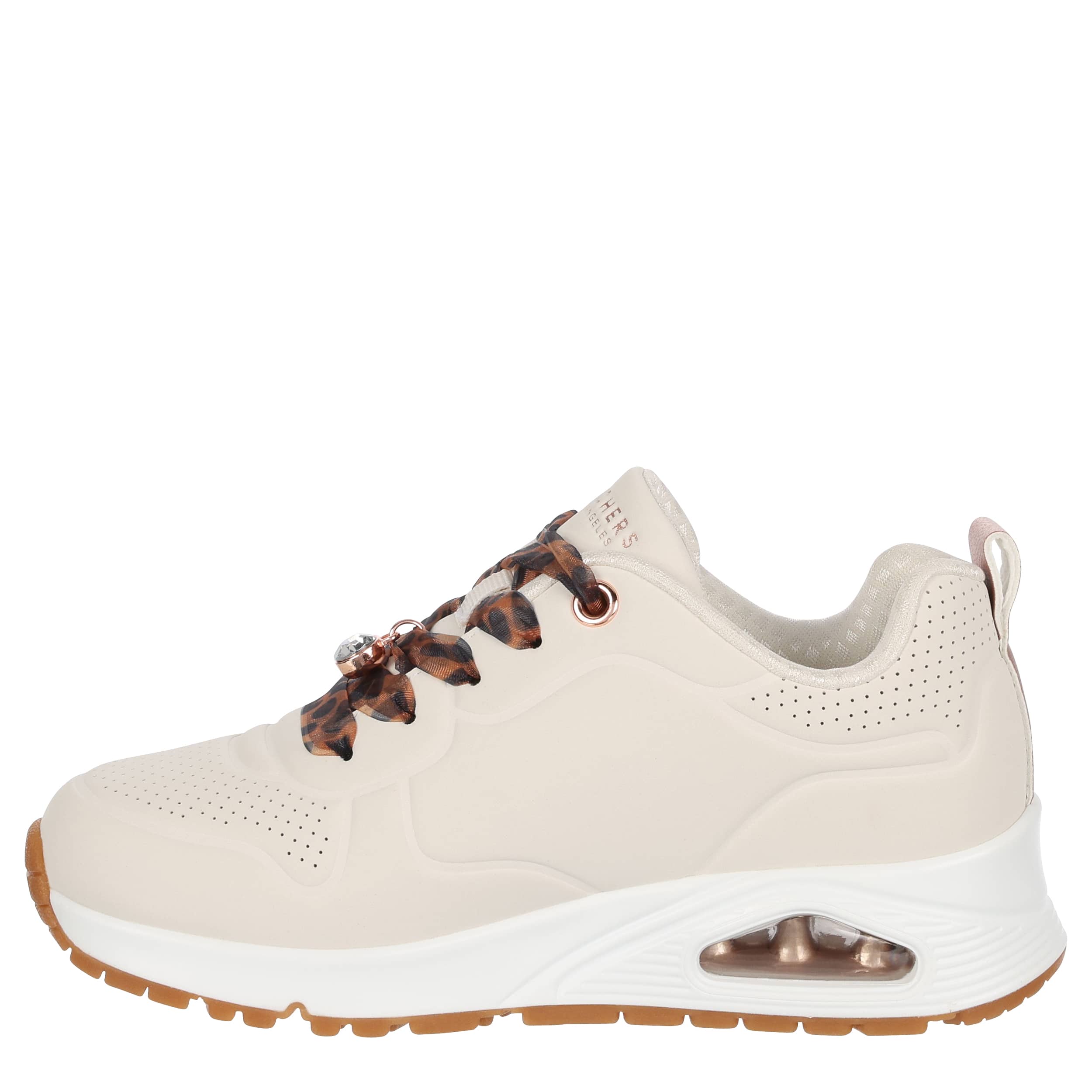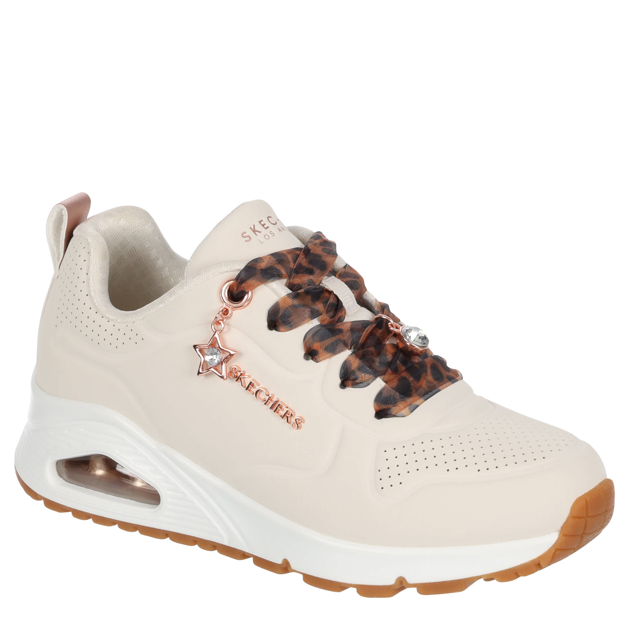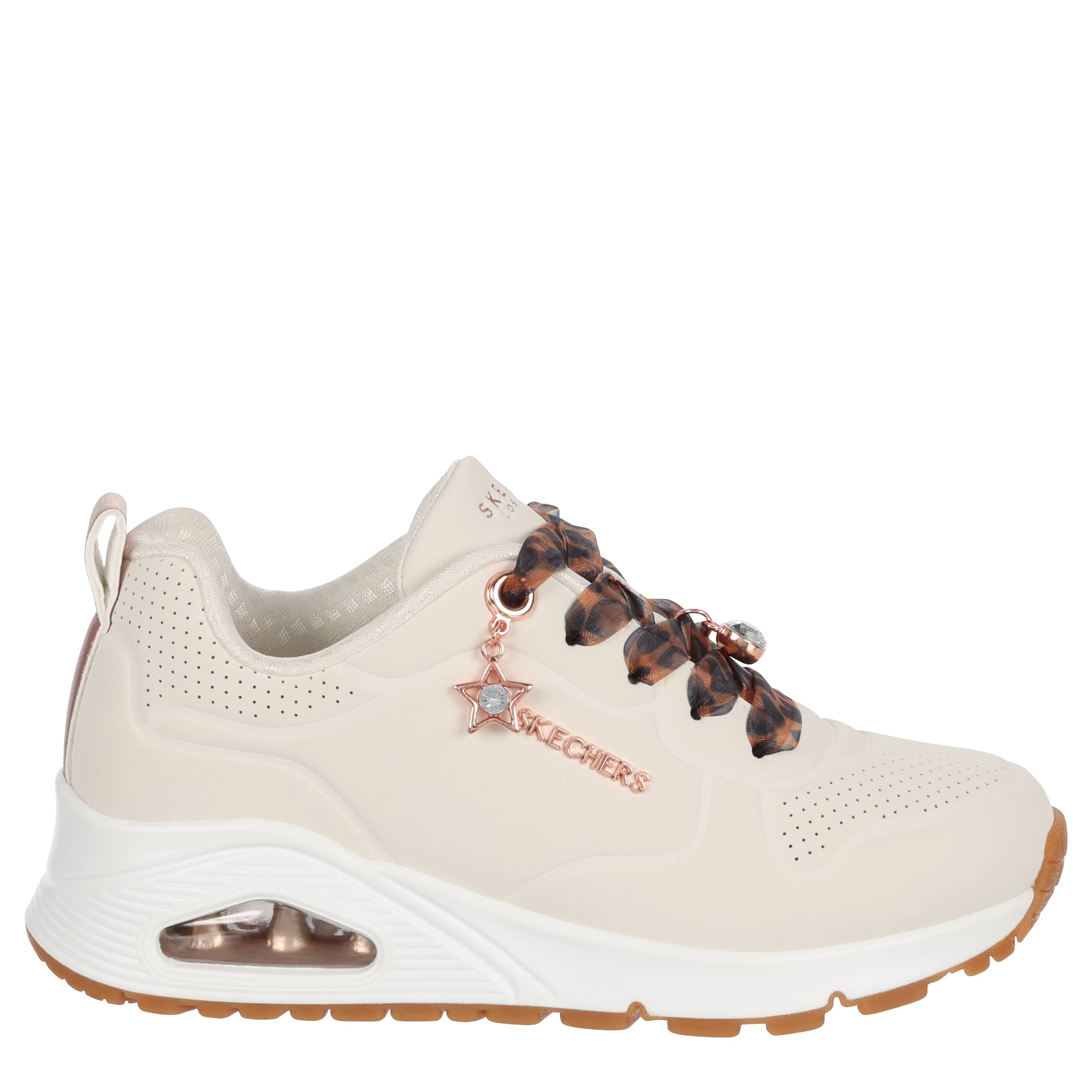 Stay flawlessly on trend in the Skechers UNO Gen1 girls' sneaker. Featuring a perforated durabuck upper with cute charm details for extra style, this lace-up sneaker also has leopard printed laces. The Skechers Air-Cooled Memory Foam® insole & Skech-Air® visible airbag midsole keep her moving comfortably.