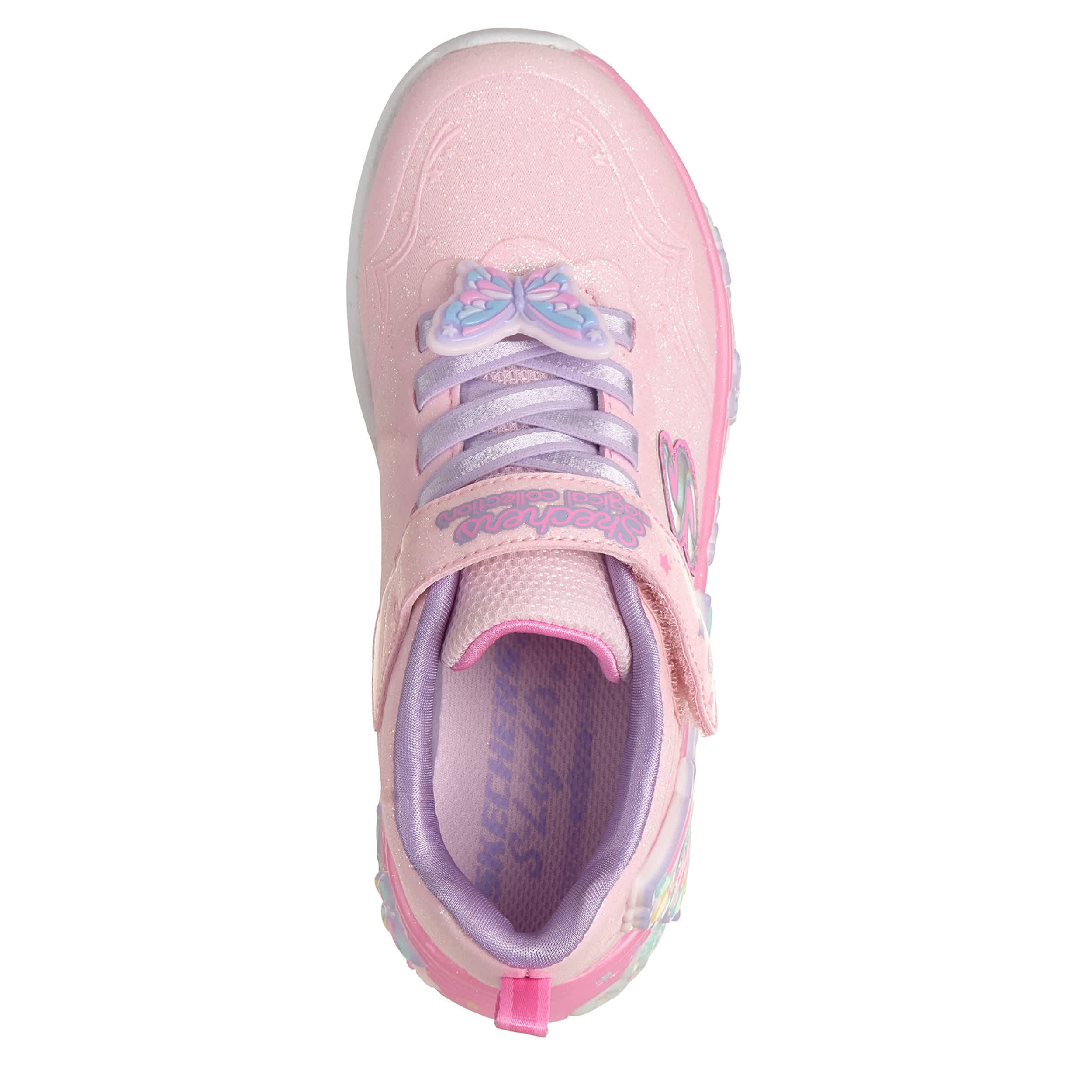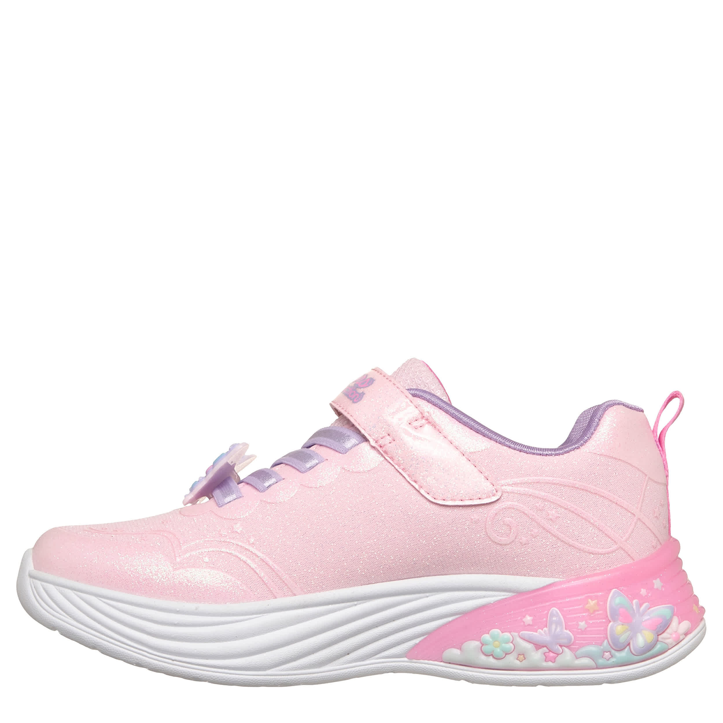 Flutter and float in the Skechers S-Lights®: Butterfly Bliss girls' sneaker. Featuring a glittery mesh & synthetic upper with a lace keeper charm, this easy-on with stretch laces and a hook-and-loop strap is part of the Magical Collection®. Her steps are cushioned while the flexible outsole has traction to keep her grounded.