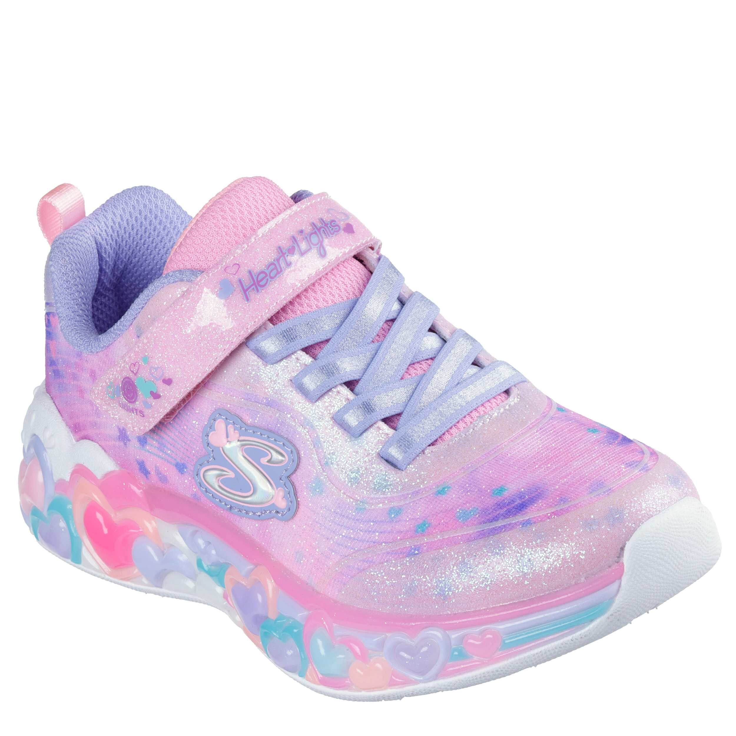 She'll love the lit fun of the Skechers S-Lights®:Eternal Heart Lights light up sneaker. Featuring a sparkle mesh & glitter patent leather upper, this slip-on with stretch laces and a hook-and-loop strap allows for easy Adaptive Closure. Her steps are cushioned while the flexible outsole has traction to keep her grounded.
