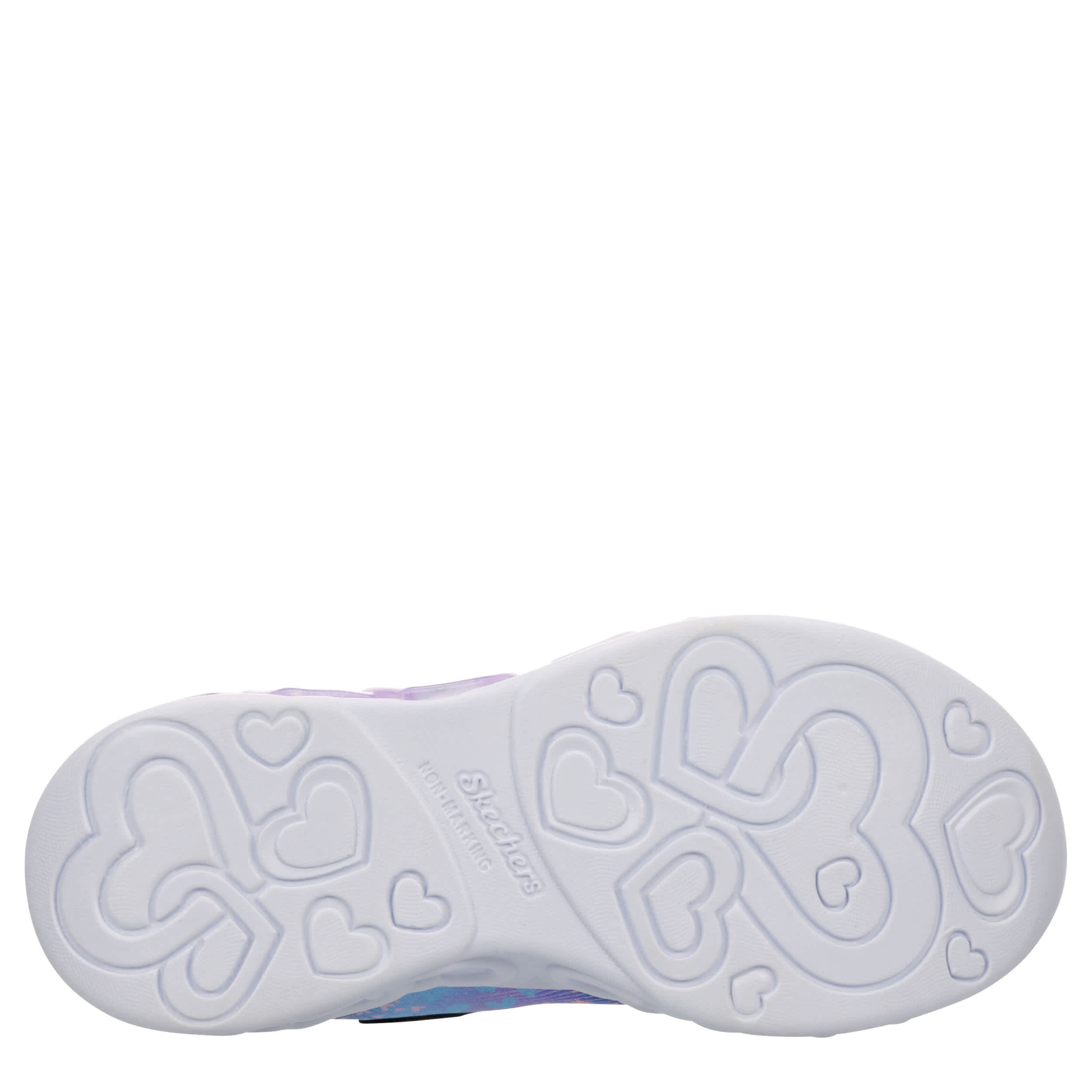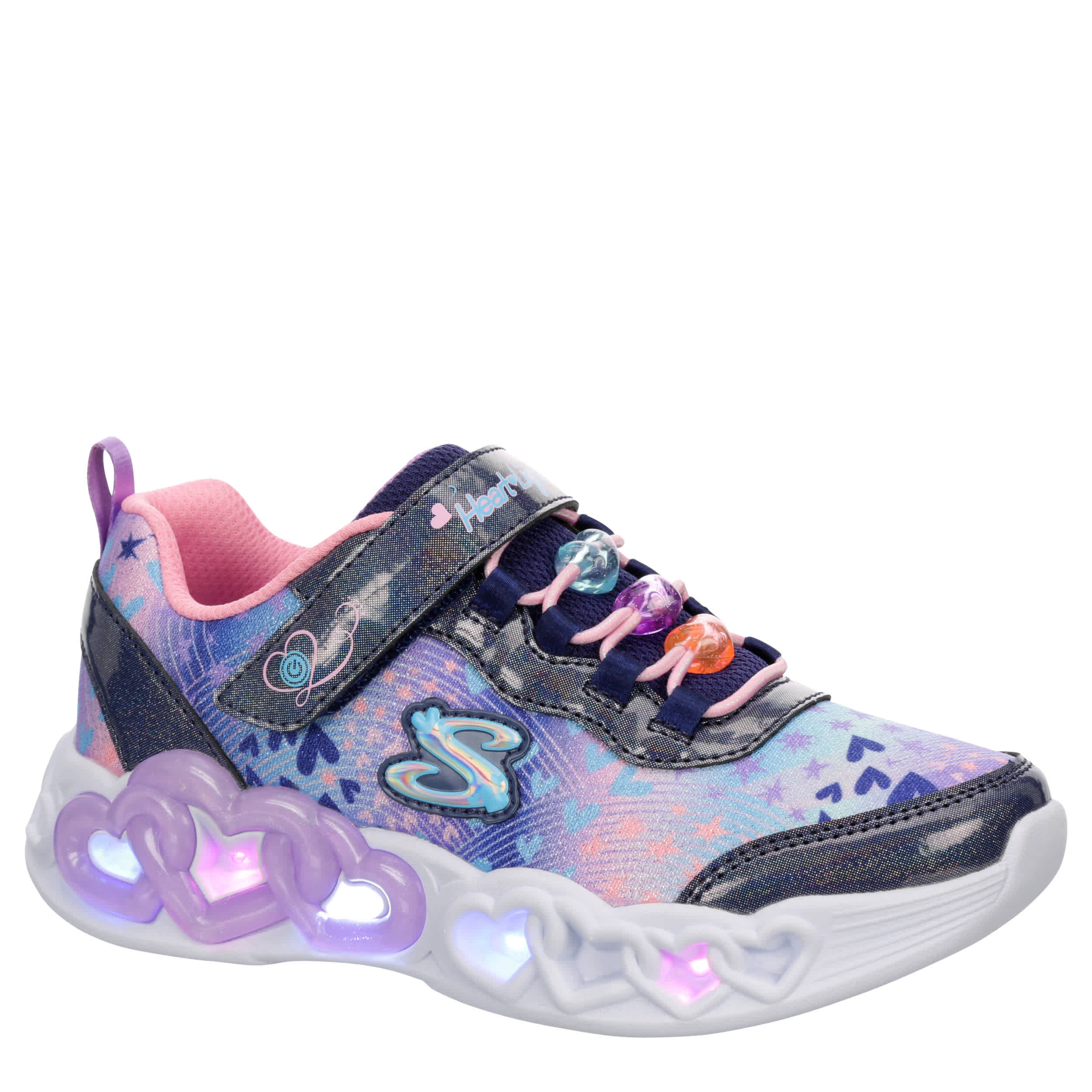 She'll delight in the magical Skechers Heart Lights® Infinite Heart Lights - Heart Jewels girls' light up sneaker. Featuring a printed sparkle mesh upper with synthetic overlays, this heart charm laced shoe also has an adjustable instep strap with a light up 'heart chain' for a cute finish. The insole & shock-absorbing midsole offer comfortable support.