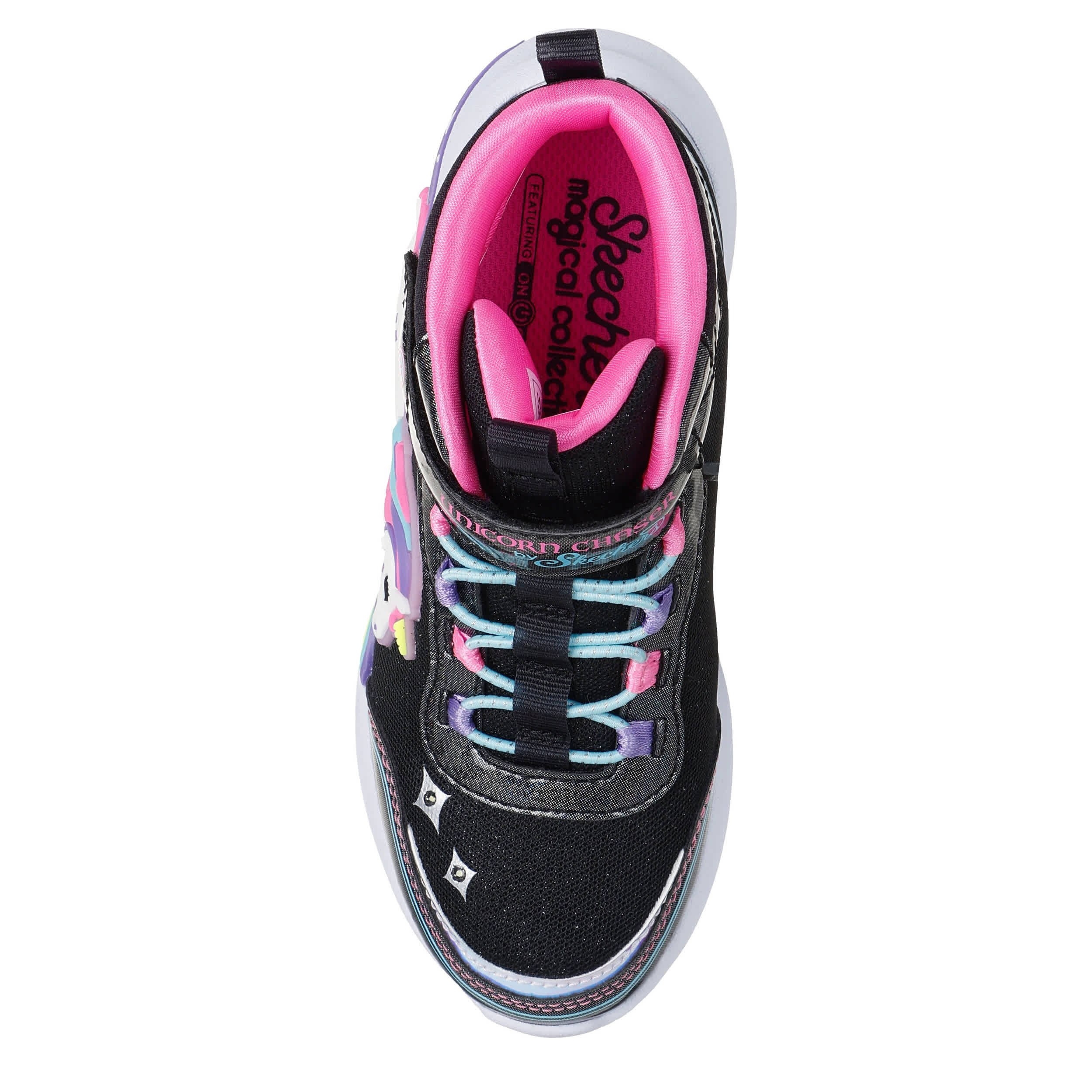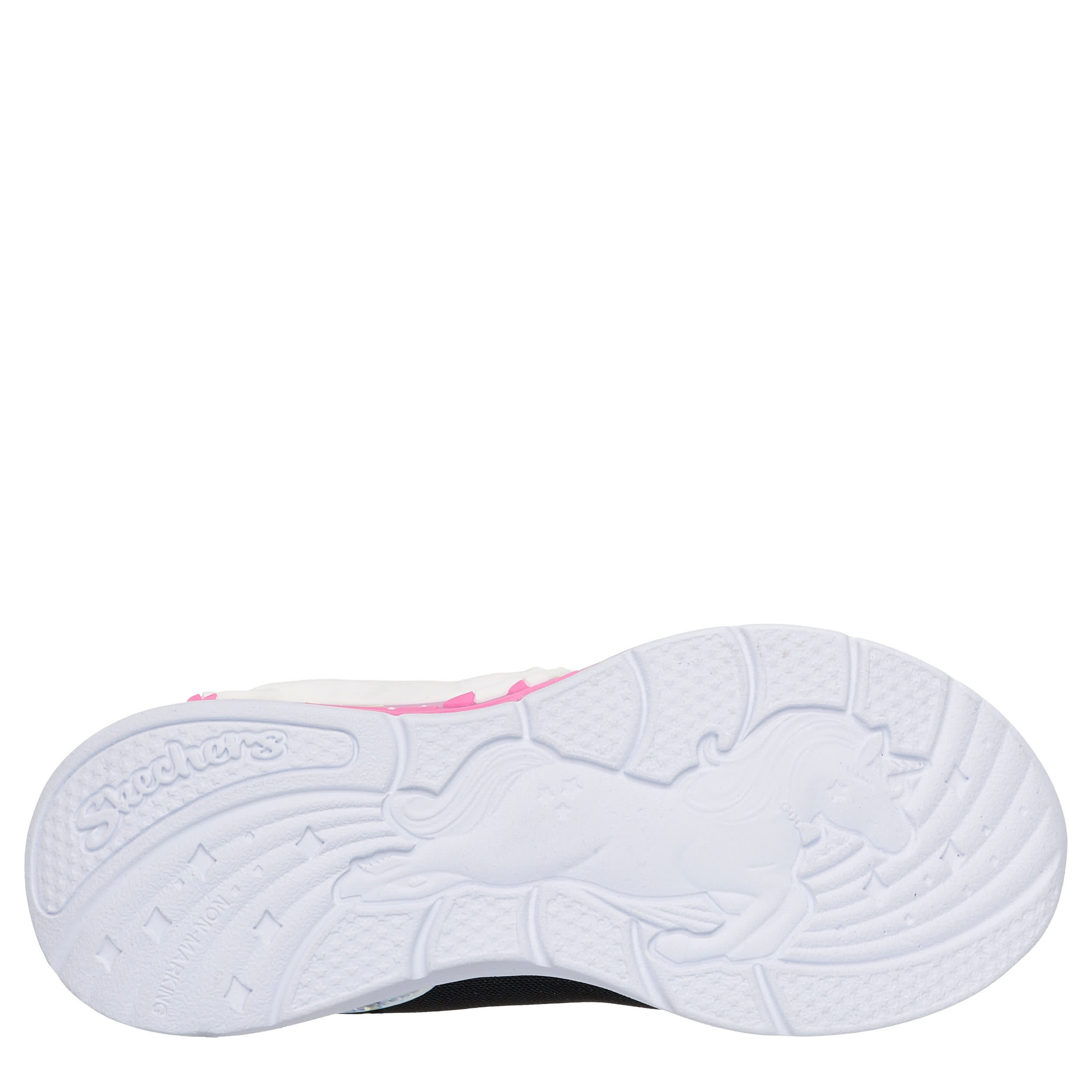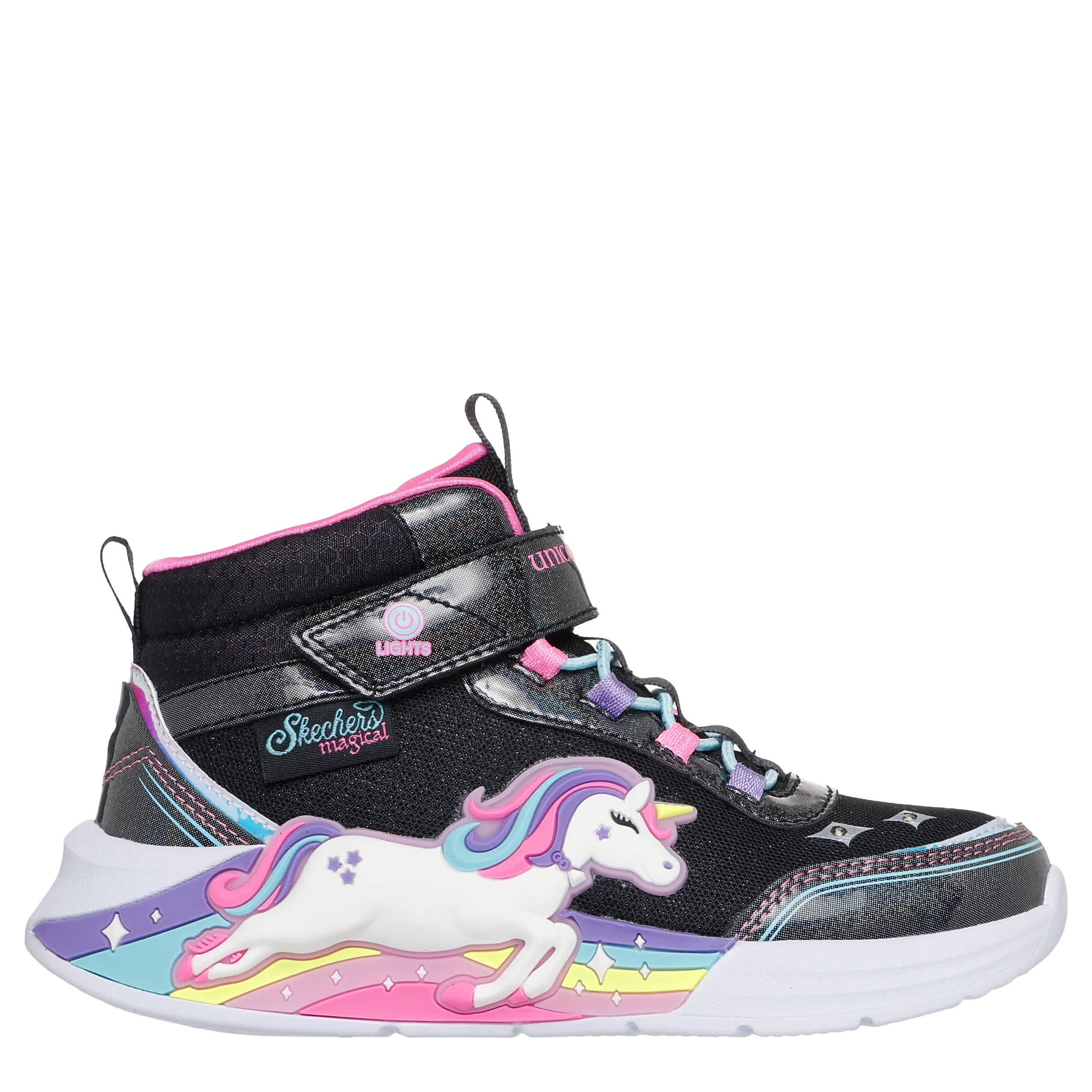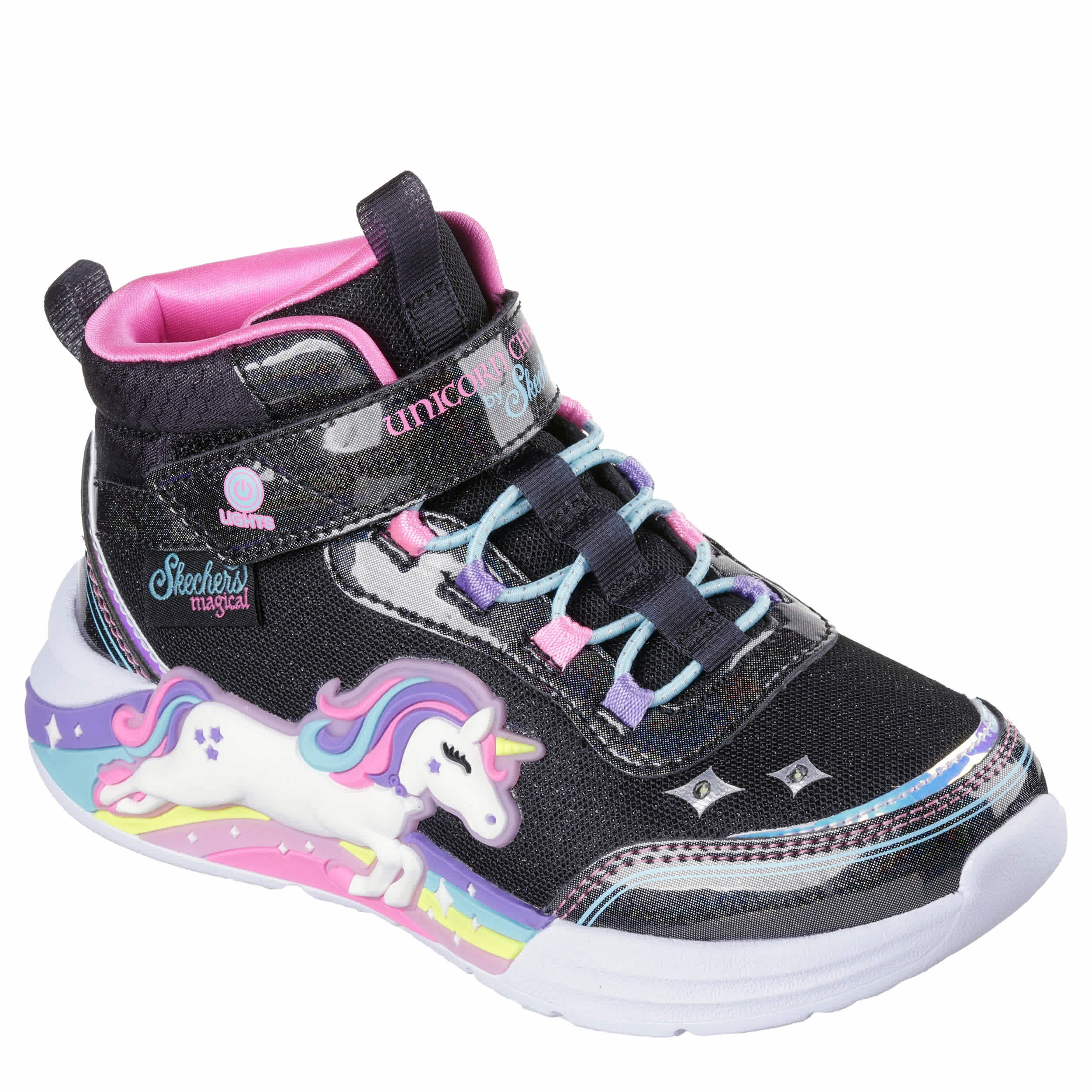 Whatever the season, let the magic follow with the Skechers S-Lights®: Unicorn Chaser - Jumping Magic girls' snow boot. Featuring a glitter finish upper with a unicorn-themed light-up design, this stretch-laced mid-top is part of the Magical Collection®. Her steps are cushioned while the flexible outsole has traction to keep her grounded.