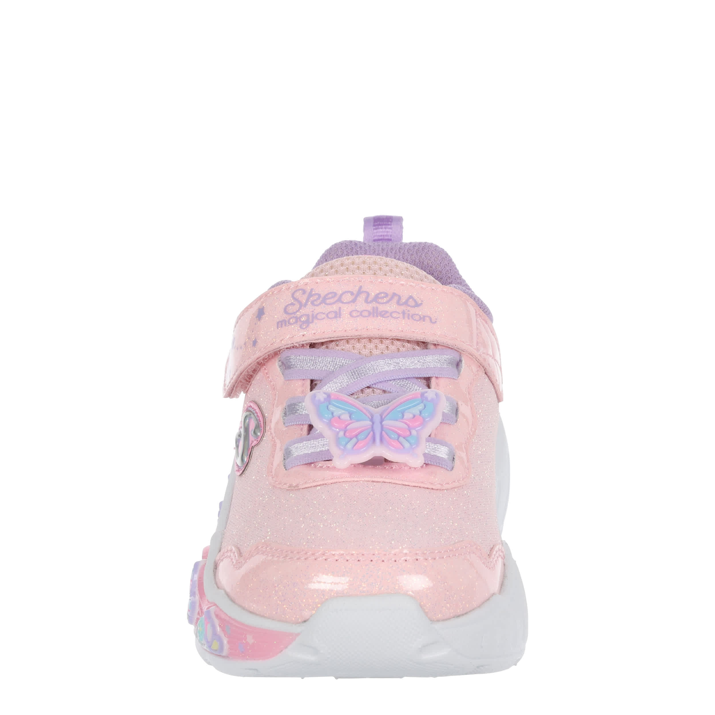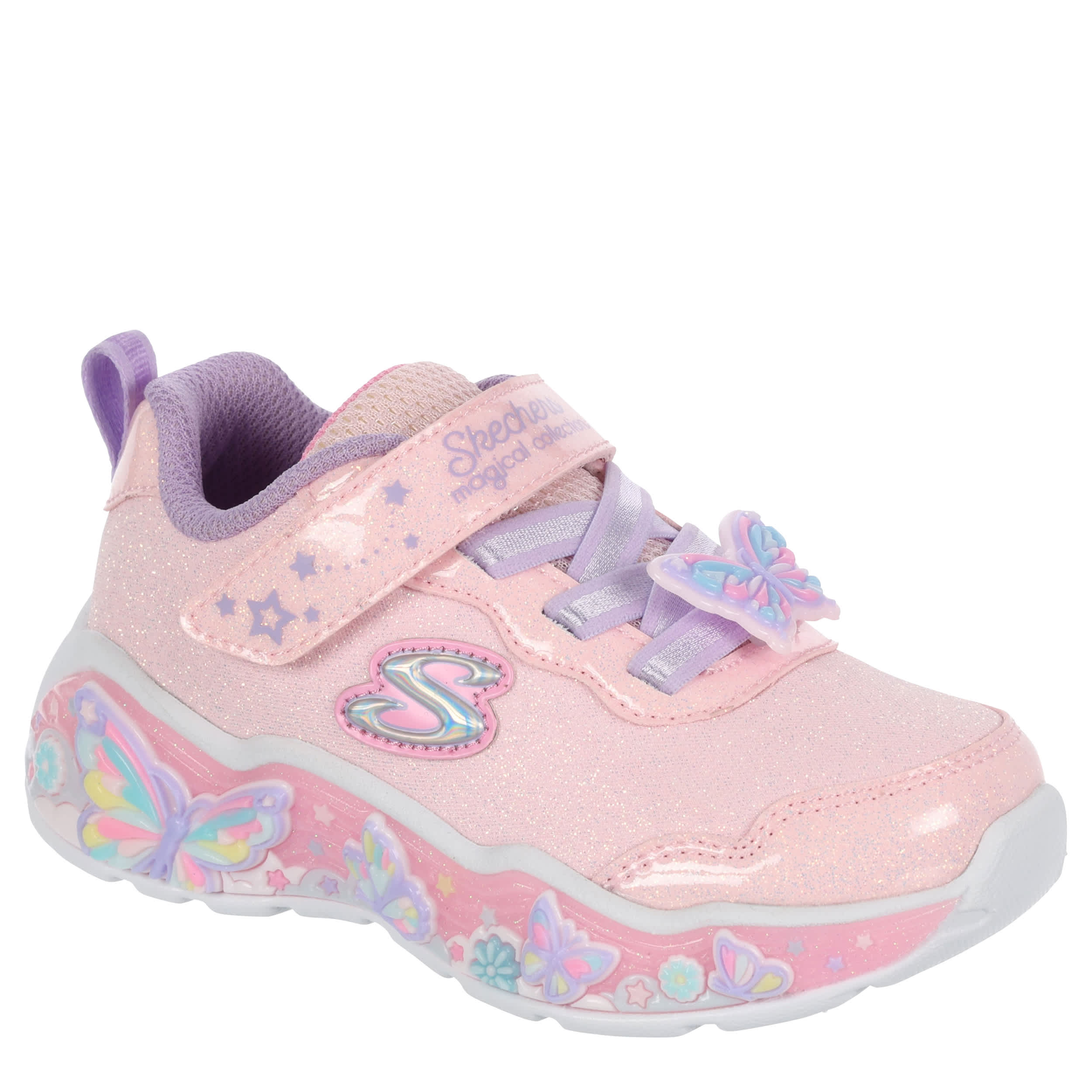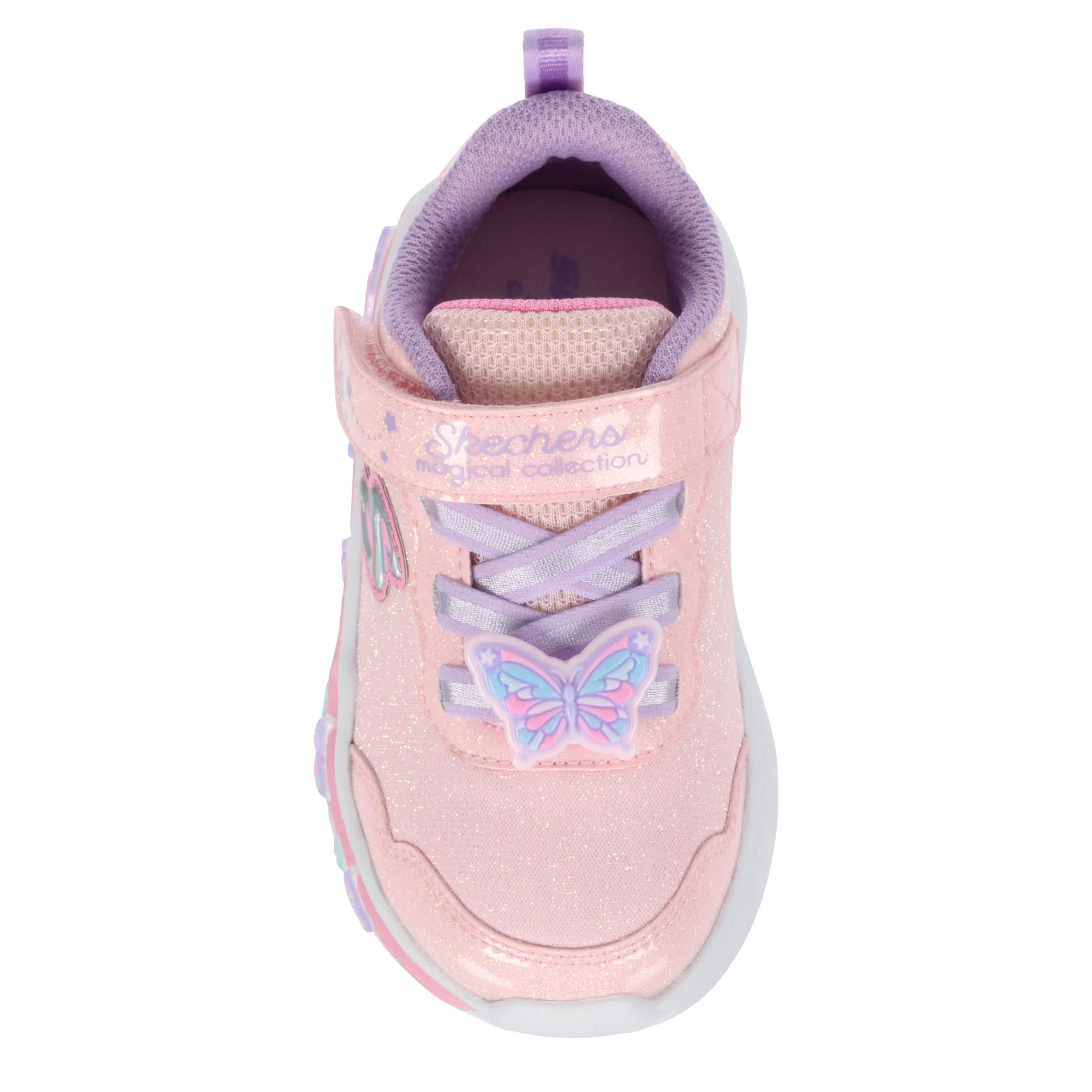 Flutter and float in the Skechers S-Lights®: Lil Butterfly Bliss infant girls' sneaker. Featuring a glittery mesh & synthetic upper with a lace keeper charm, this easy-on with stretch laces and a hook-and-loop strap is part of the Magical Collection®. Her little steps are cushioned while the flexible outsole has traction to keep her grounded.