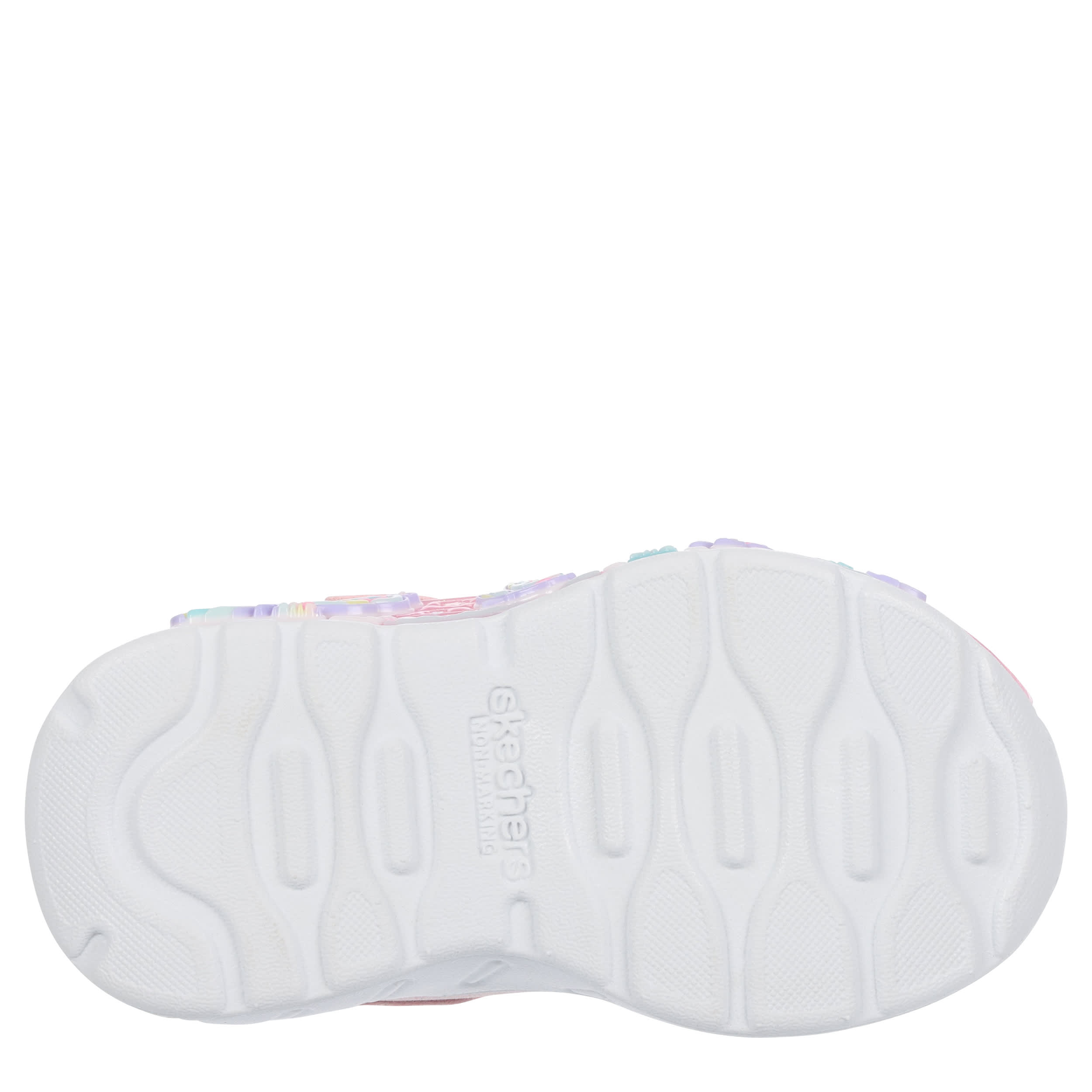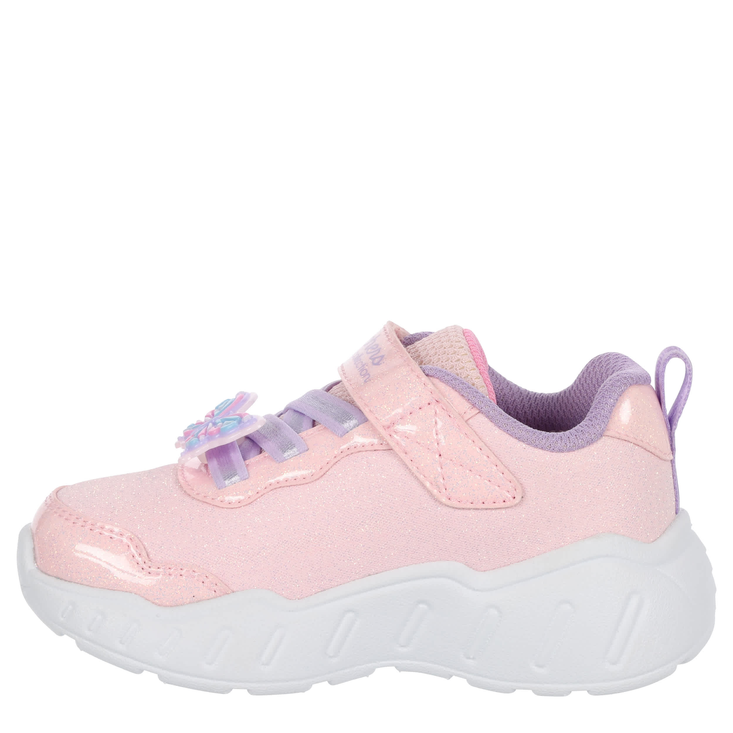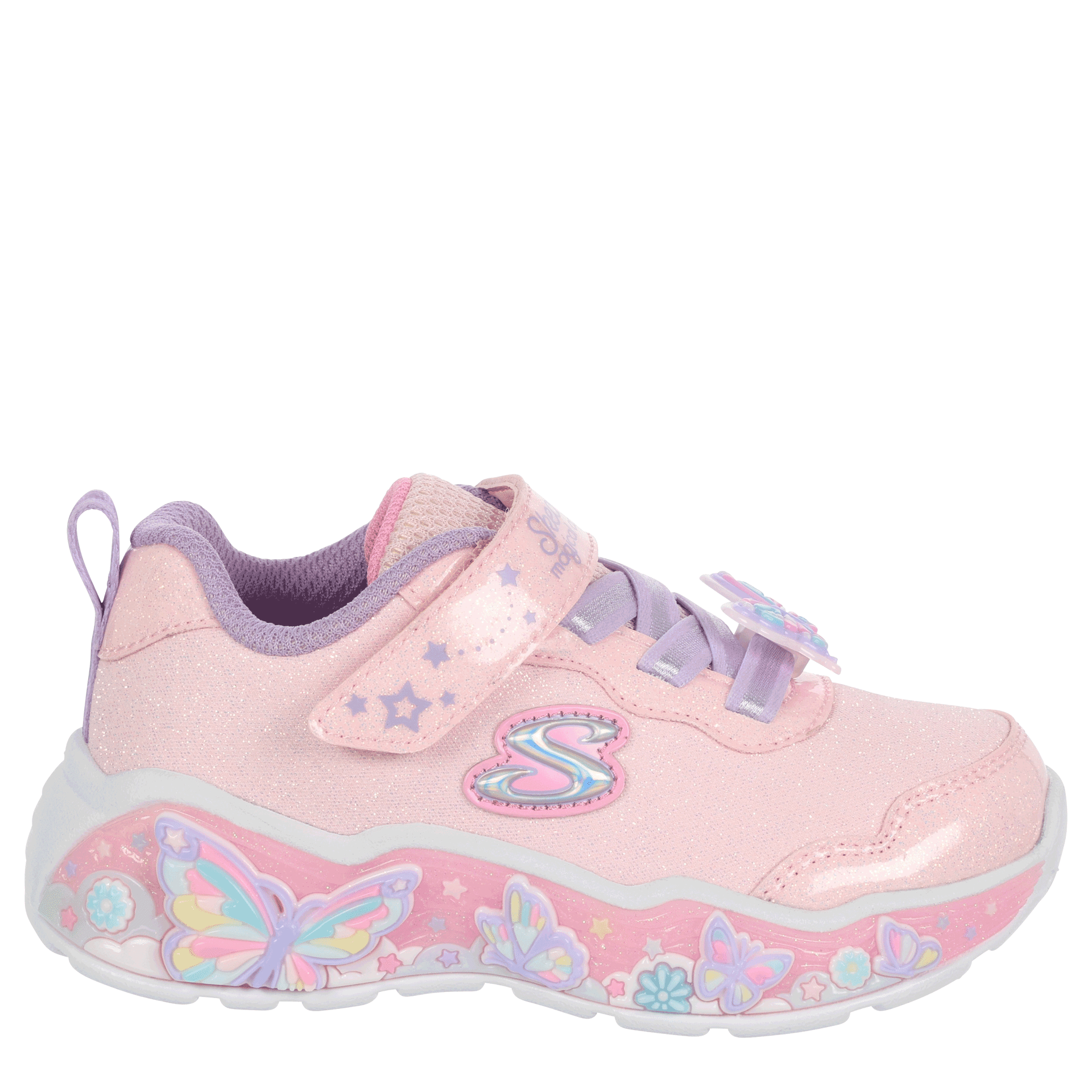 Flutter and float in the Skechers S-Lights®: Lil Butterfly Bliss infant girls' sneaker. Featuring a glittery mesh & synthetic upper with a lace keeper charm, this easy-on with stretch laces and a hook-and-loop strap is part of the Magical Collection®. Her little steps are cushioned while the flexible outsole has traction to keep her grounded.