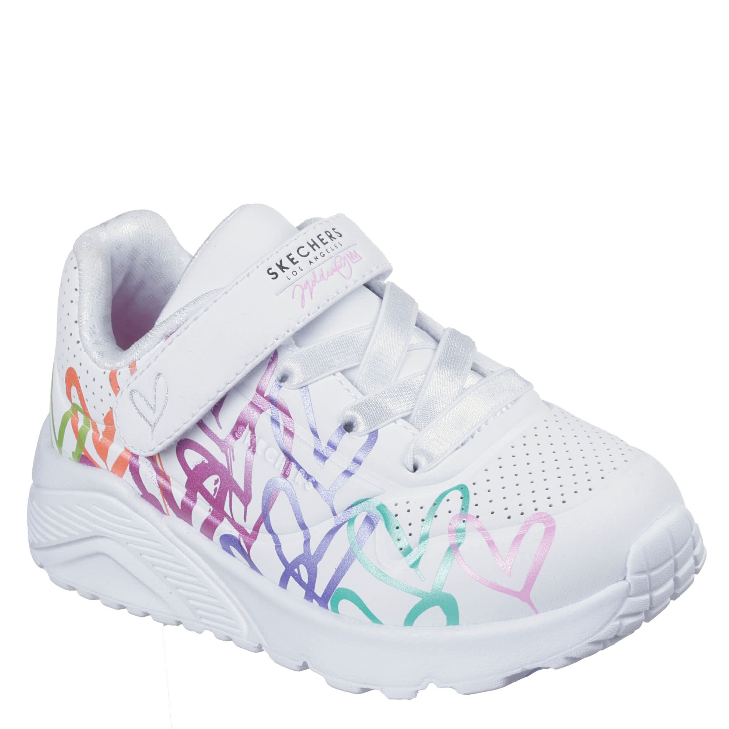 Elevate her summer athleisure wear with the Skechers Street Uno Lite - Graffiti Hearts infant girls' sneaker. Featuring a perforated synthetic upper, this anke strapped shoe adds a fun pop of colorful JGoldcrown heart designs to her tiny wardrobe. The Skechers Air-Cooled Memory Foam® insole & wedge midsole cushion every step, while the outsole offers flexible traction.