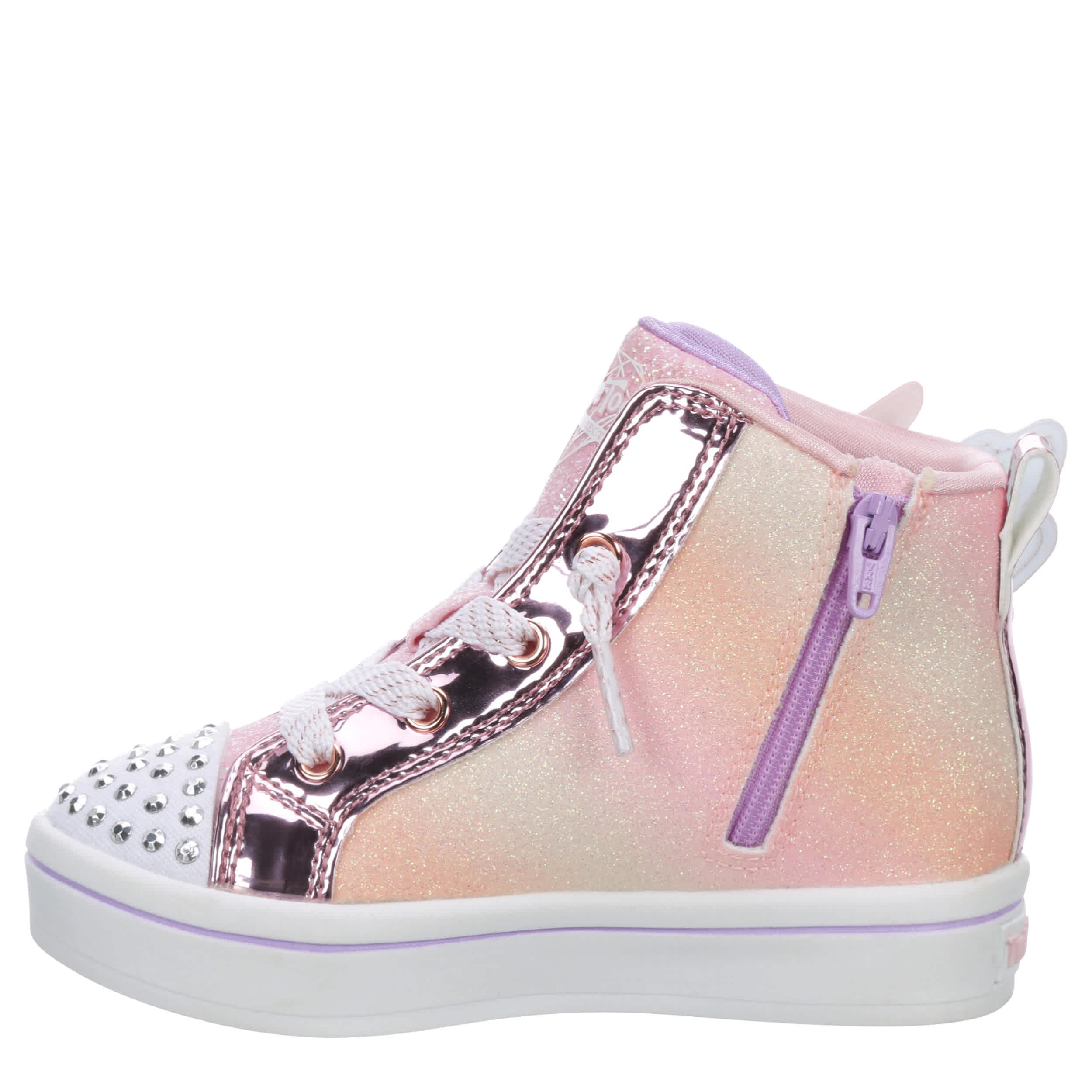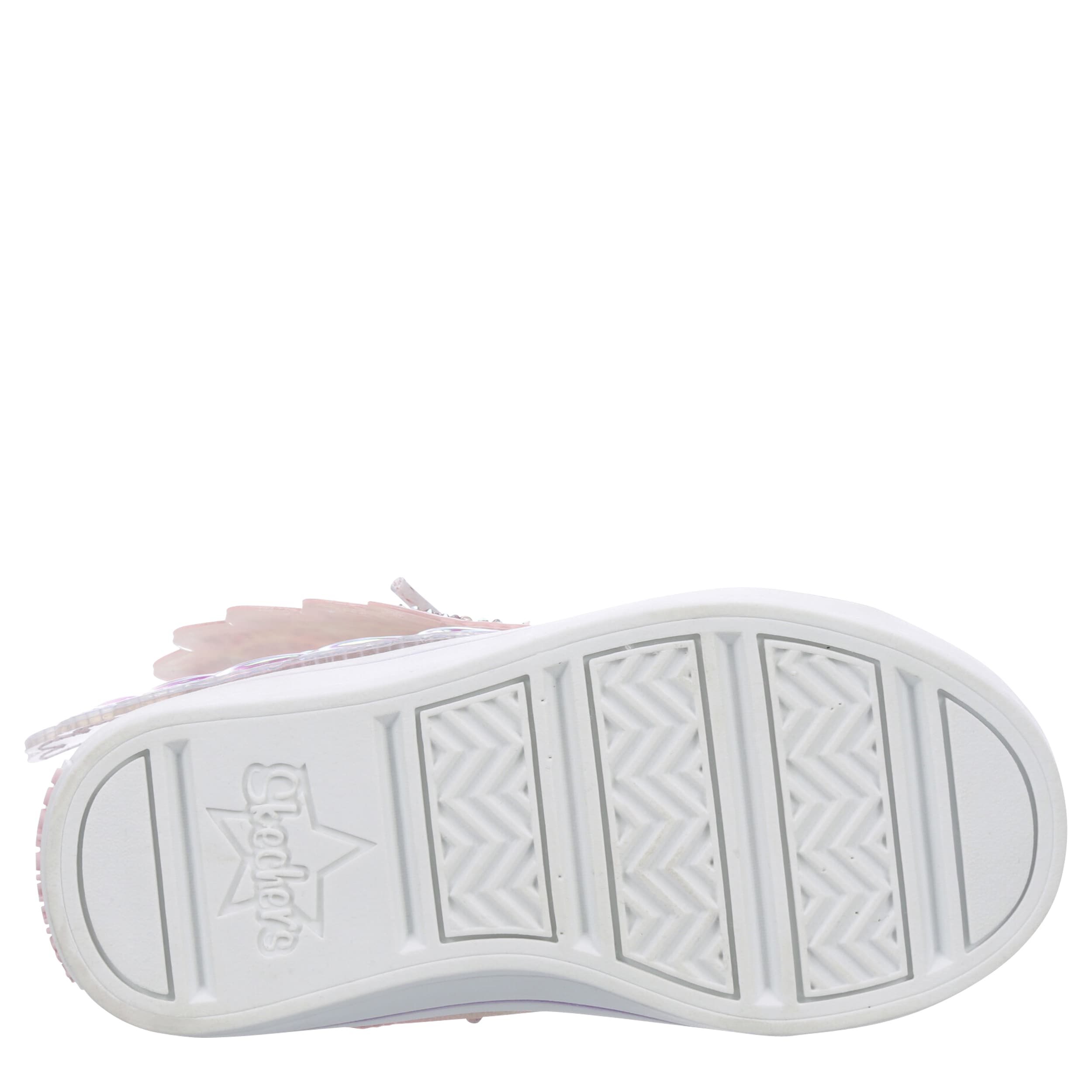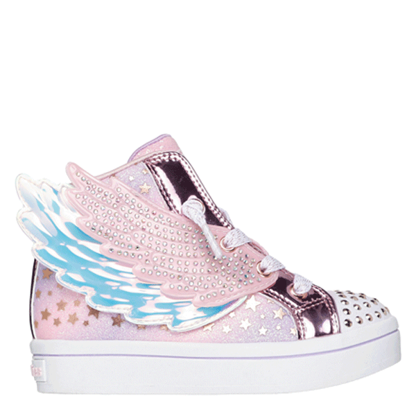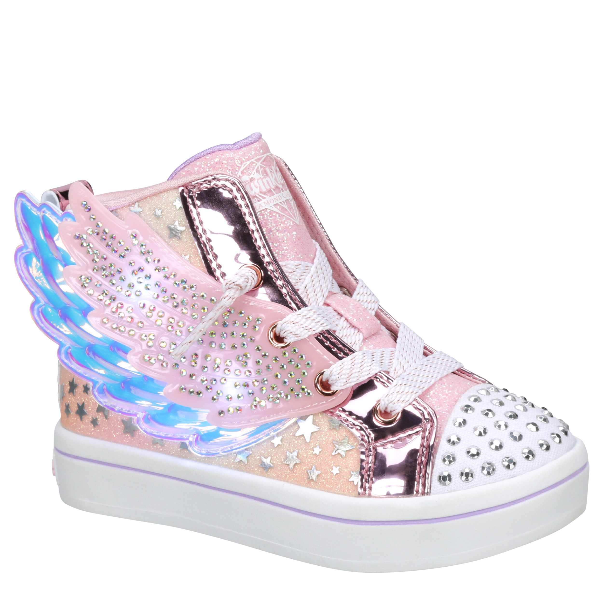 Let her style take flight in the Skechers Twinkle Toes: Twi-Lites 2.0 - Dreamy Wings infant girls' sneaker. Featuring a glittery synthetic upper with a rhinestud toe cap, this lace-up sneaker has a side zipper and wing tech that lights up. The insole comforts her little foot, while the outsole provides durability.