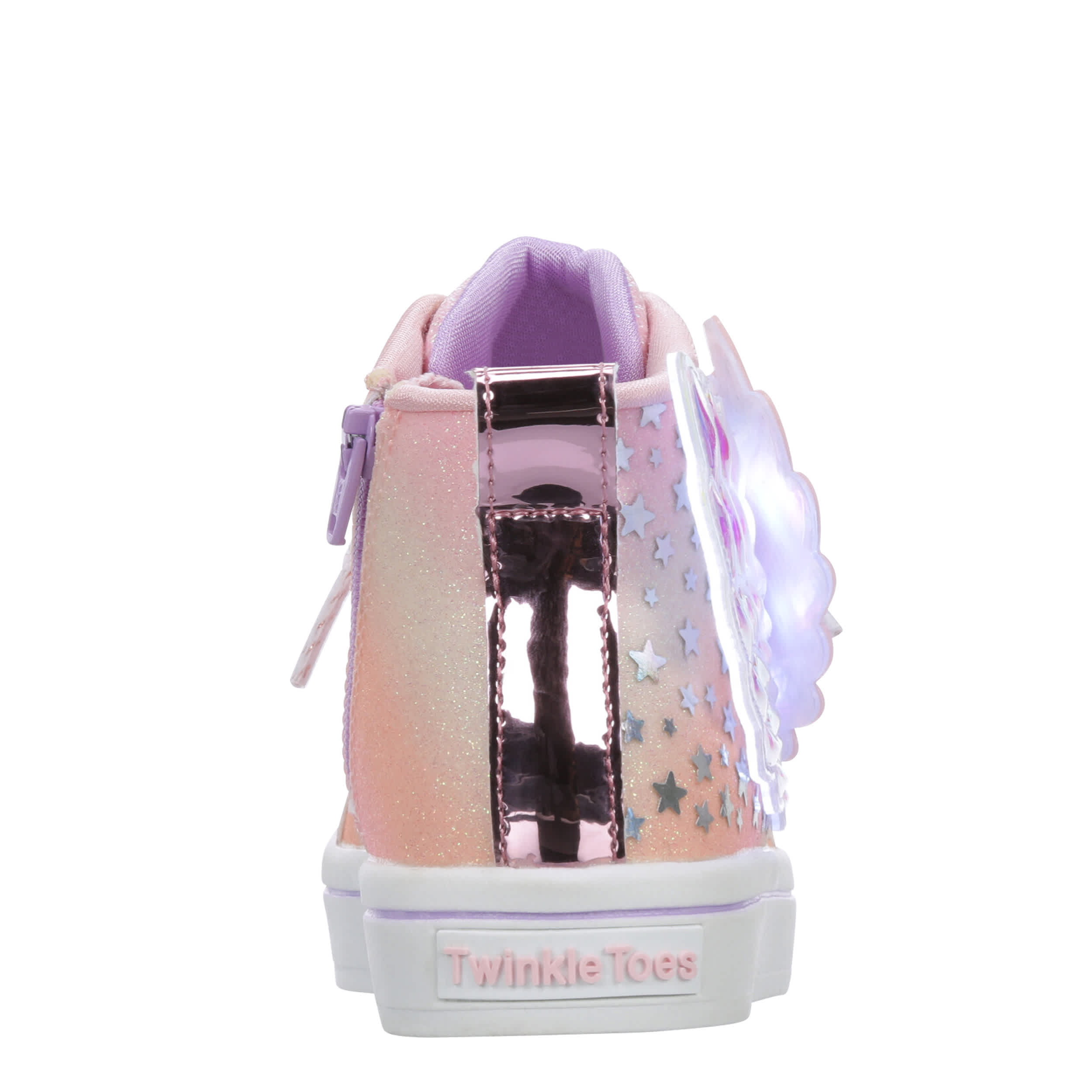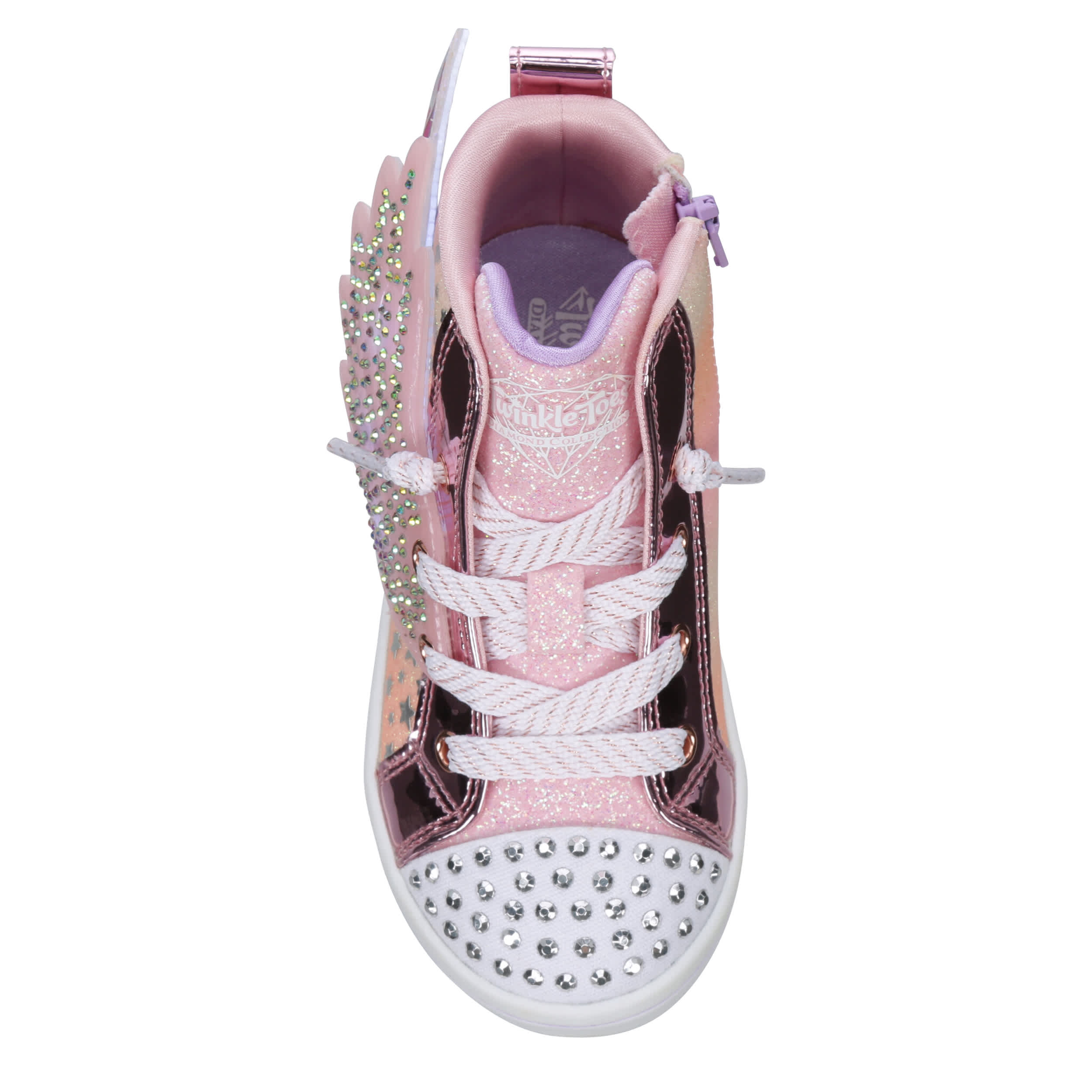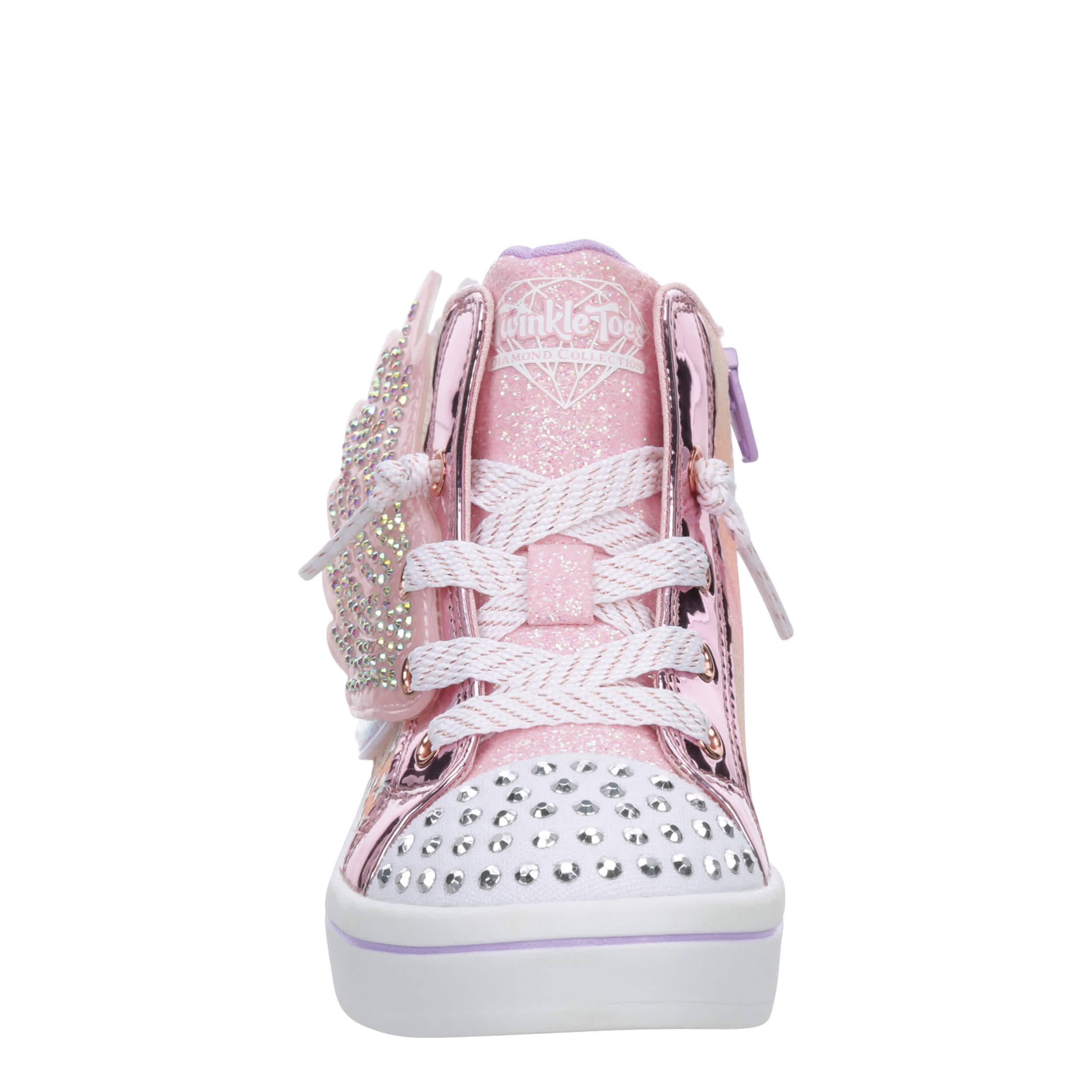 Let her style take flight in the Skechers Twinkle Toes: Twi-Lites 2.0 - Dreamy Wings infant girls' sneaker. Featuring a glittery synthetic upper with a rhinestud toe cap, this lace-up sneaker has a side zipper and wing tech that lights up. The insole comforts her little foot, while the outsole provides durability.