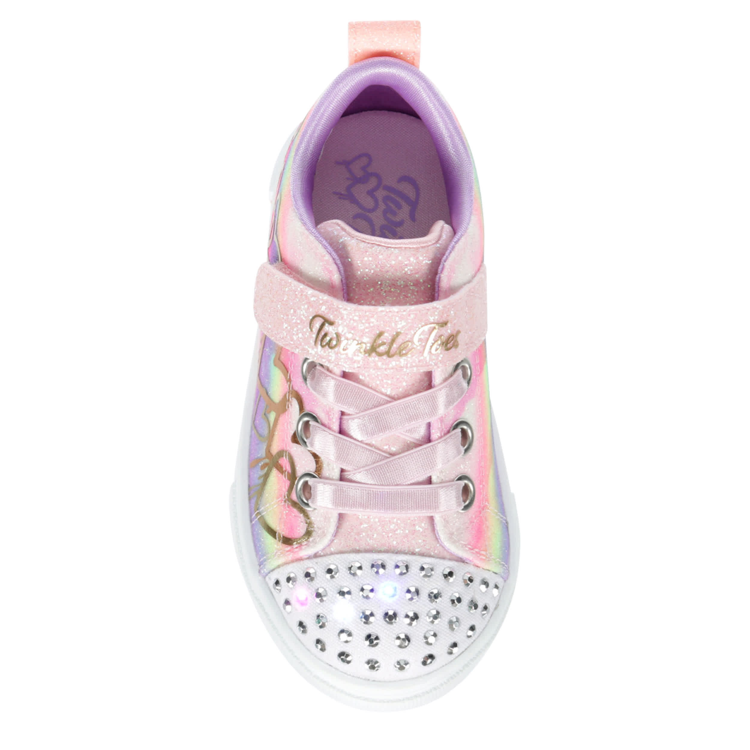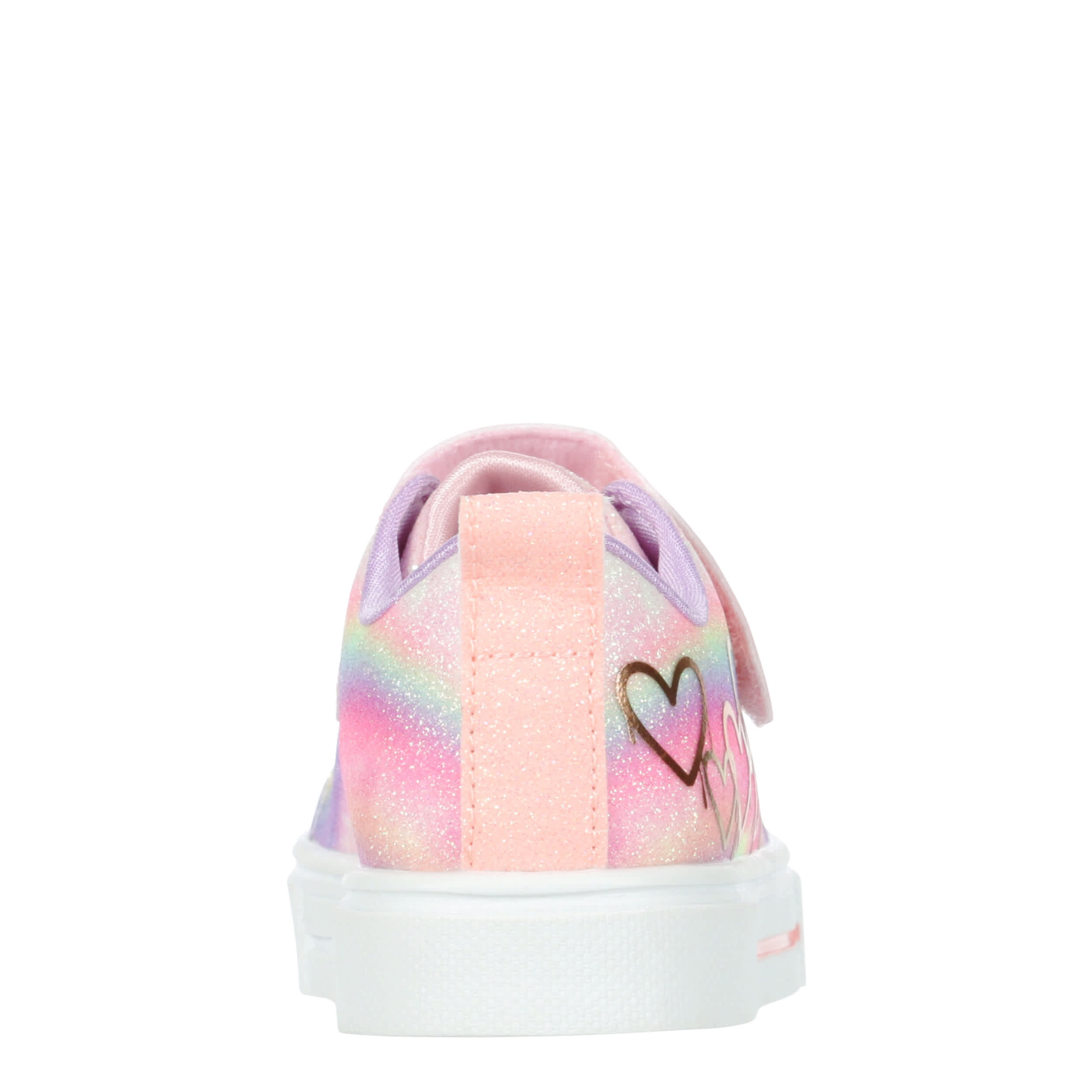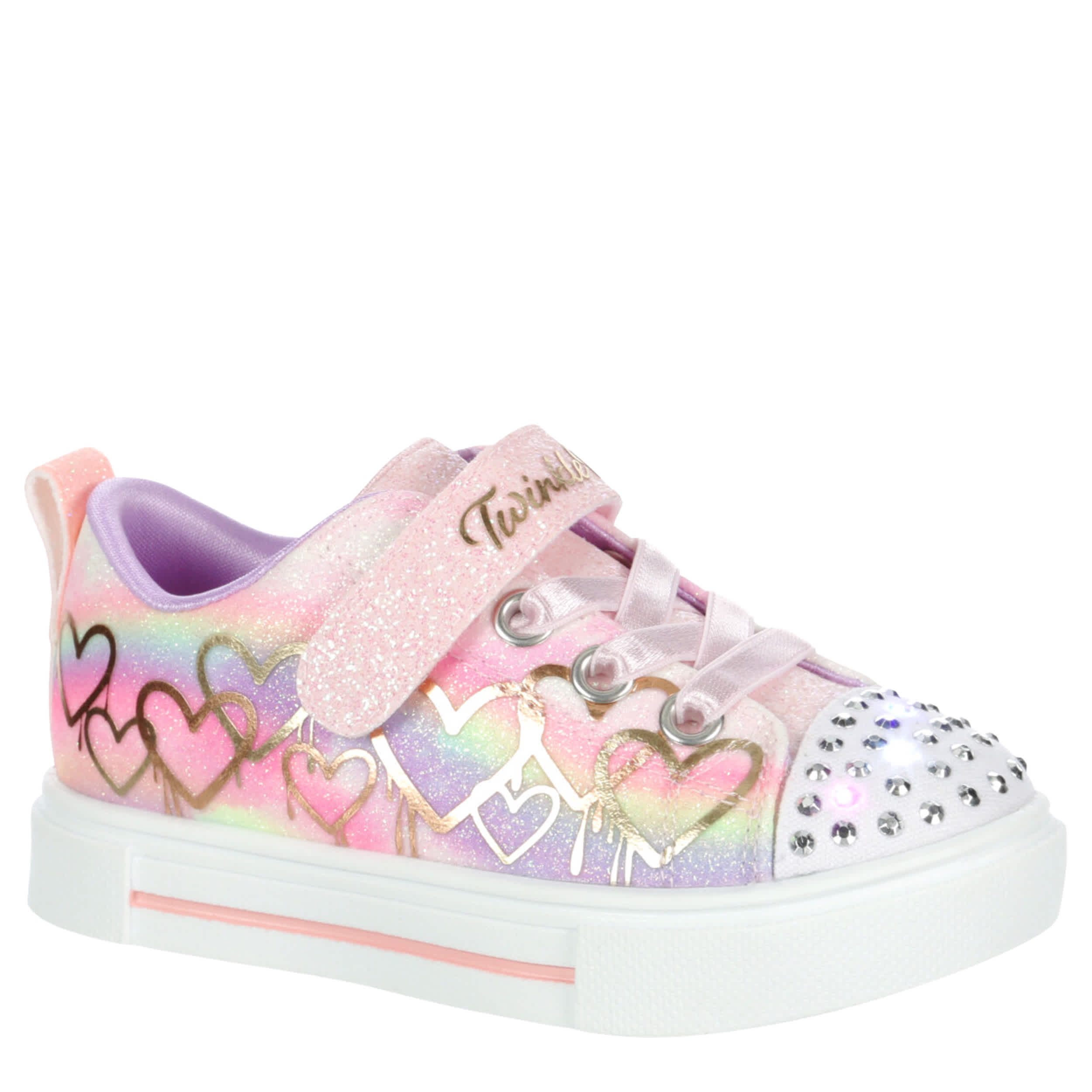 Fill her little heart with light in the Twinkle Toes®: Twinkle Sparks - Ombre Love infant girls' light up sneaker from Skechers. With a glittery, metallic heart drip upper featuring satin laces, this shoe has a light-up toe and secure instep strap. The midsole absorbs shock, while the outsole offers flexible traction.