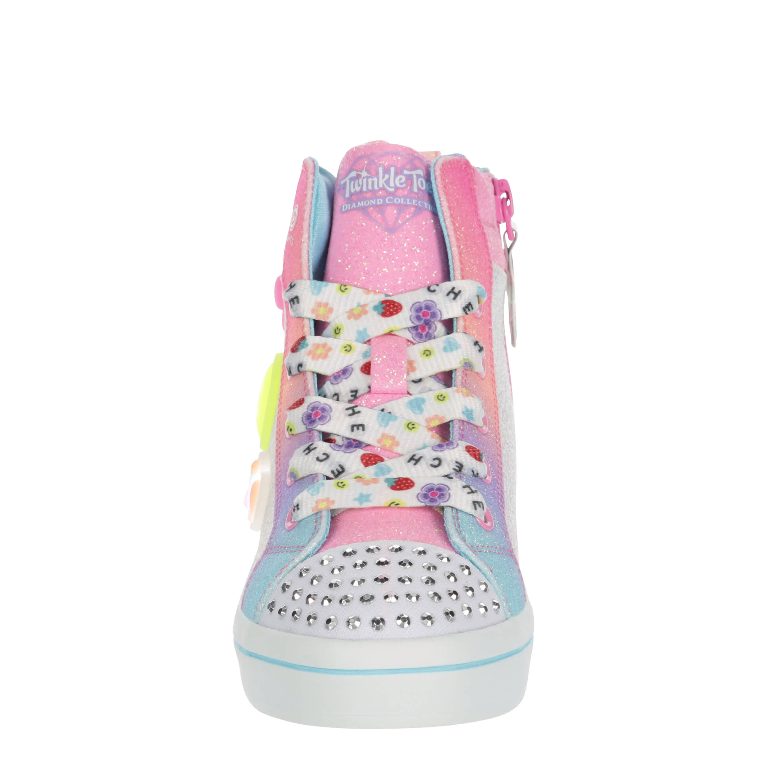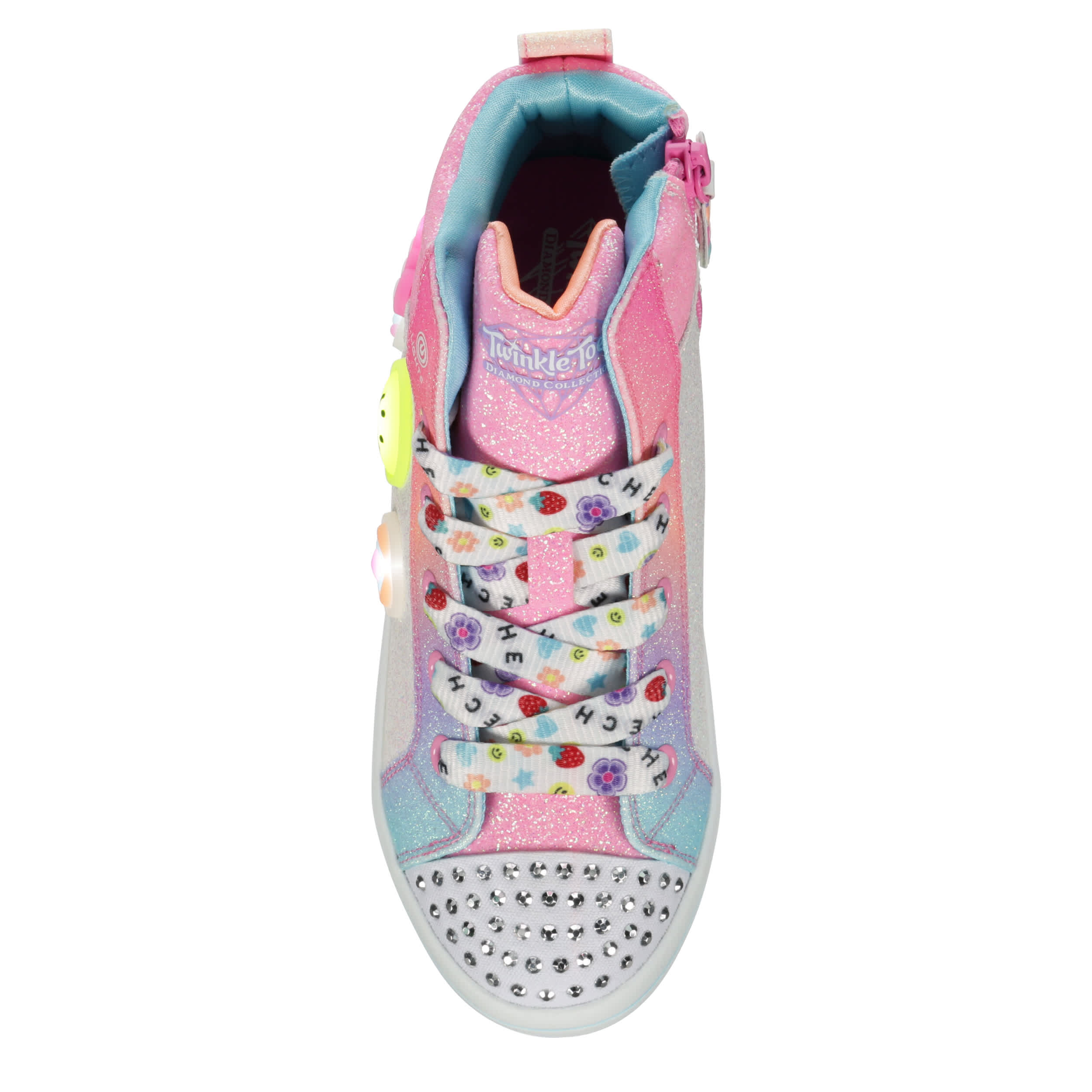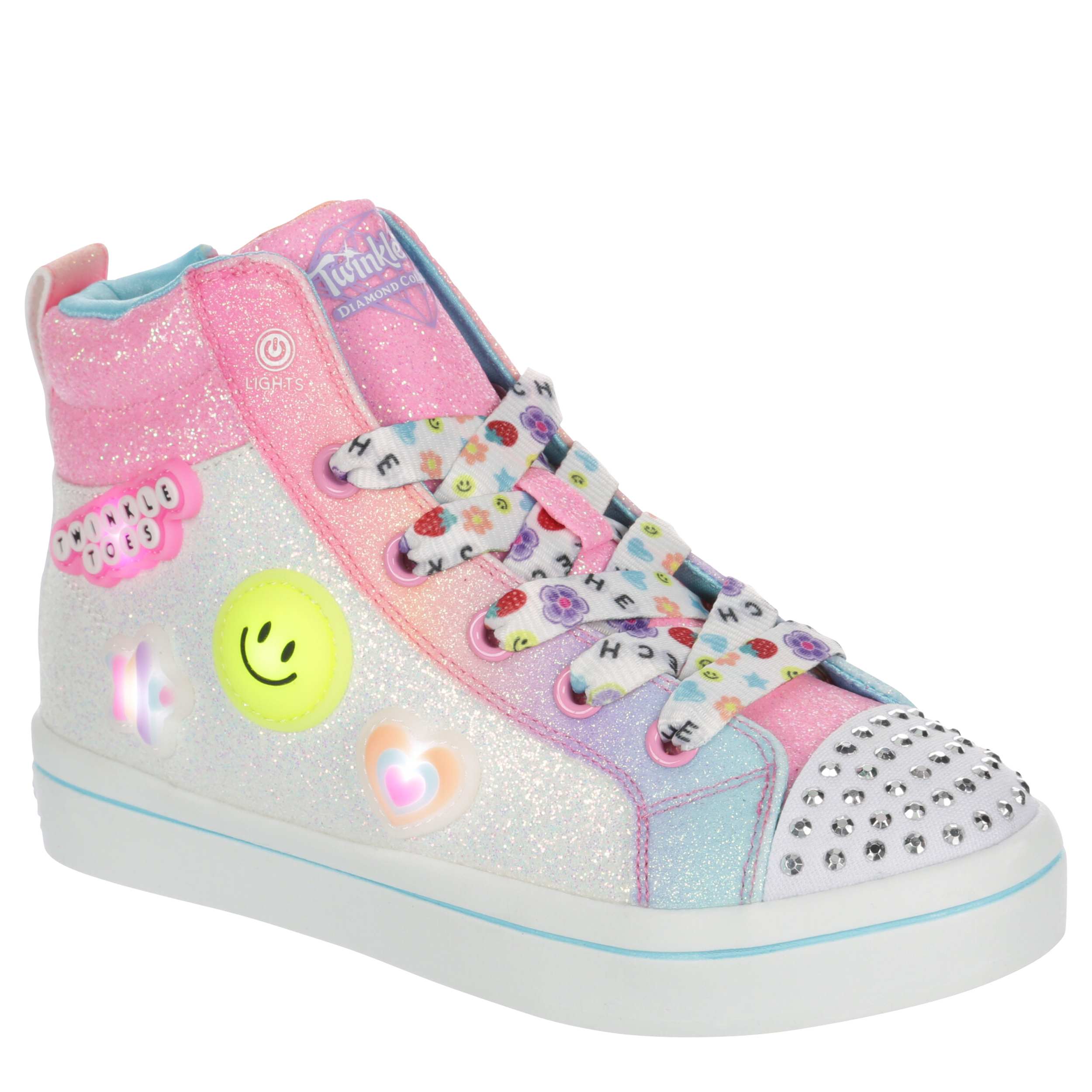 Follow the joy in the Skechers Twinkle Toes®: Twi-Lites 2.0 - Bit of Happiness light up sneaker. Featuring a glittery upper with a rhinestone toe cap and on/off button, this lace-up sneaker has a side zipper and bits that light up. The insole comforts her foot, while the outsole provides durability.