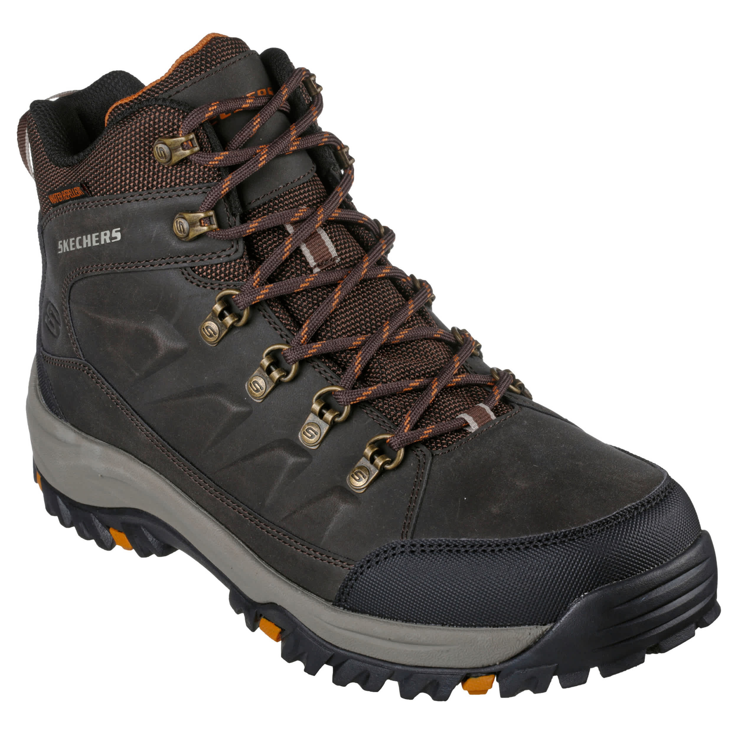 Run for adventure in the rugged Skechers Relaxed Fit®: Relment - Daggett hiking boot. With a water-repellent mesh & synthetic upper featuring a rear pull tab for easy entry, this roomy boot has an outdoor trail design. The Skechers Air-Cooled Memory Foam® insole cushioning leaves you feeling refreshed while the outsole ensures traction and stability.