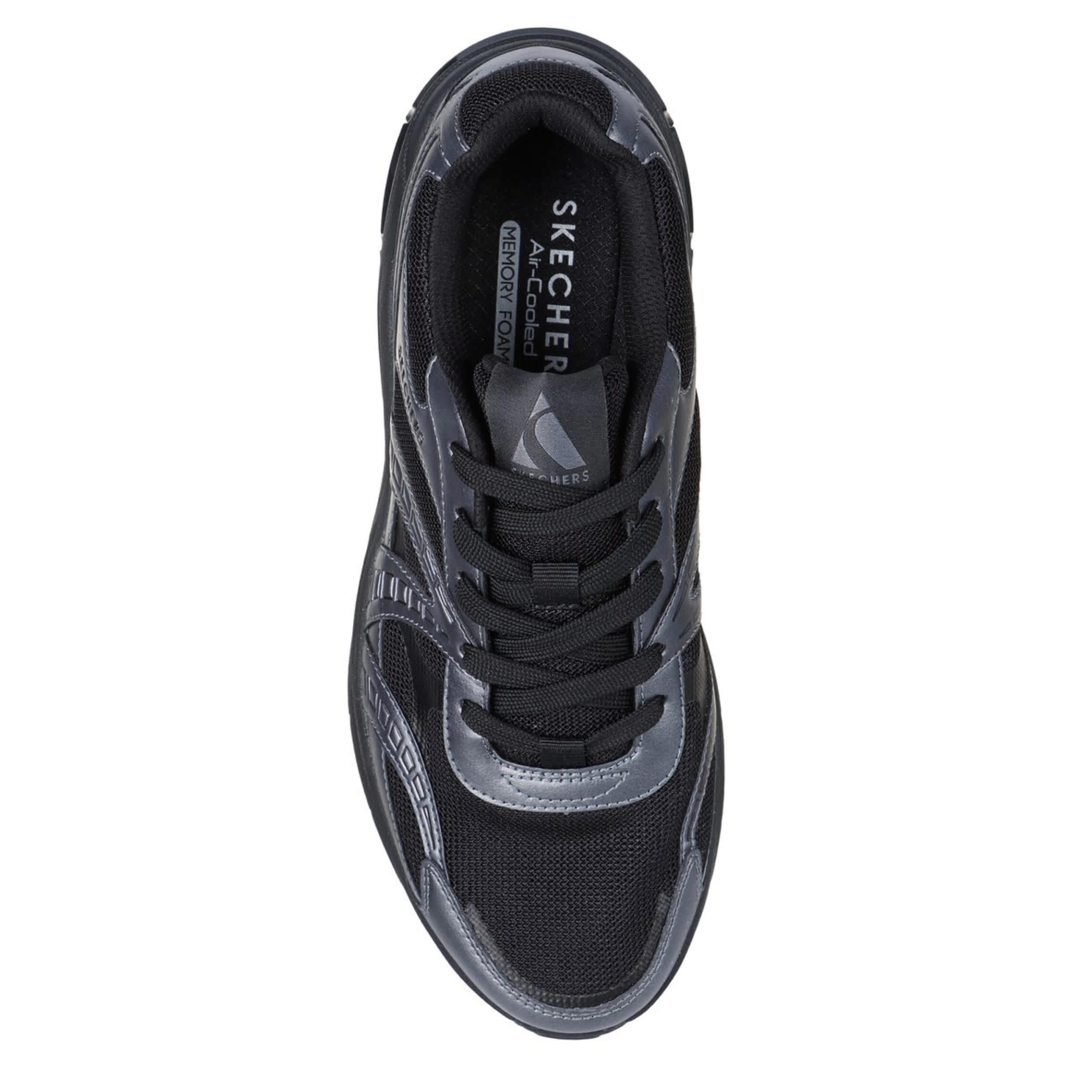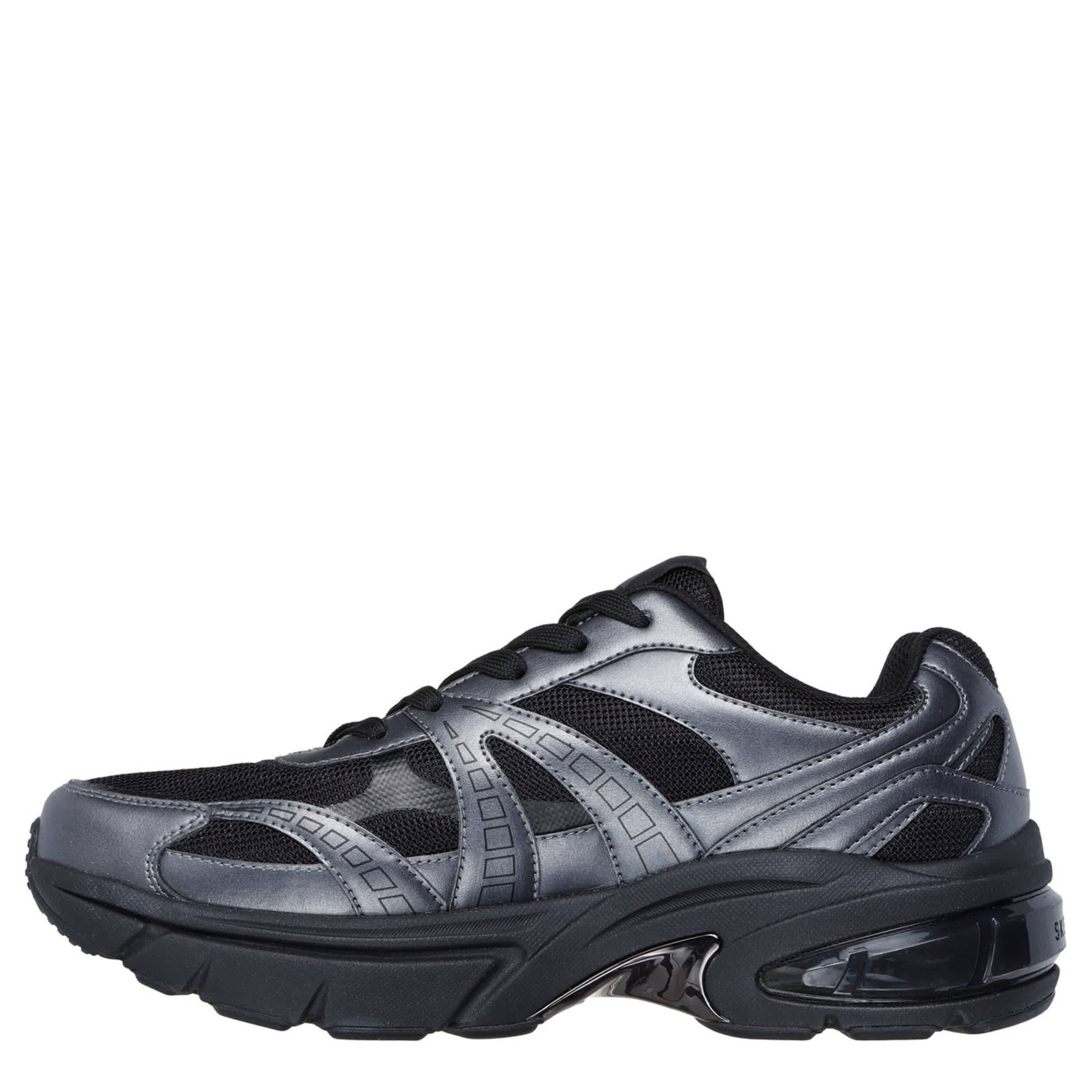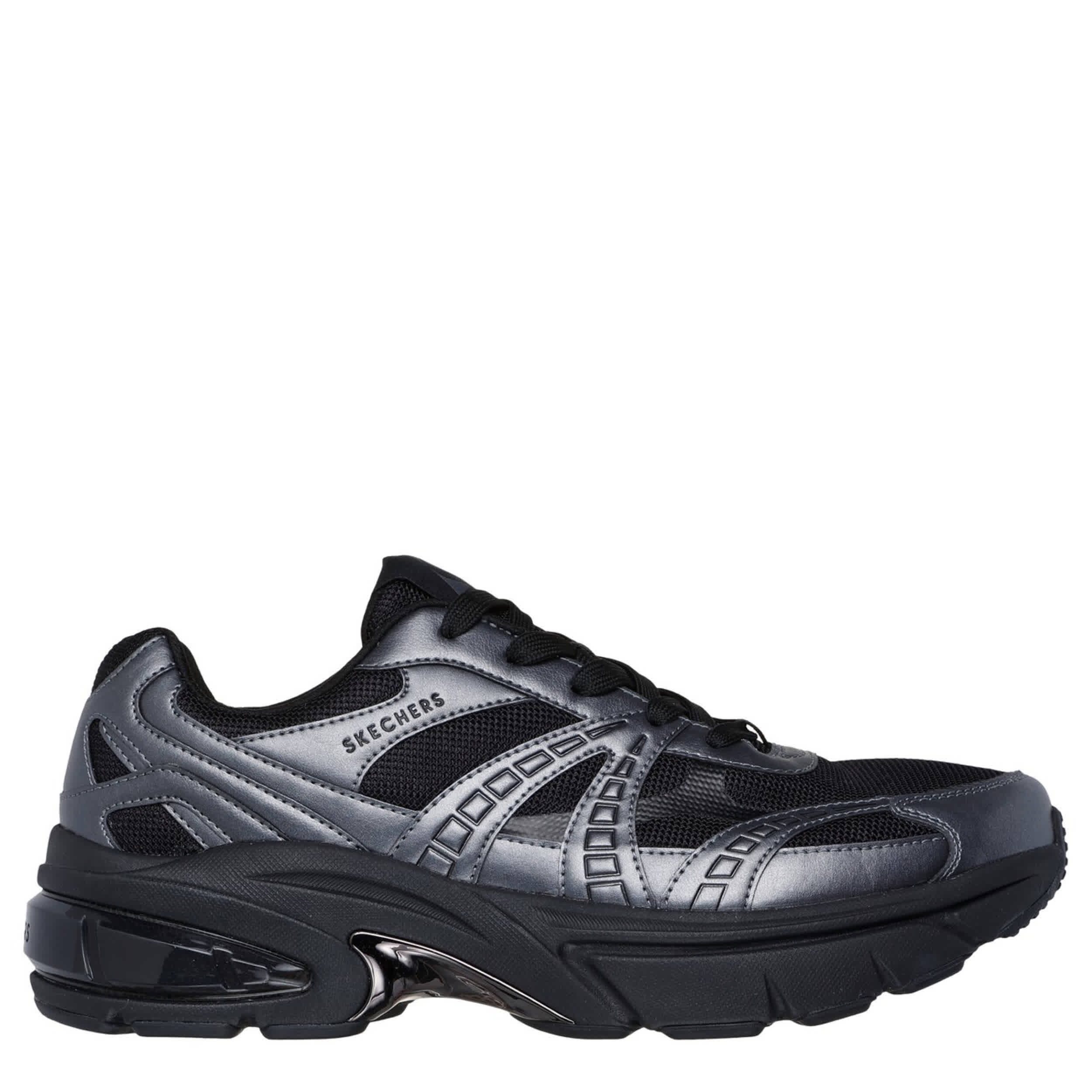 Liven up your look in the Skechers Shadow - Stellar 90 sneaker. Featuring a metallic duraleather & mesh upper with an all-black midsole insert for extra style, this lace-up sneaker is made for the sporty show-off. The Skechers Air-Cooled Memory Foam® insole cushions every step, while the outsole provides flexible traction on any surface.