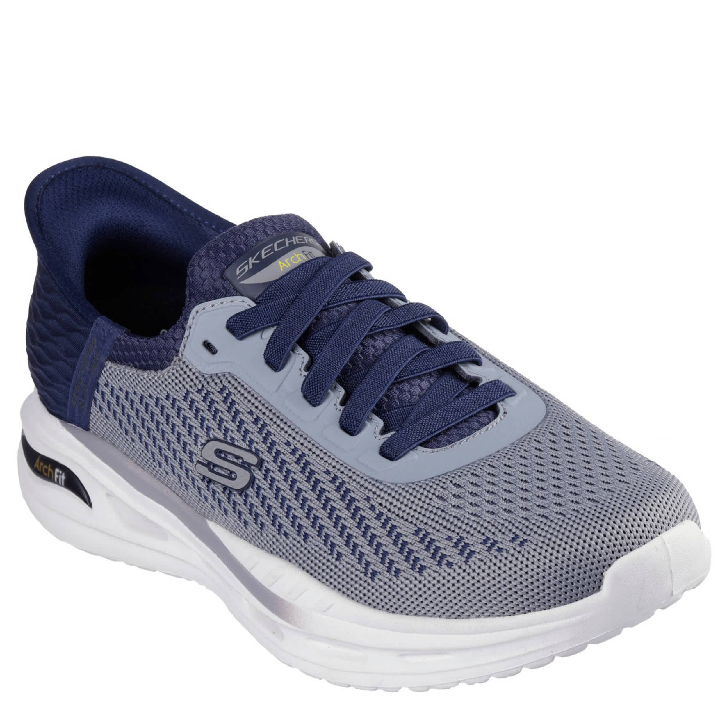 Room to feel the convenience in the Slip-ins® Relaxed Fit®: Arch Fit® Orvan - Drex sneaker from Skechers. With a knitted upper with an exclusive Heel Pillow™ for a secure fit, this stretch-laced shoe is also machine washable. The removable Arch Fit® insole & Glide-Step® midsole provide a soft landing with podiatrist-certified arch support.