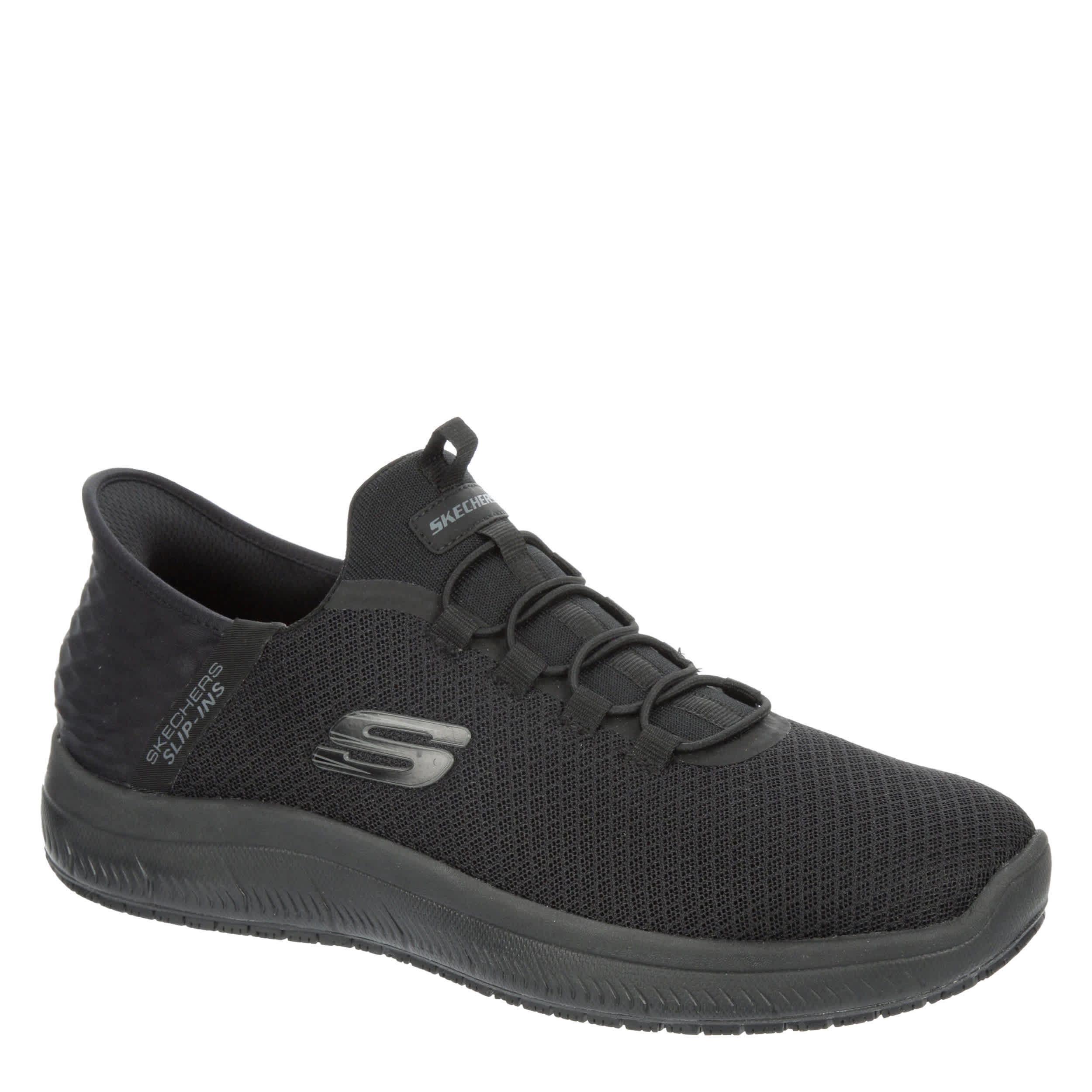 Stay safe on the job in the Skechers Slip-ins: Summits- Colsin men's slip-resistant work shoe. With a knit mesh and synthetic upper featuring stretch laces, this shoe has a molded heel panel and Heel Pillow™ for an easy, secure fit. The Air-Cooled Memory Foam® insole delivers optimal support and cushioning, while the outsole provides excellent traction to prevent slips.