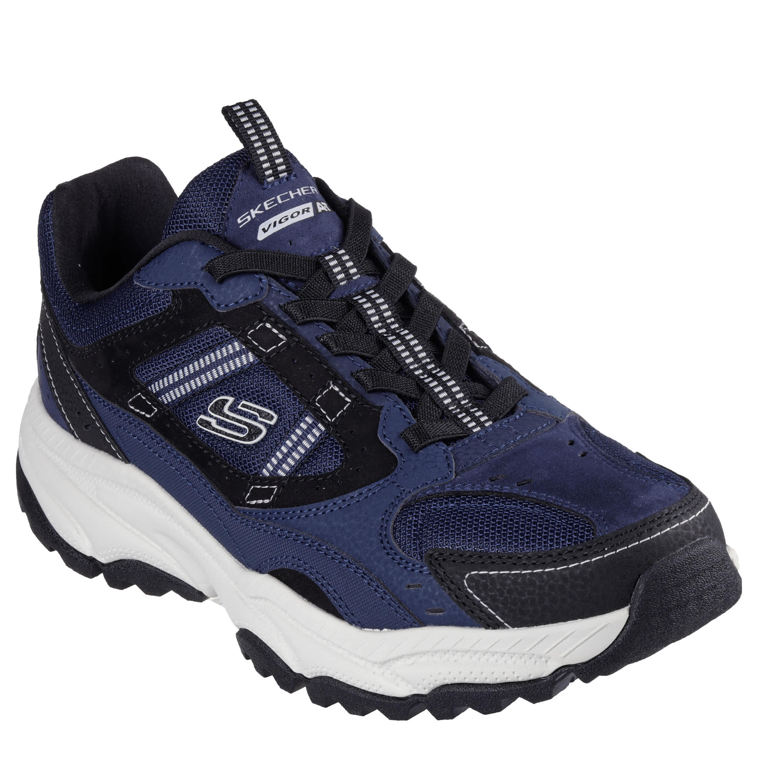 Scale higher in the Vigor AT - Three Corners hiking shoe. With a suede & faux leather upper featuring a trail design for amazing performance, this stretch-laced shoe supports your climb. The Skechers Air-Cooled Memory Foam® insole cushions your every step, while the outsole offers flexible traction.