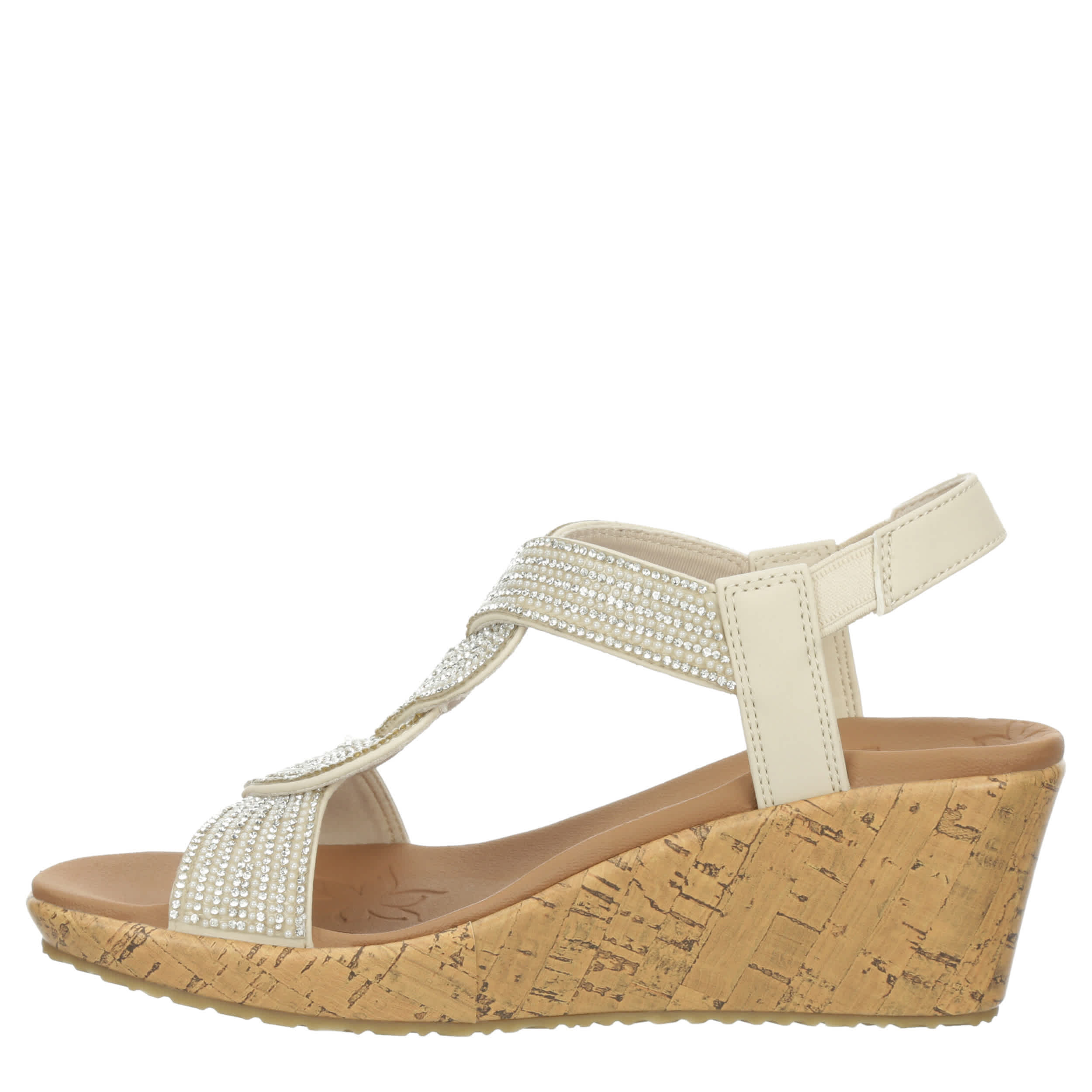 Sundresses and the Beverlee women's wedge sandal from Skechers Cali go together real nice. Featuring a rhinestone-embellished upper with an interwoven design for extra appeal, this stylish sandal is meant for the casual dress up. The Luxe Foam® footbed cushions while the natural cork veneer midsole adds stable height alongside the wedge heel.