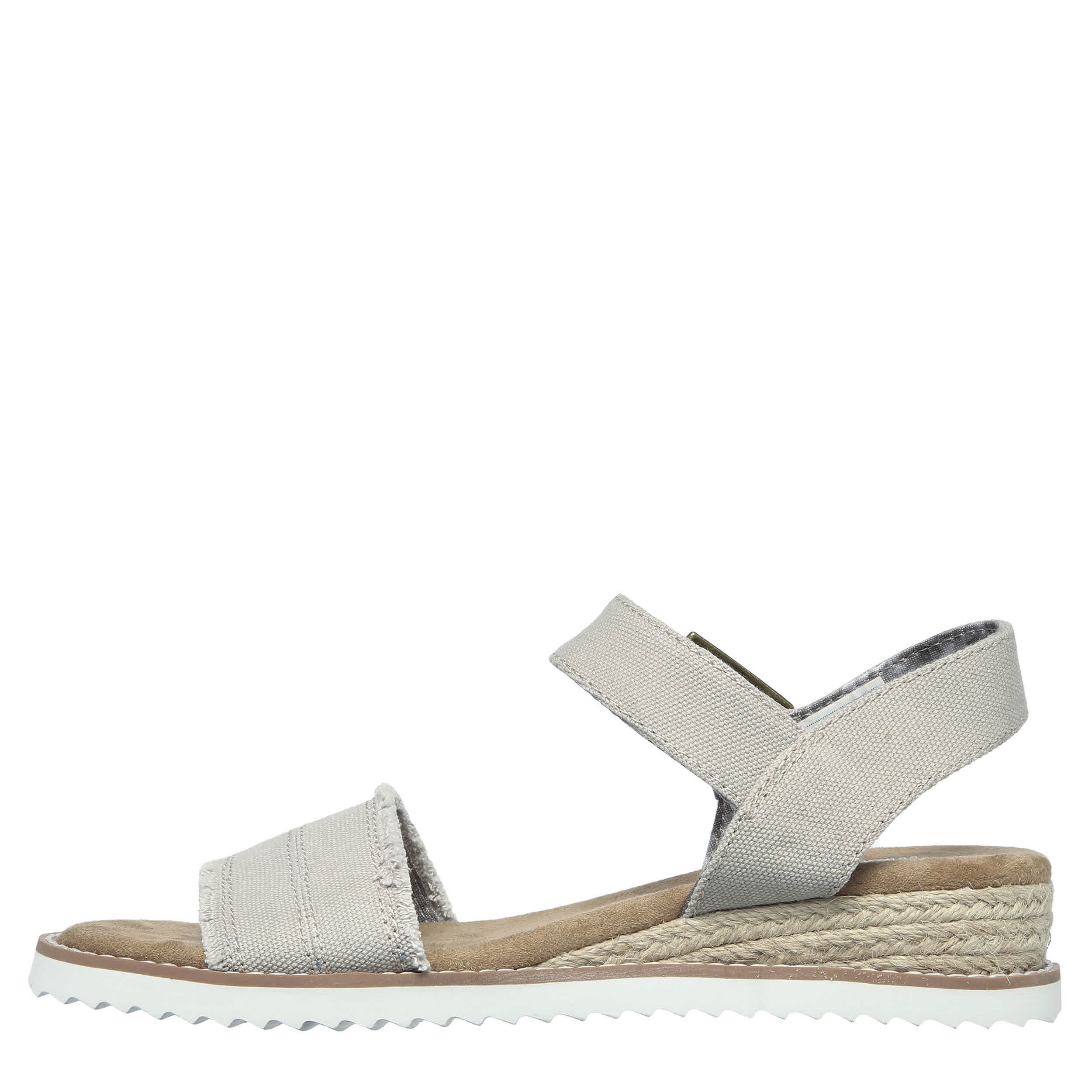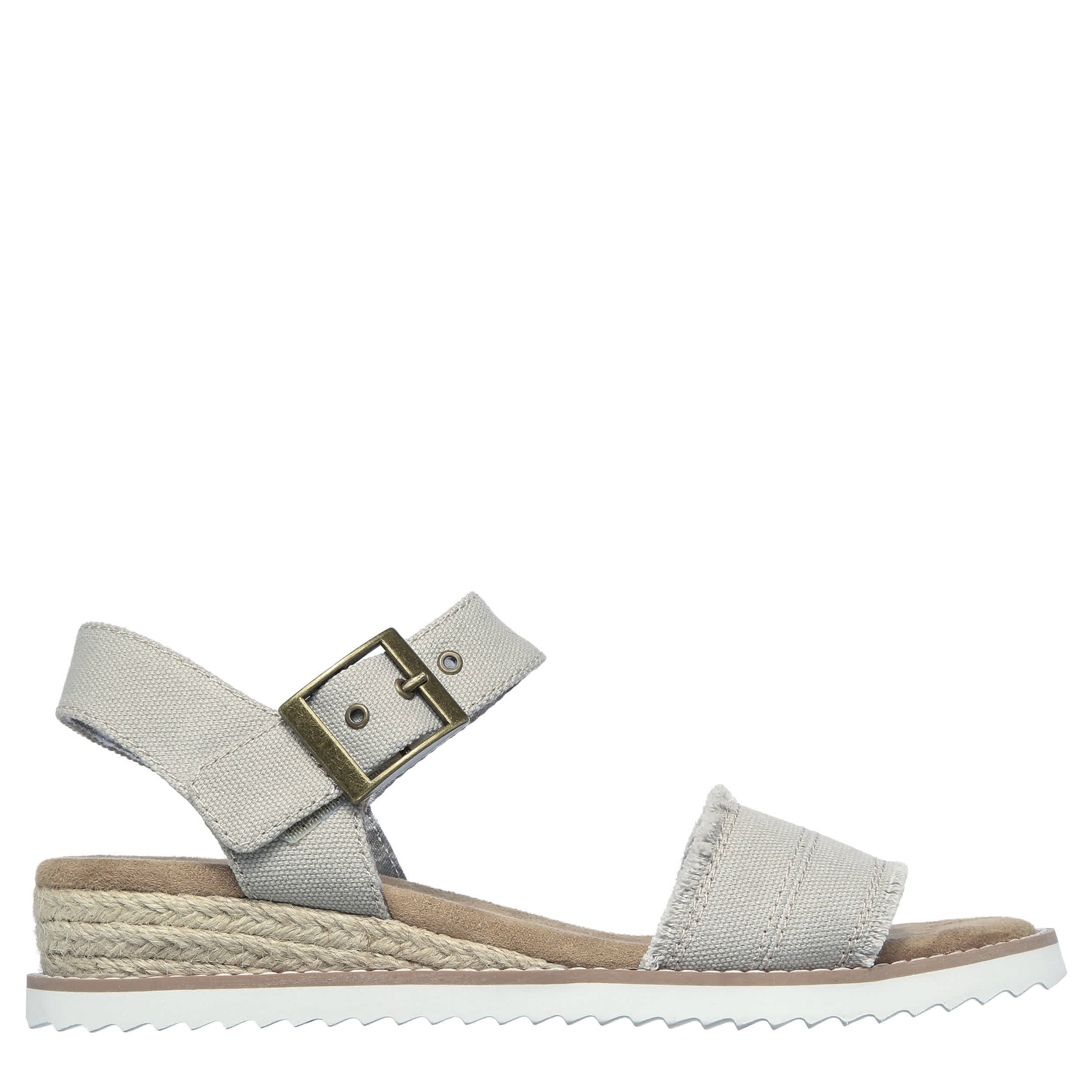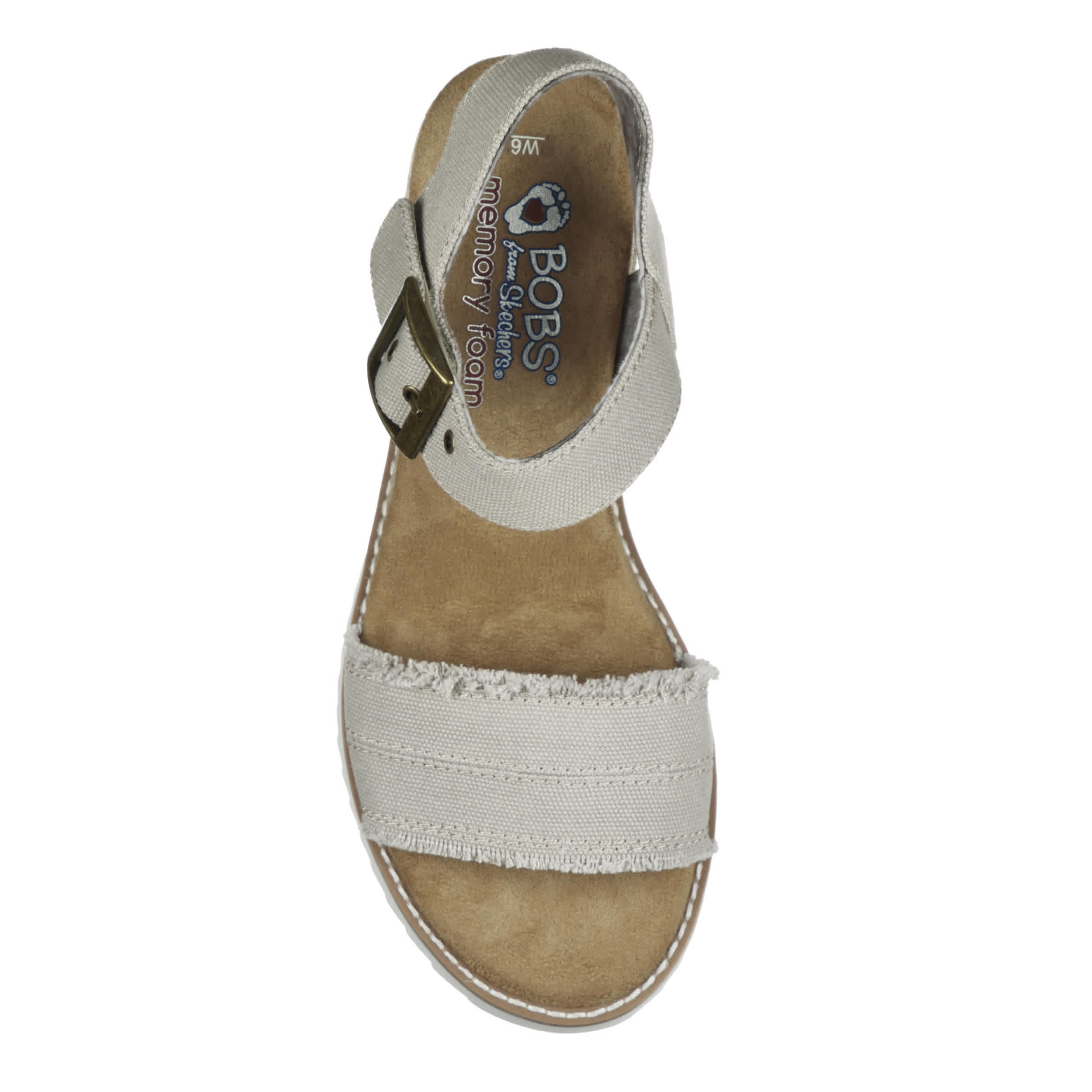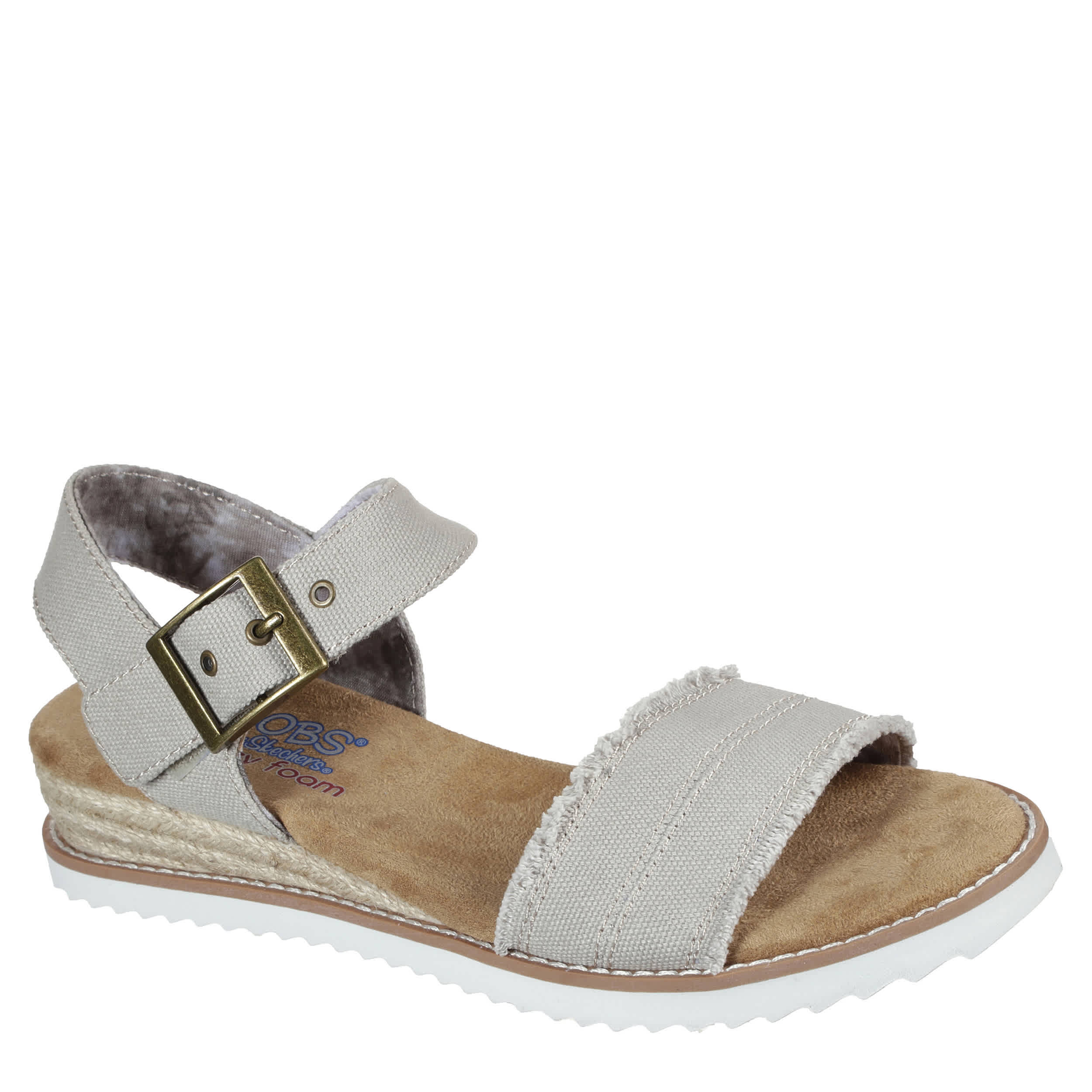 Reign over the sand in the Skechers BOBS Desert Kiss - Adobe Princess women's wedge sandal. With a canvas upper featuring frayed details for extra flair, this ankle strap sandal is breezy and cute for warmer temps. The Memory Foam footbed cushions every step while the Espadrille midsole with low wedge heel and traction outsole boost your comfort.