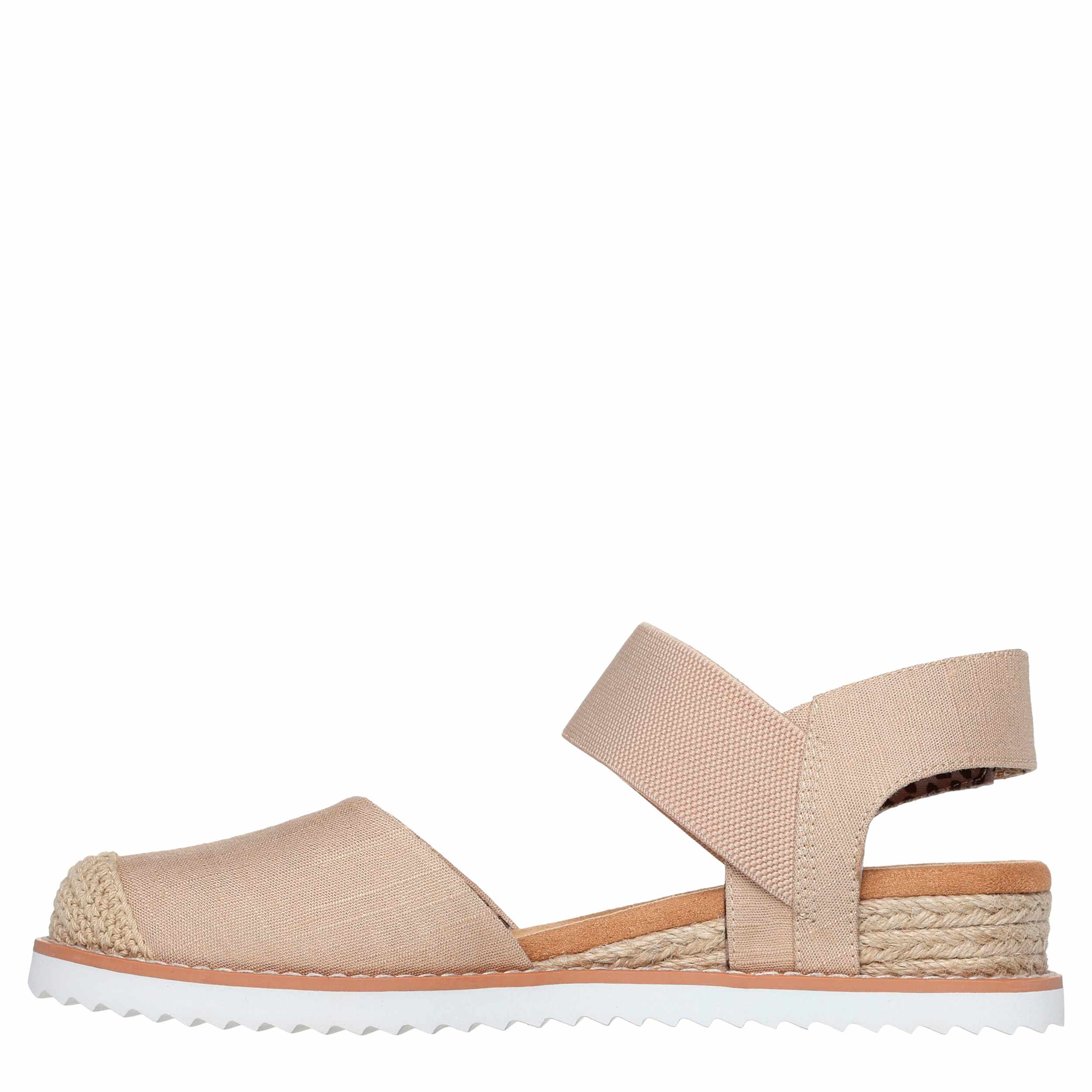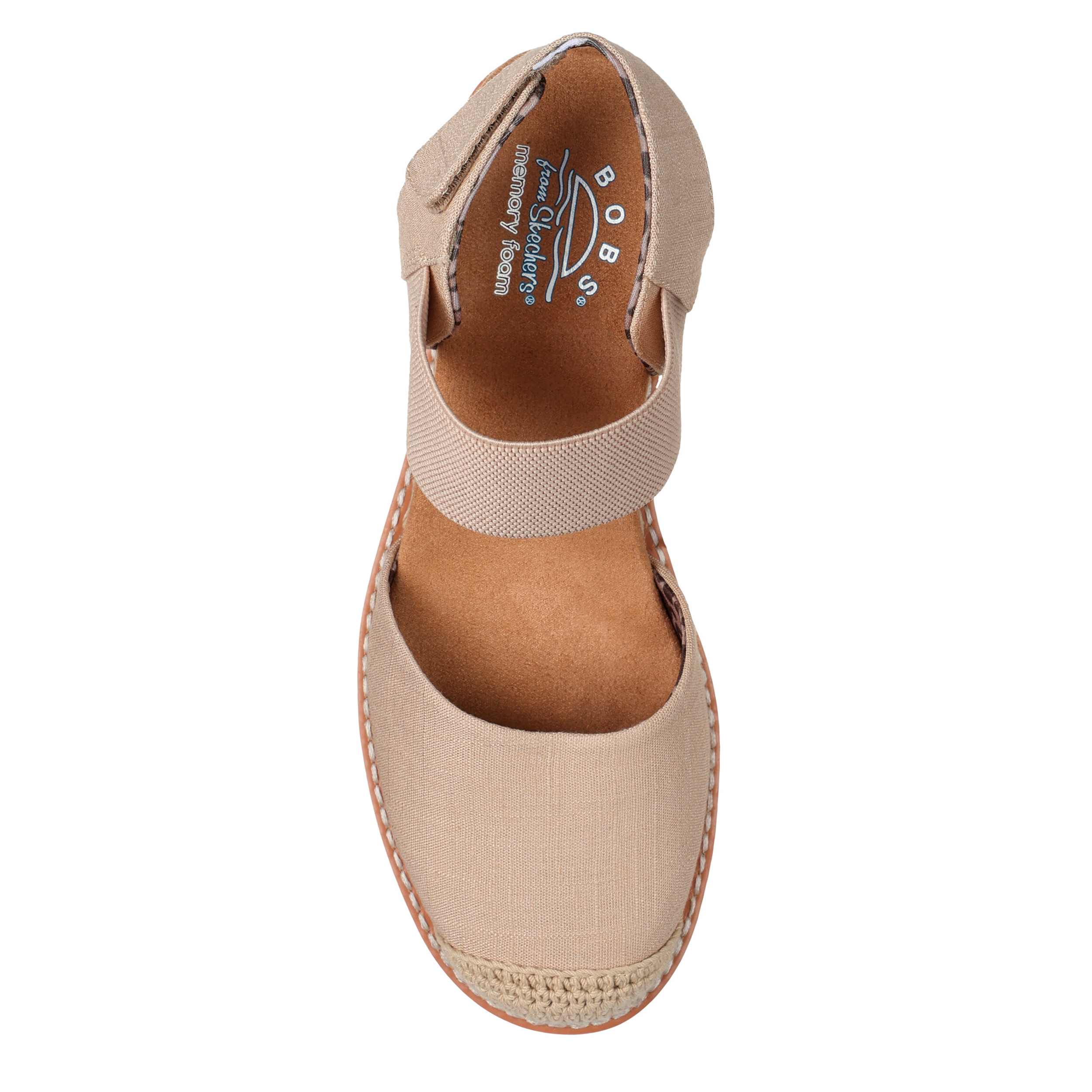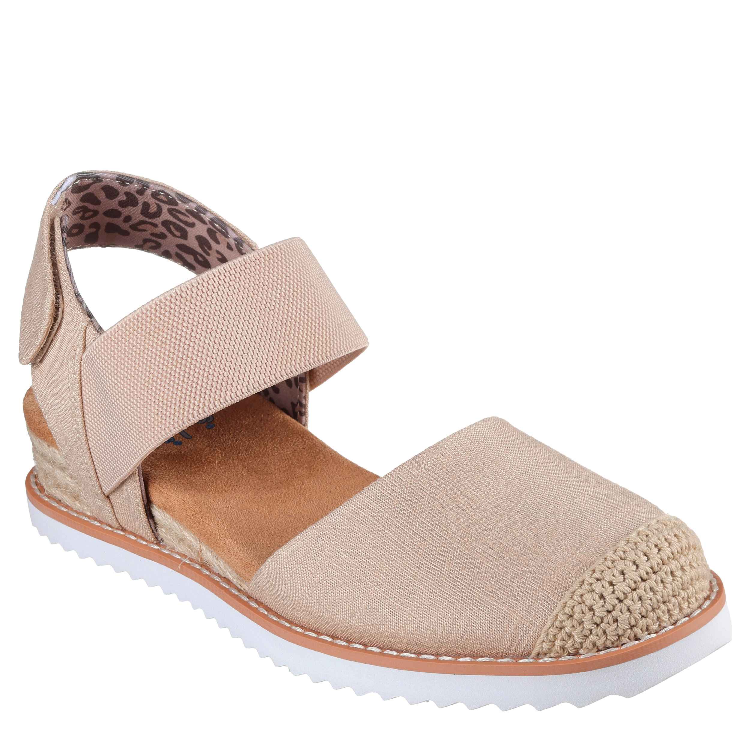Explore more of the outdoors in the Skechers BOBS Desert Kiss - Sun Shining women's sandal. With a woven fabric upper featuring a cap toe made from crochet knit for extra flair, this gore strap sandal is breezy and cute for beach, city or light walks. The Skechers Memory Foamâ„¢ footbed cushions every step while the Espadrille midsole with low wedge heel and traction outsole boost your comfort.