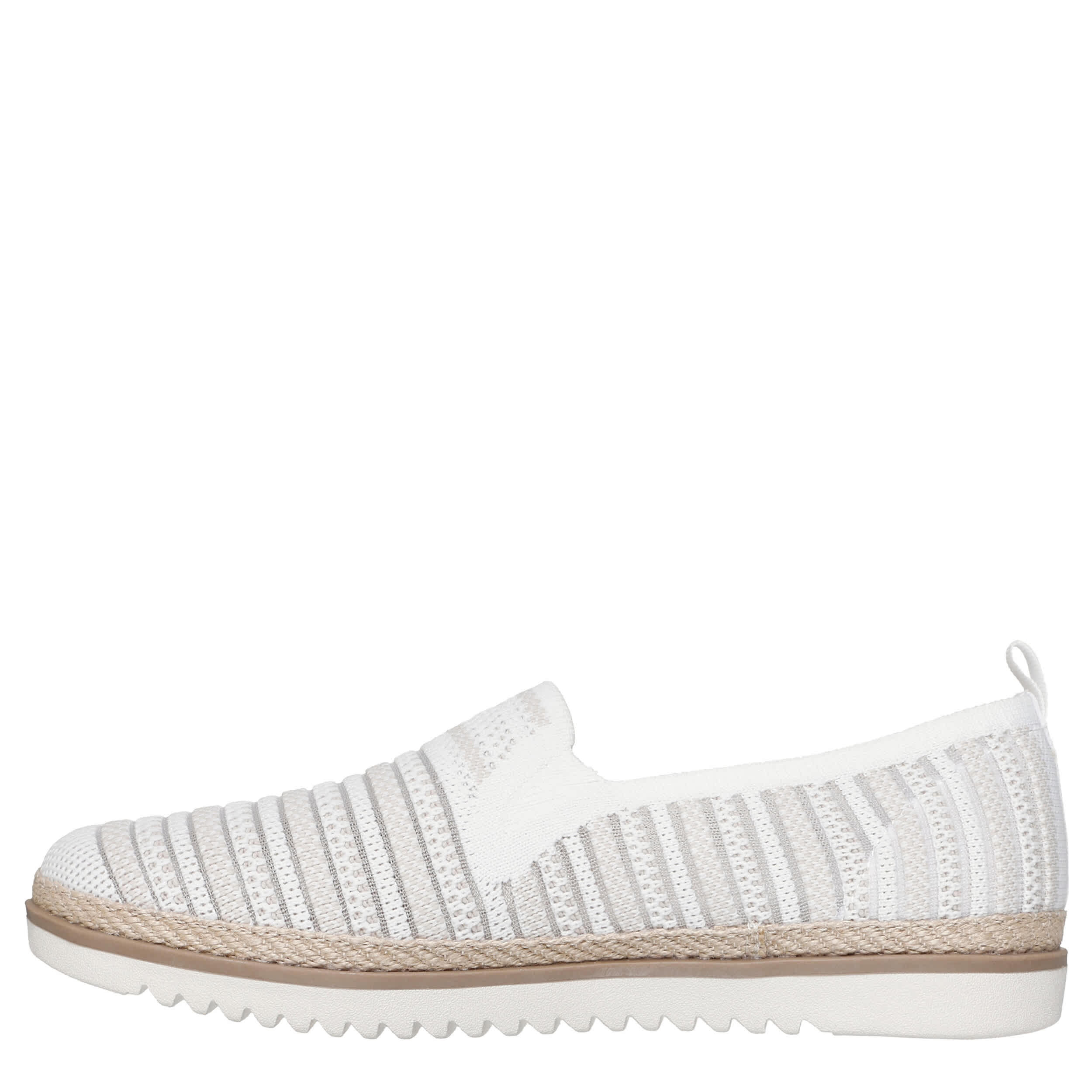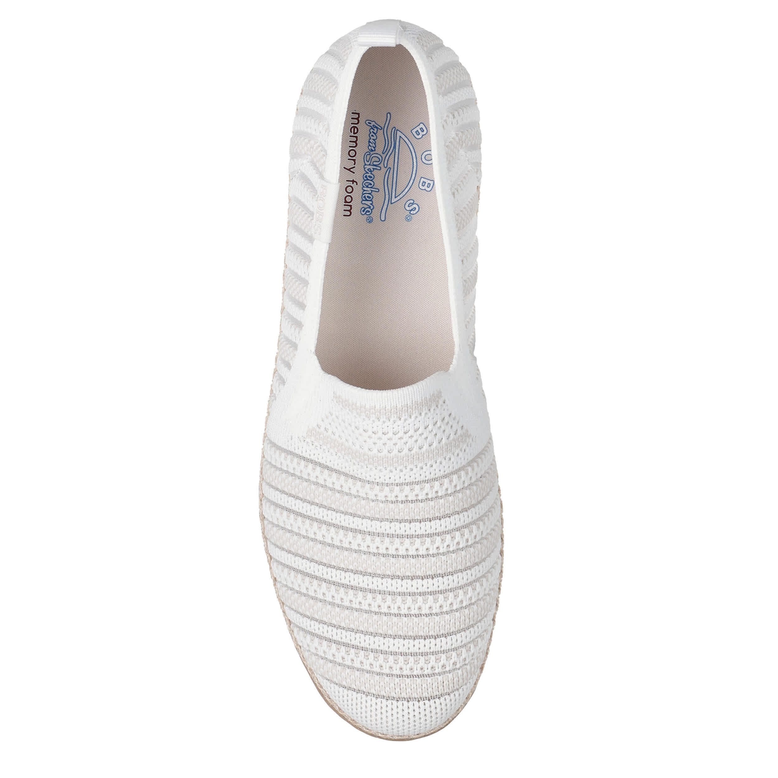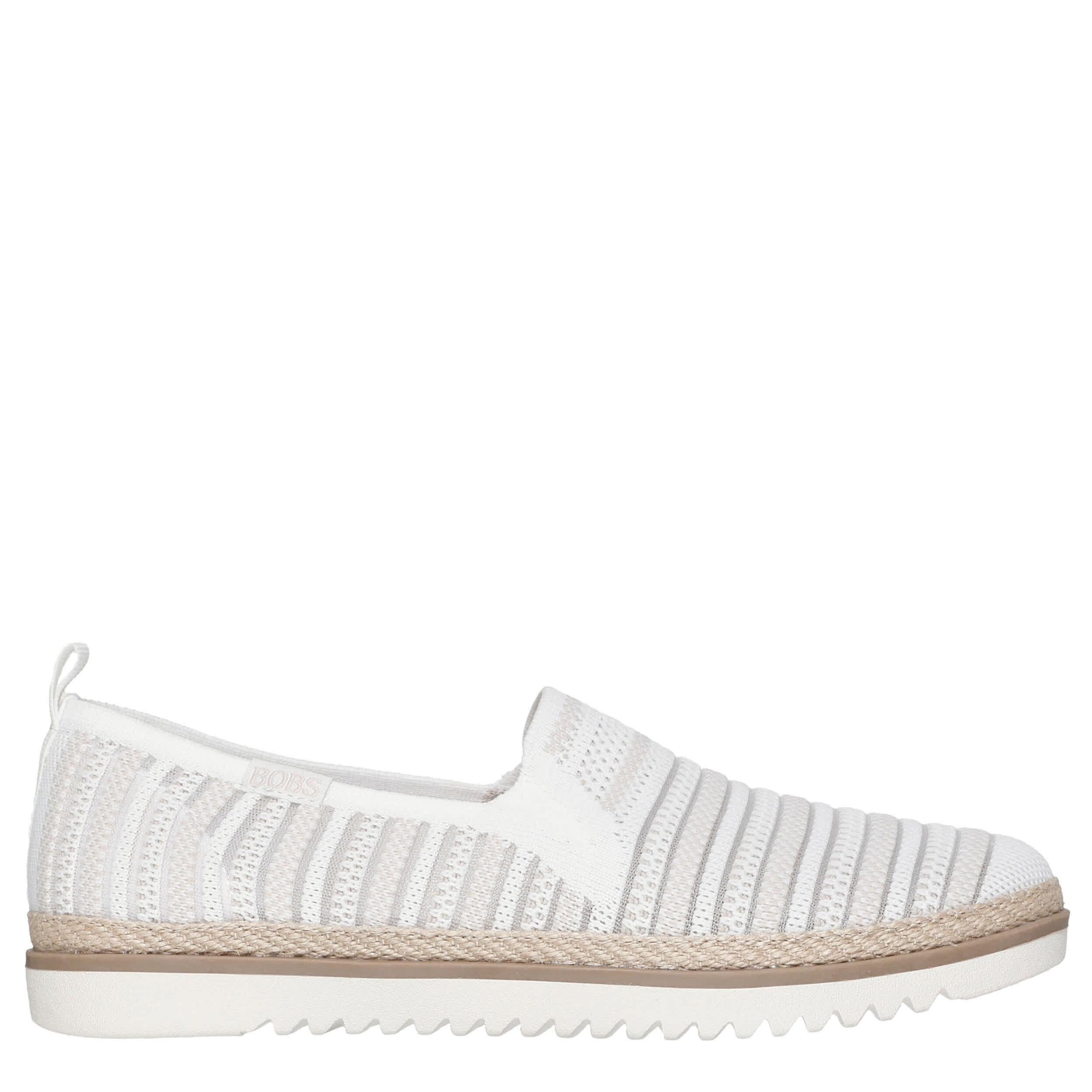 Make your style comfy boho in the BOBS® from Skechers® Flexpadrille LO - So Chic women's slip-on sneaker. With a monochromatic upper featuring stripes and a jute trim at the midsole, this slip-on shoe is a great addition to your everyday style with easy entry twin gore panels. The Skechers Memory Foam™ insole cushions every step while the flexible outsole adds sawtooth traction to your travels.